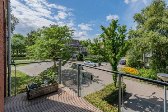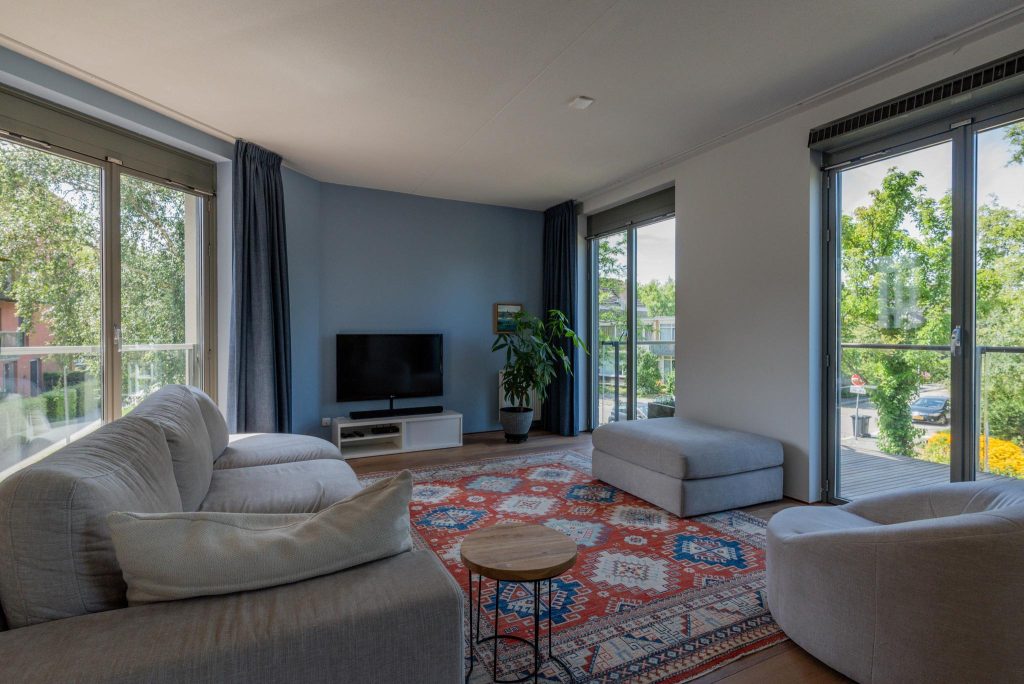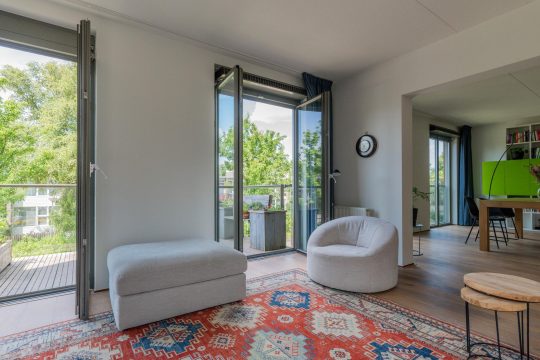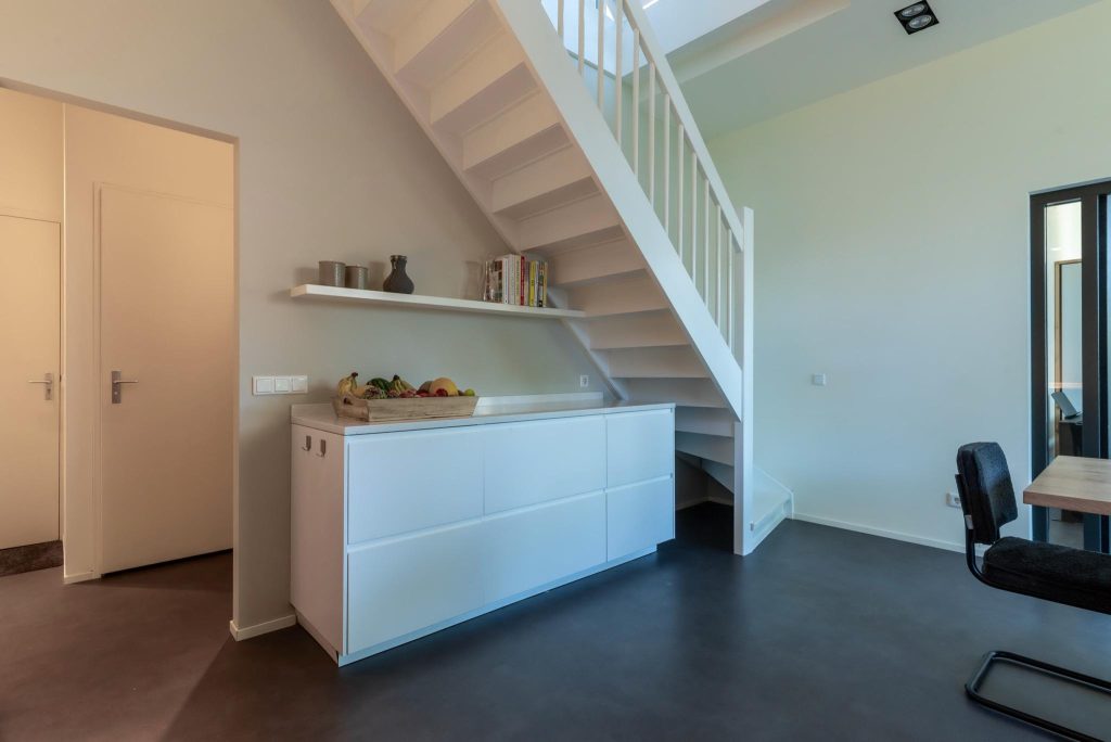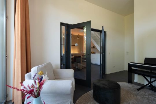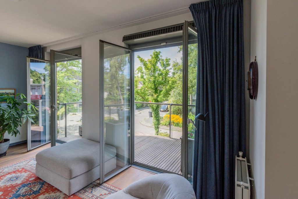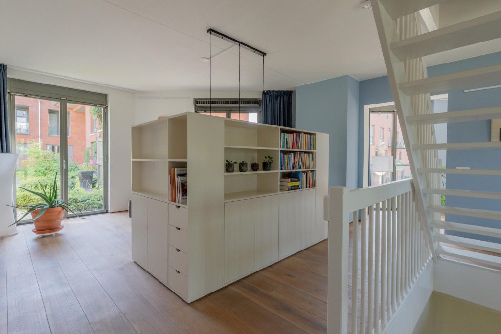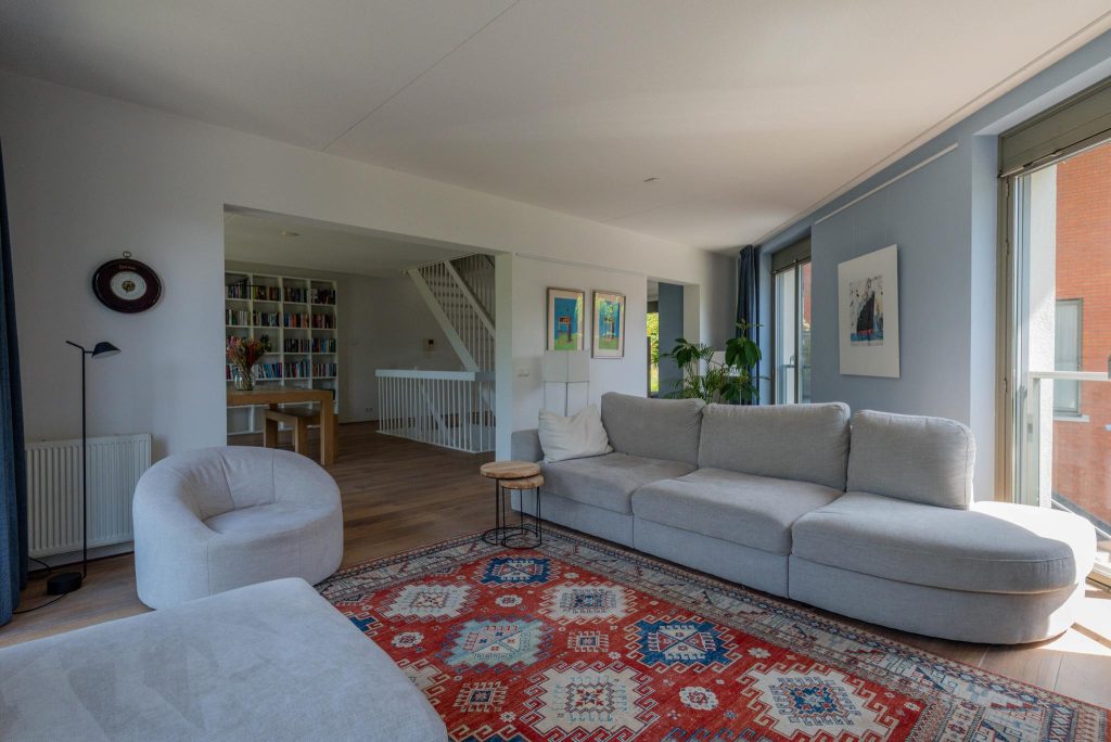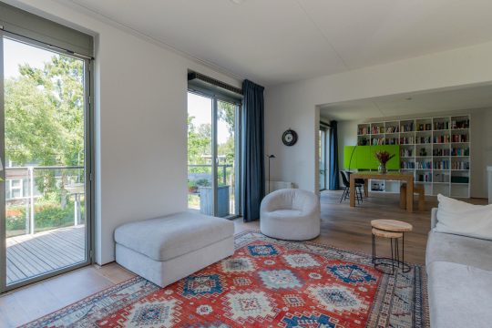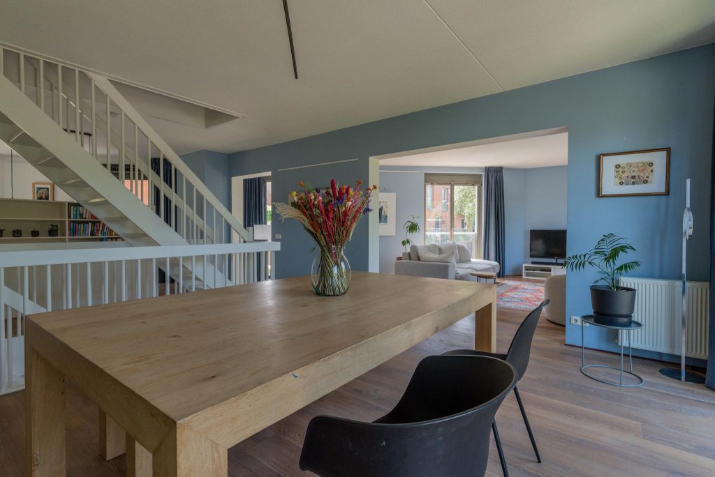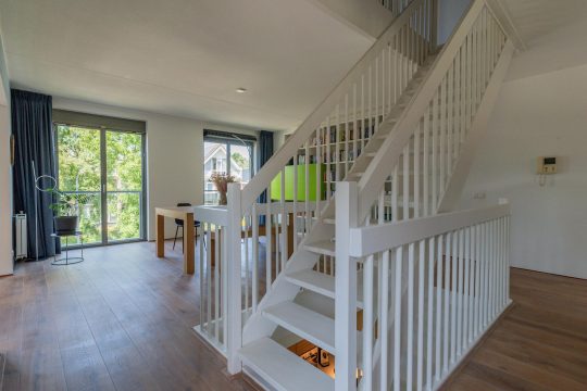 Vanuit de woonkeuken de opgang naar de eerste verdieping. Deze woonverdieping van bijna 82 m² heeft veel lichtinval: er zijn maar liefst 8 paar openslaande deuren. Twee paar openslaande deuren geven toegang tot het balkon van 8 m². Het glazen balkon met houten vlonders is gelegen op het noordwesten en dat betekent met name de middag- en avondzon, maar ook is de tuin en de gezamenlijke binnentuin van de VvE vanuit deze woonverdieping toegankelijk.