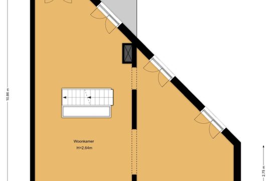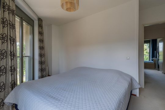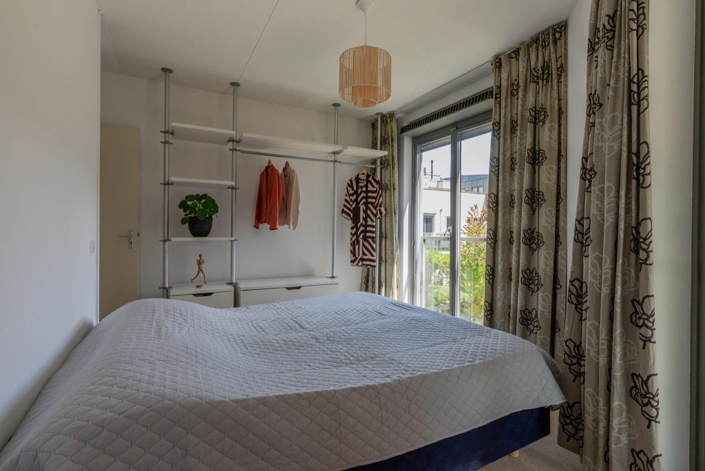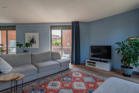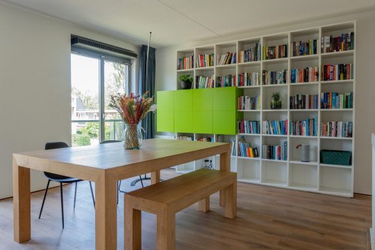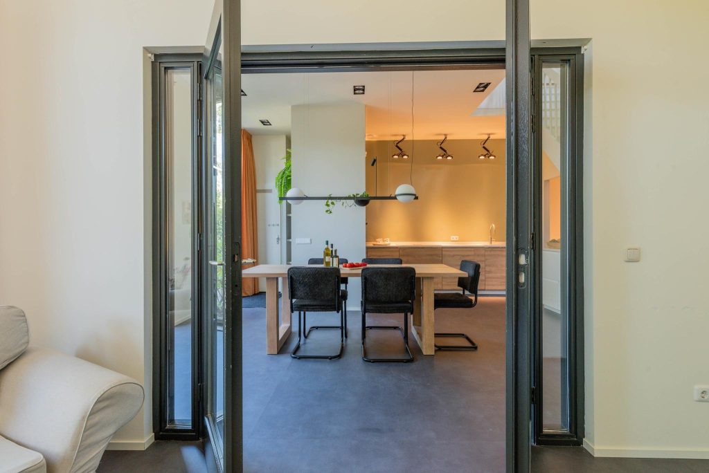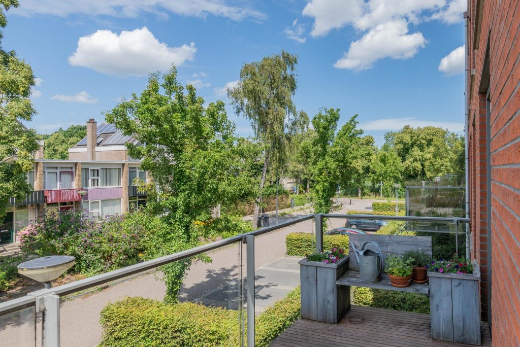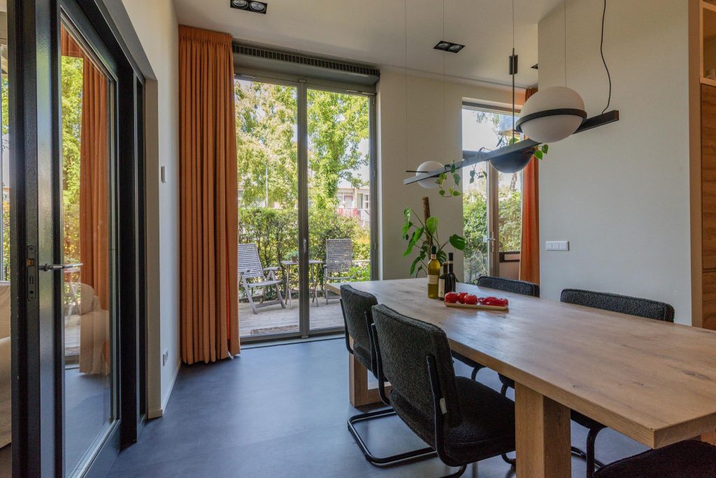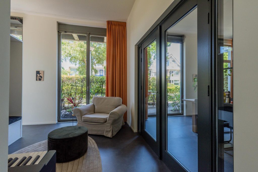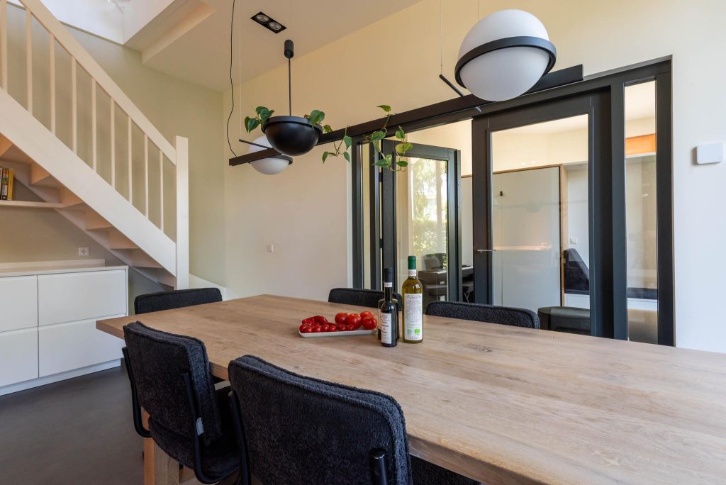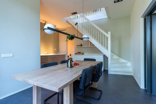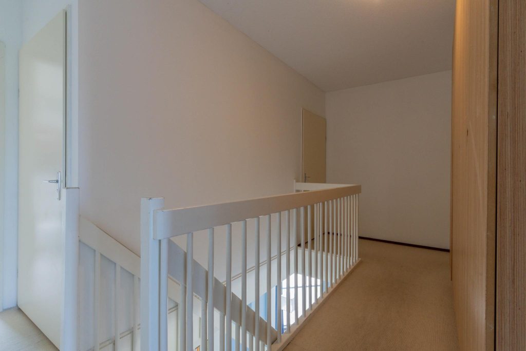 Vanuit de woonkeuken de opgang naar de eerste verdieping. Deze woonverdieping van bijna 82 m² heeft veel lichtinval: er zijn maar liefst 8 paar openslaande deuren. Twee paar openslaande deuren geven toegang tot het balkon van 8 m². Het glazen balkon met houten vlonders is gelegen op het noordwesten en dat betekent met name de middag- en avondzon, maar ook is de tuin en de gezamenlijke binnentuin van de VvE vanuit deze woonverdieping toegankelijk.