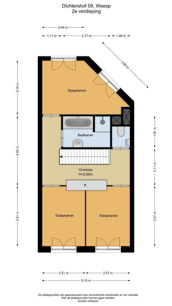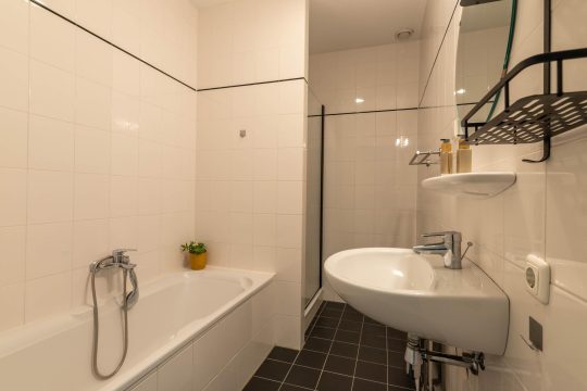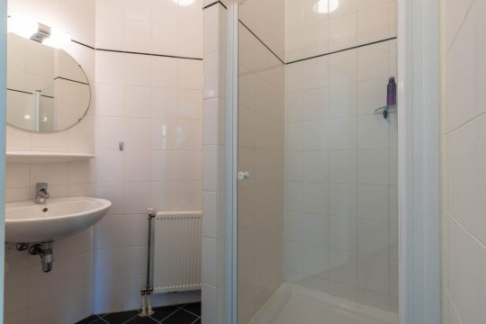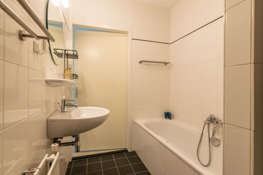 Ruime overloop met vaste kasten en een separaat toilet met fontein. Twee slaapkamers aan de voorzijde en een ruime derde slaapkamer aan de achterzijde. Alle slaapkamers zijn voorzien van openslaande deuren (Frans balkons). Vanaf de overloop is de tweede badkamer met ligbad, douche en wastafel toegankelijk.