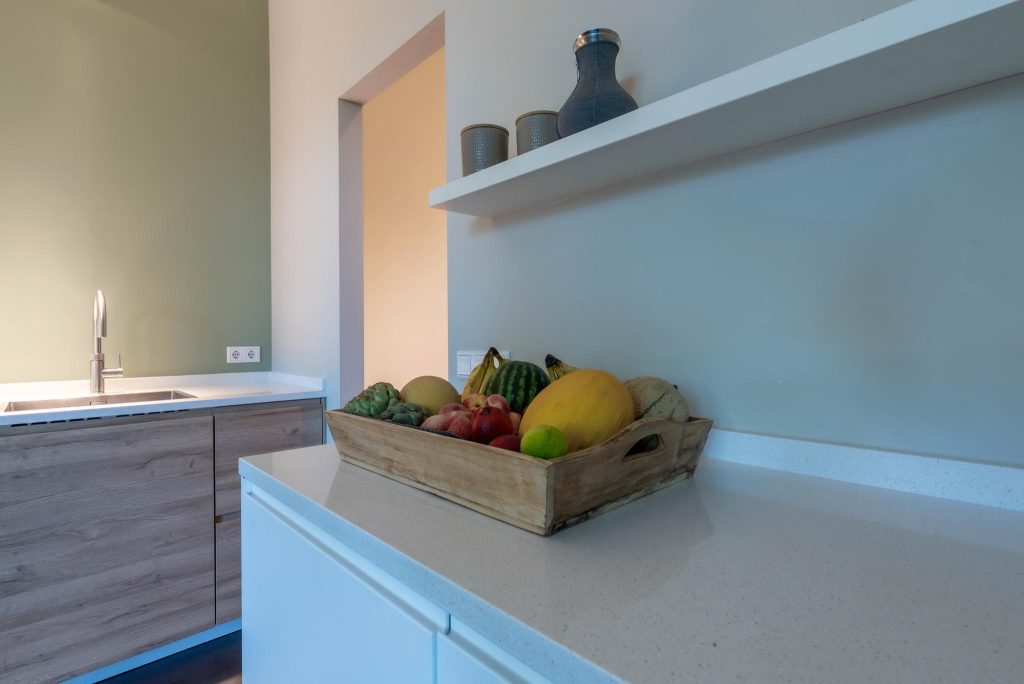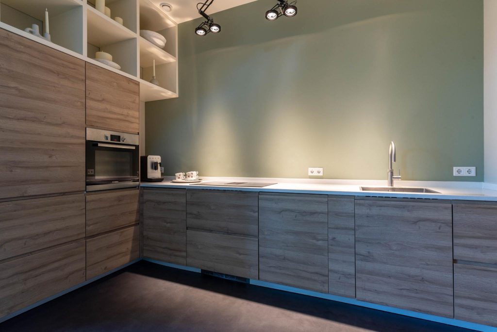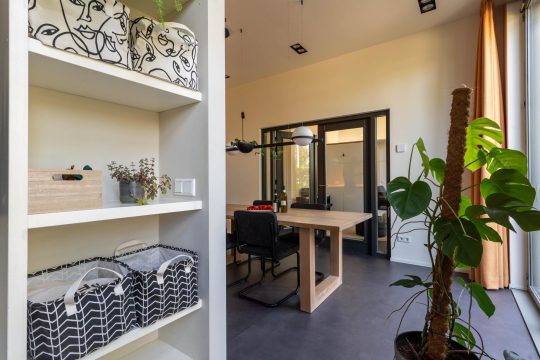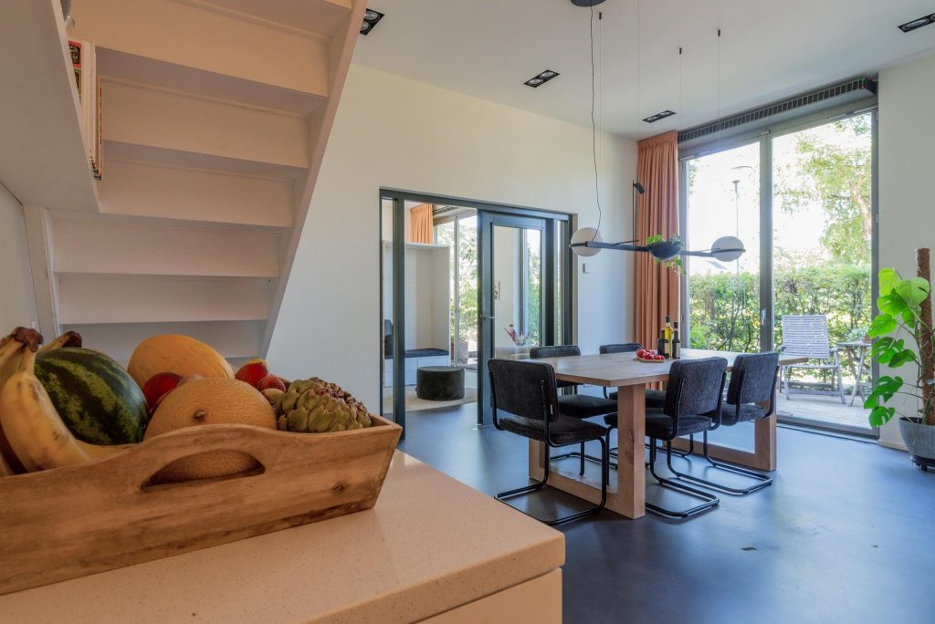 Entree van de woning via de voortuin, met de meterkast en de op maat gemaakte garderobehoek, grote woonkeuken met openslaande deuren naar de tuin. De keuken (2021) is voorzien van de volgende inbouwapparatuur: inductiekookplaat met geïntegreerde afzuigkap, kokend waterkraan (Quooker), vaatwasser, oven, koelkast en het werkblad is van composiet. Verder is er in de woonkeuken een mooi meubel gemaakt met veel opbergruimte. Vanuit de keuken via een tussenhal kom je bij het toilet met fontein en bereik je ook de grote bijkeuken met de opstelling van de CV ketel, mechanische ventilatie box en de wasmachine/droger aansluiting. Vanuit de tussenhal is ook de royale inpandige berging toegankelijk en de toegang naar de parkeergarage.