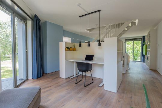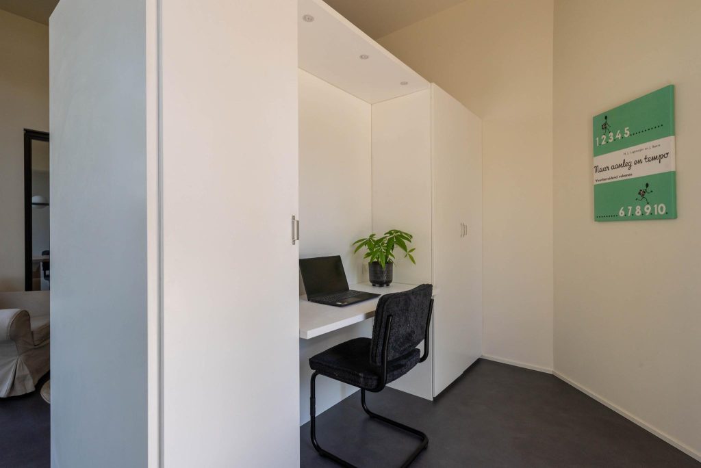 Via de woonkeuken is via 2 openslaande deuren met glas, de slaap/studeer/werk kamer te bereiken. Deze ruimte kan geheel naar eigen wens worden gebruikt. Ideaal is ook de eerste badkamer die zich hier bevindt met douche en wastafel. En via een aparte hal bereik je weer de bijkeuken en het toilet van de woning.