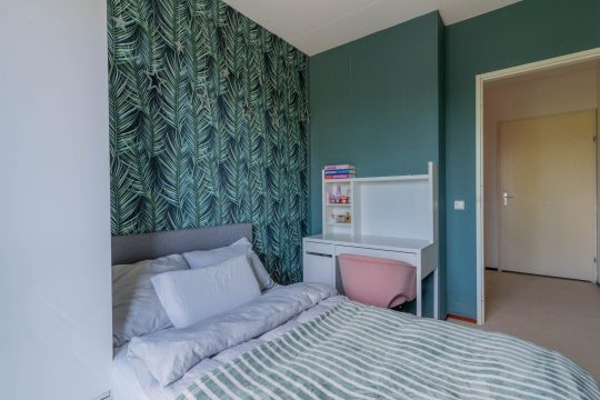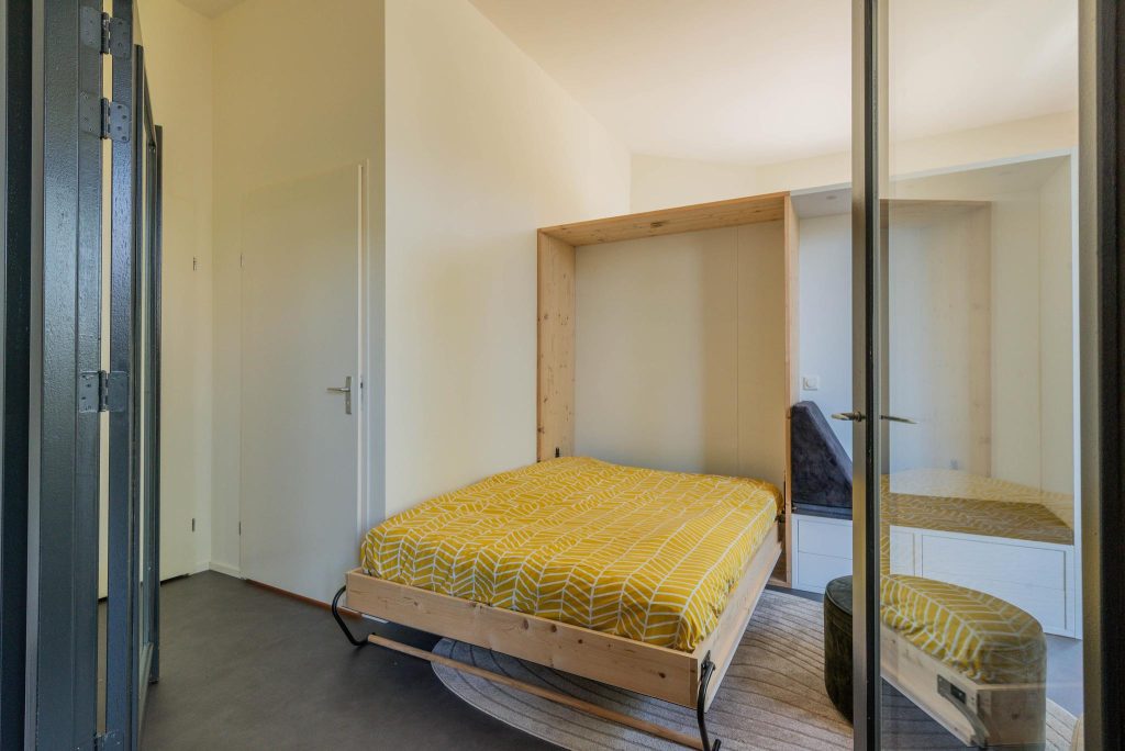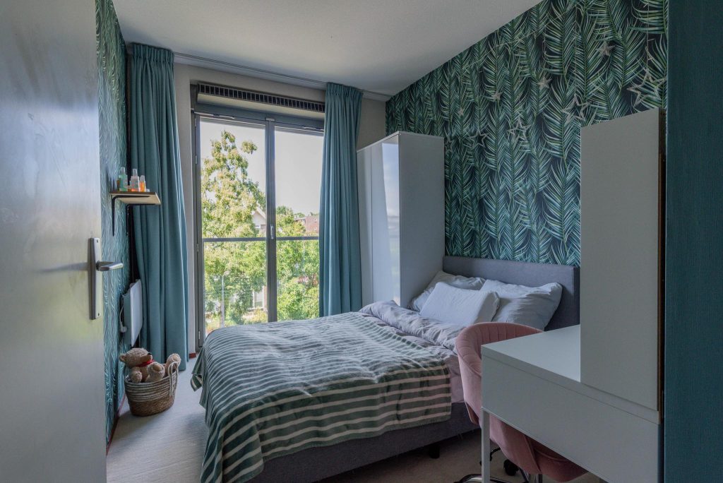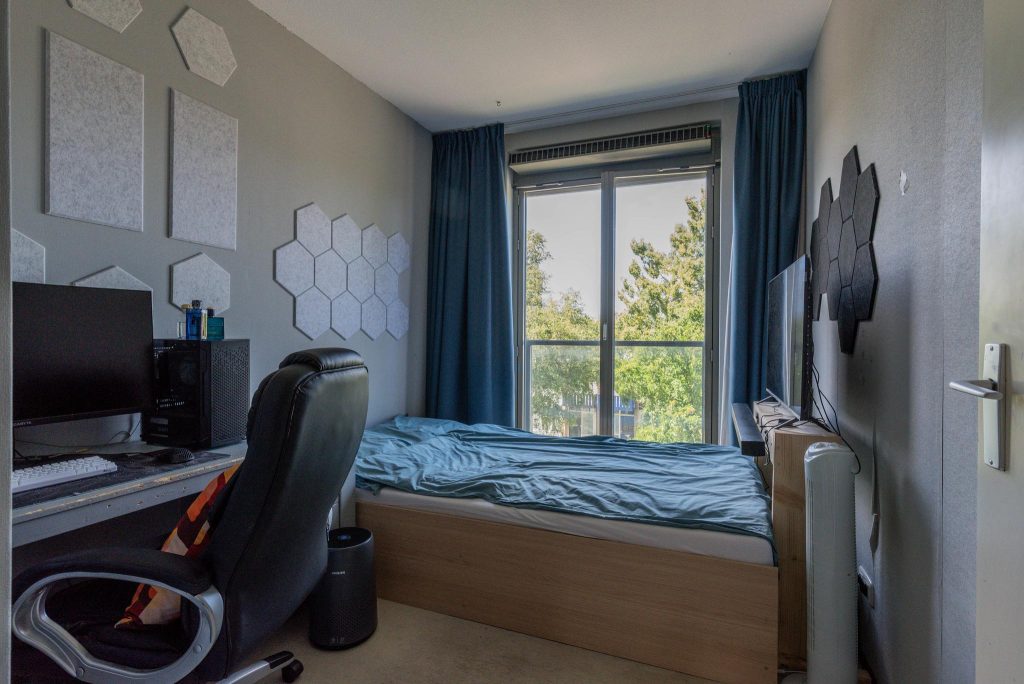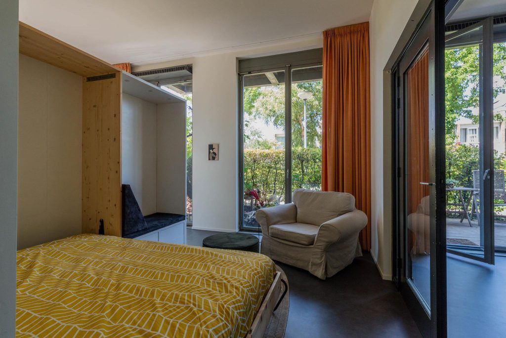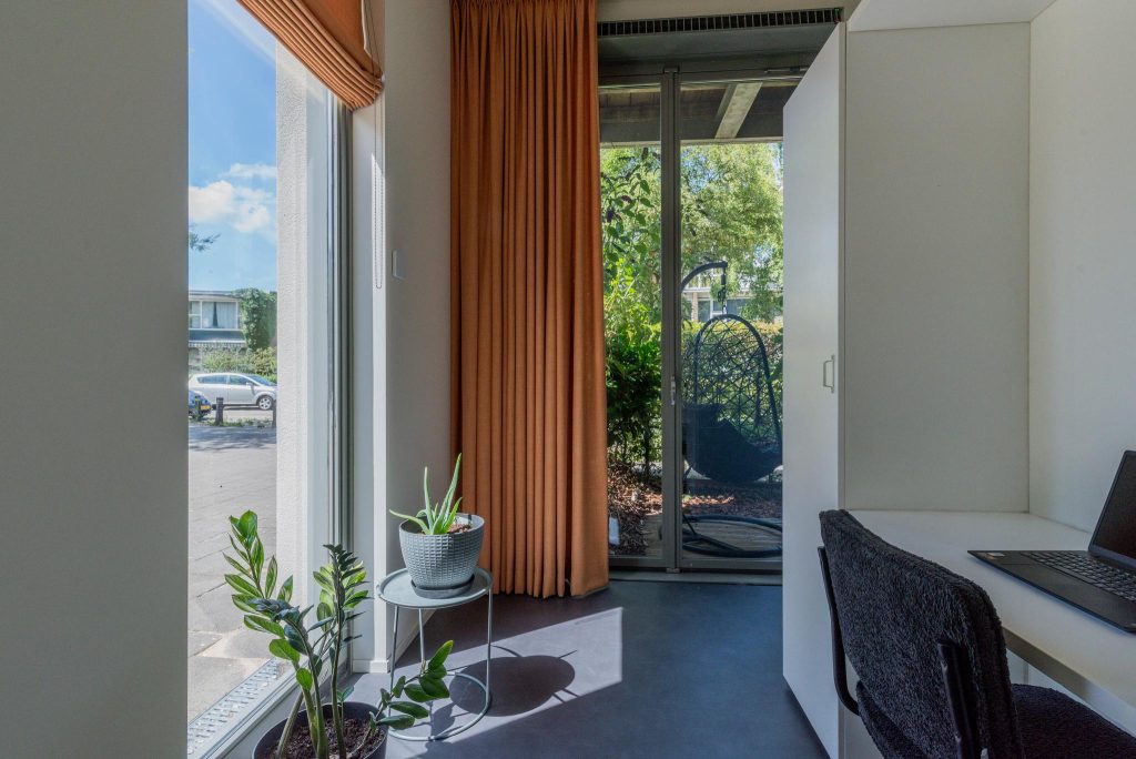 Deze slaap/studeer/werk kamer heeft 2 paar openslaande deuren naar de tuin. In de tuin zit je heerlijk vrij door de groene haag rondom.