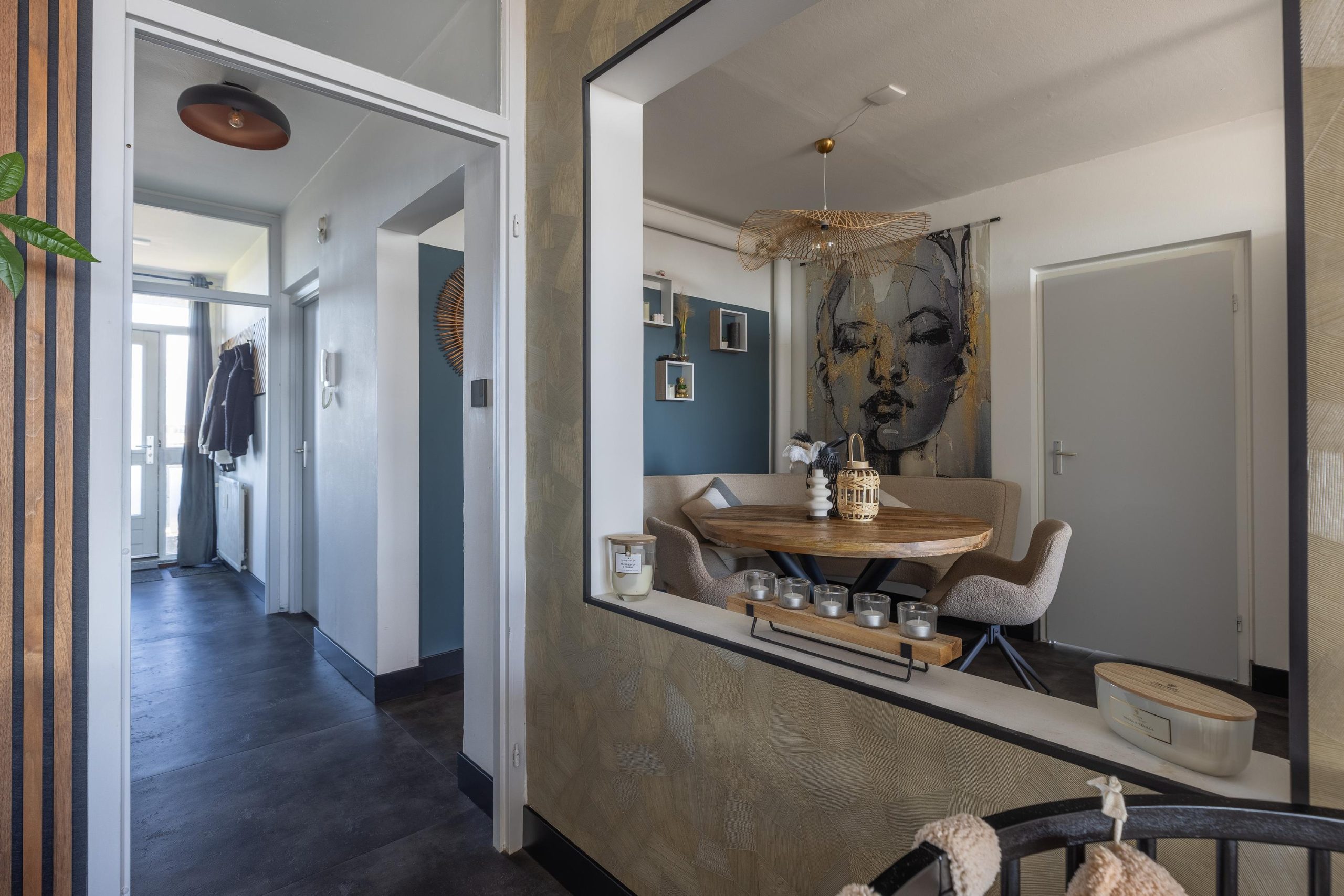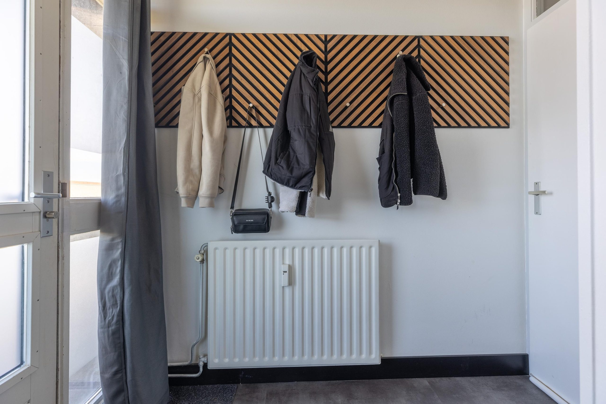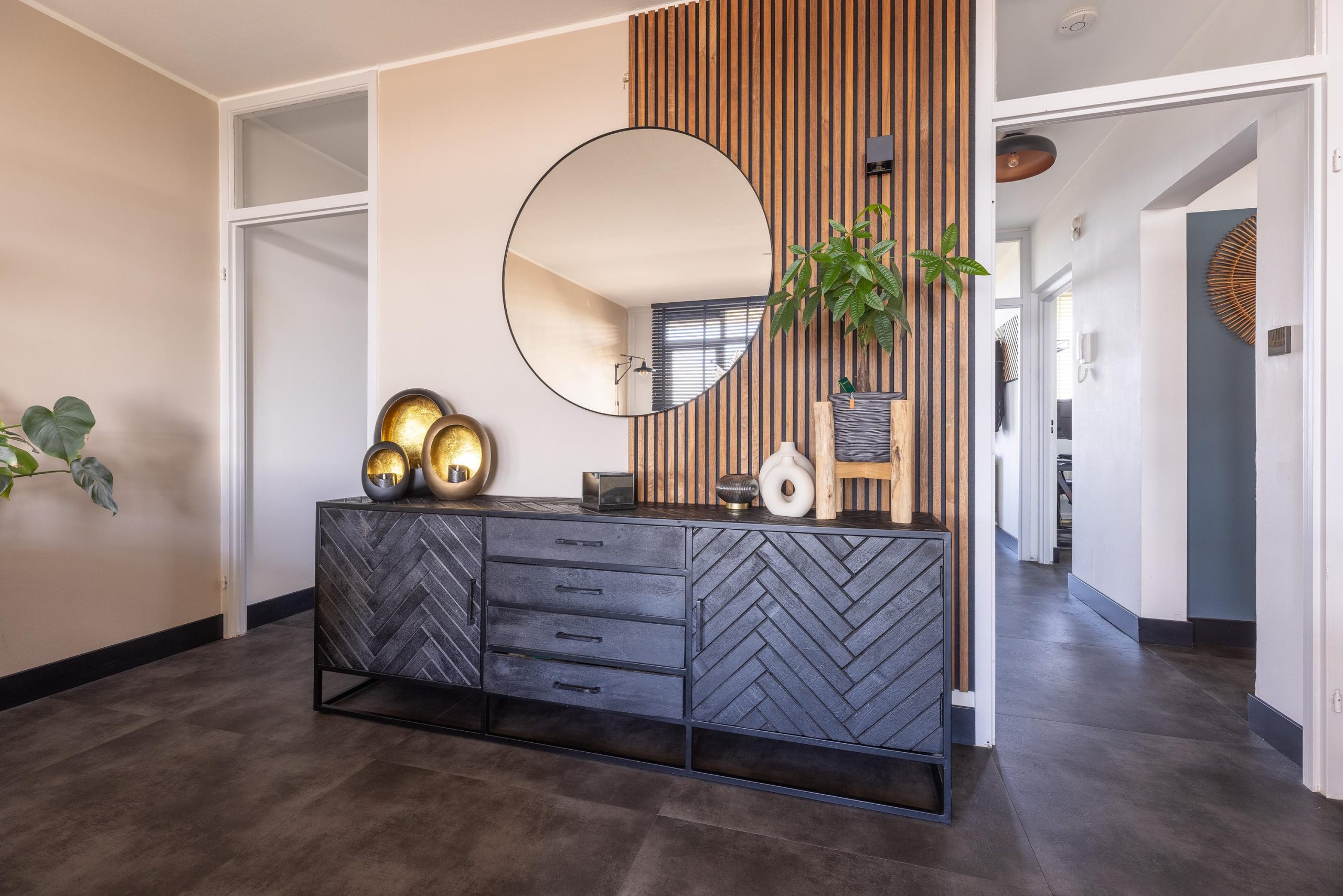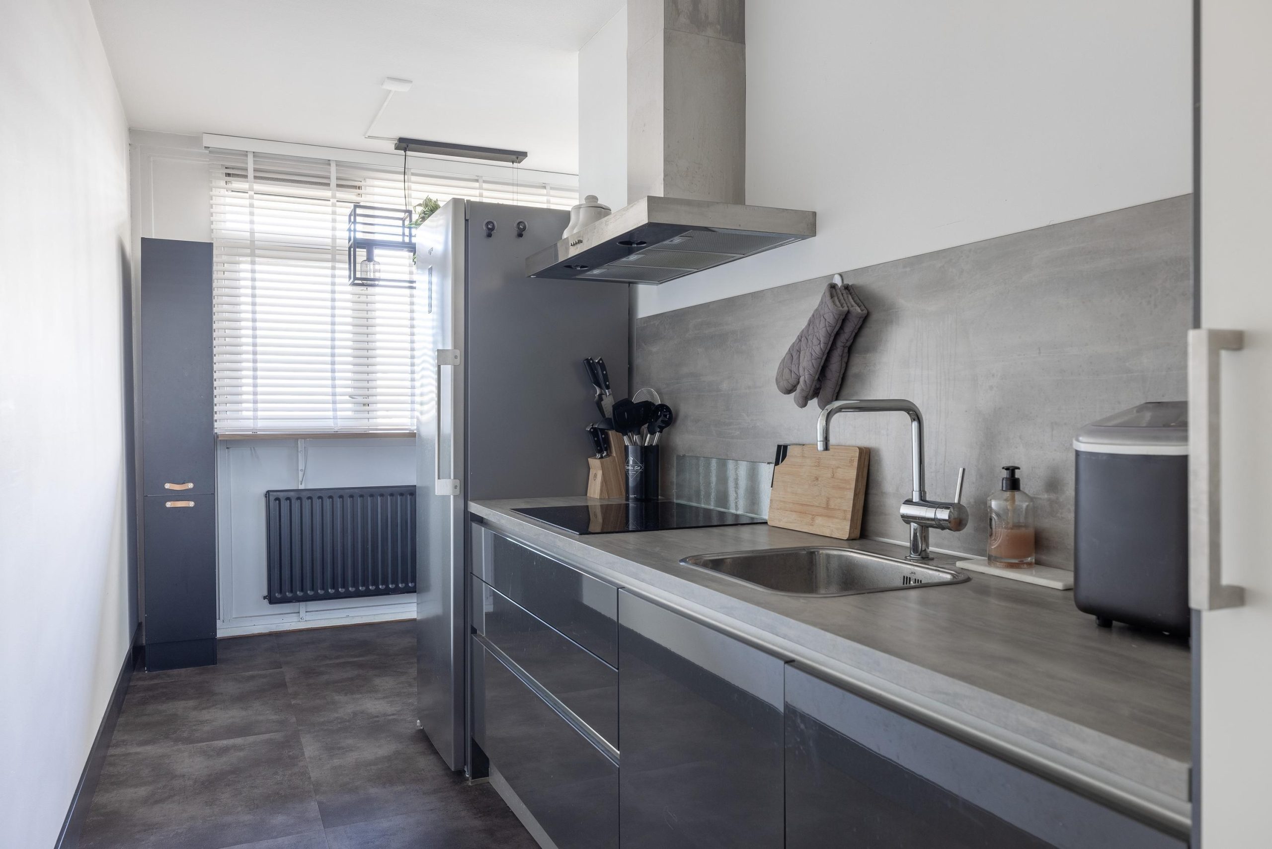 Entree, hal met uitgebreide meterkast en toegang tot de keuken, tweede hal met modern zwevend toilet met fontein en moderne badkamer met wastafelmeubel en ruime inloopdouche, aan de galerijzijde een slaapkamer met de wasmachine-/drogeropstelling, moderne keuken (aan de galerijzijde) voorzien van inbouwapparatuur: inductiekookplaat, afzuigkap, combi magnetron/oven, vaatwasser en koelkast (vriezer ter overname), lichte woonkamer met toegang tot het 10 meter brede balkon op het zuiden, via de eetkamer de toegang tot de 2e en 3e slaapkamer. Deze laatste heeft een grote inloopkast, beide slaapkamers liggen aan de balkonzijde.