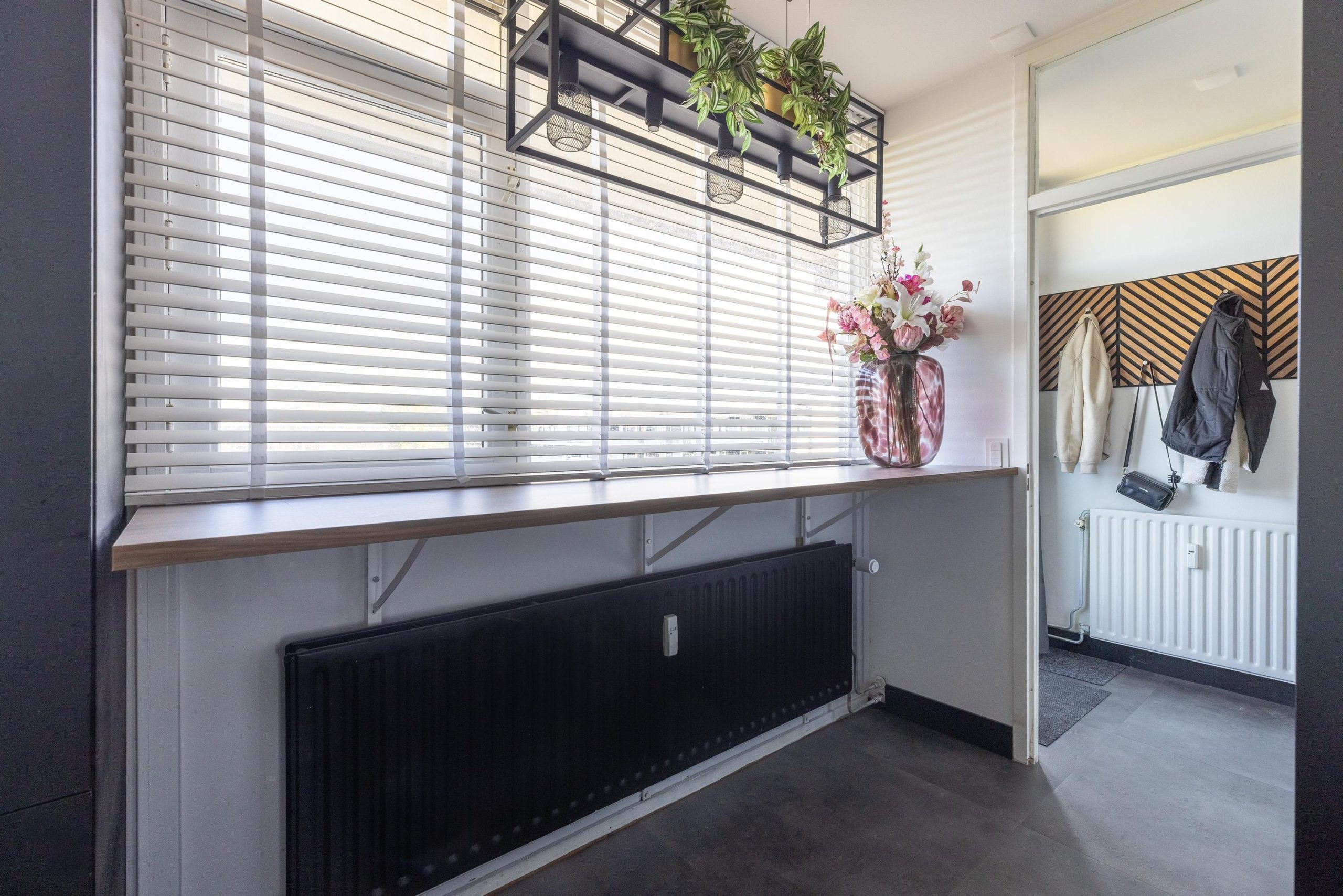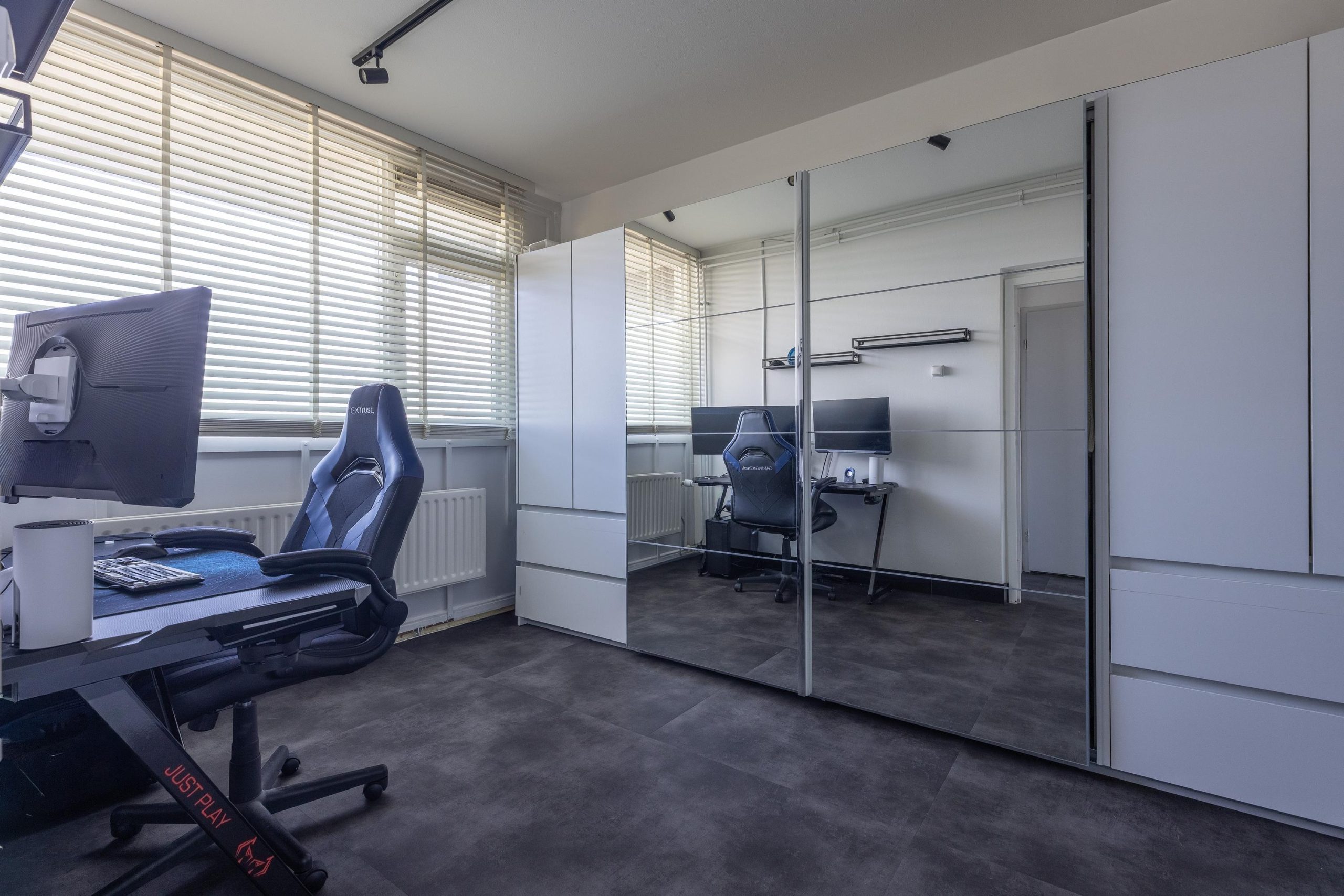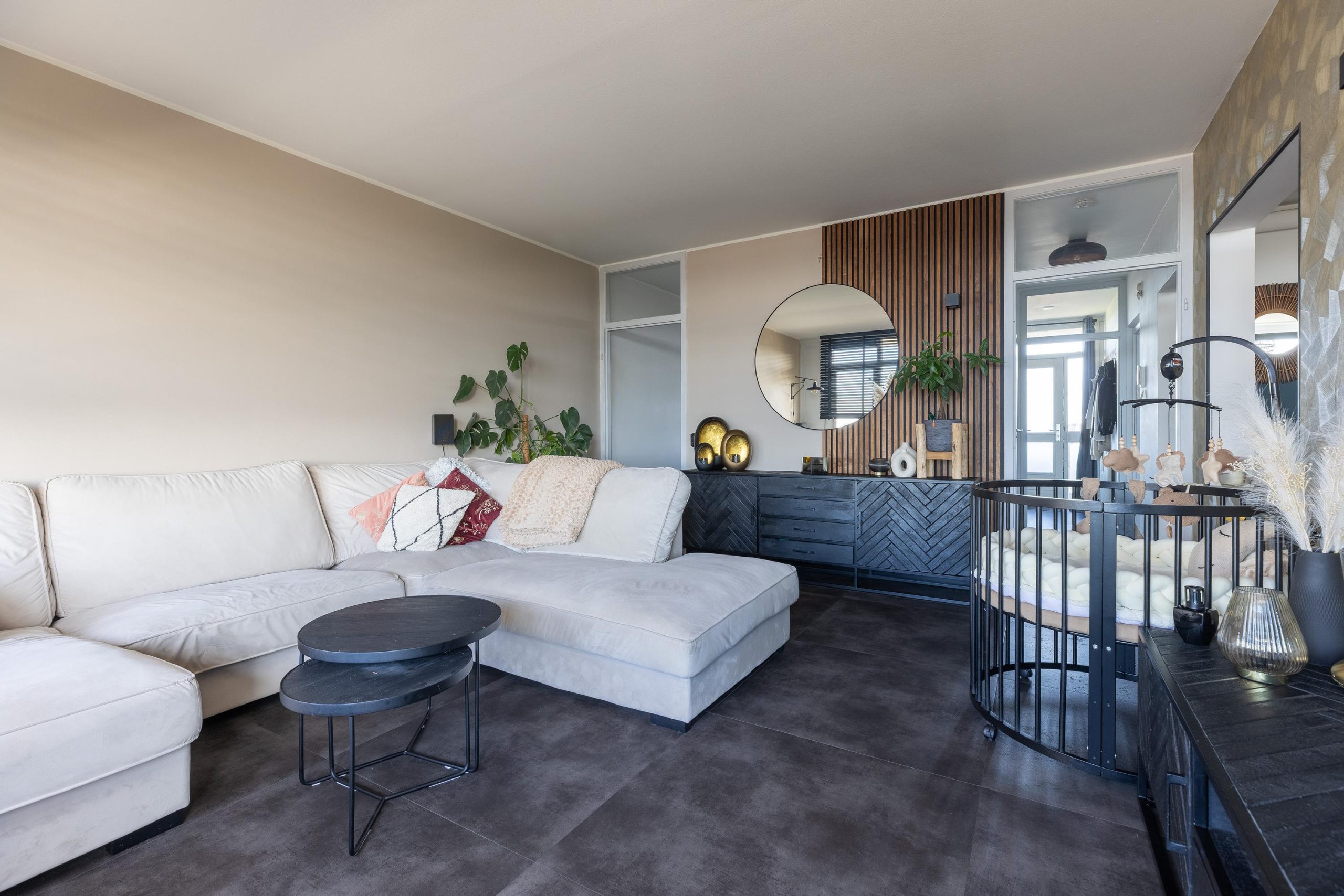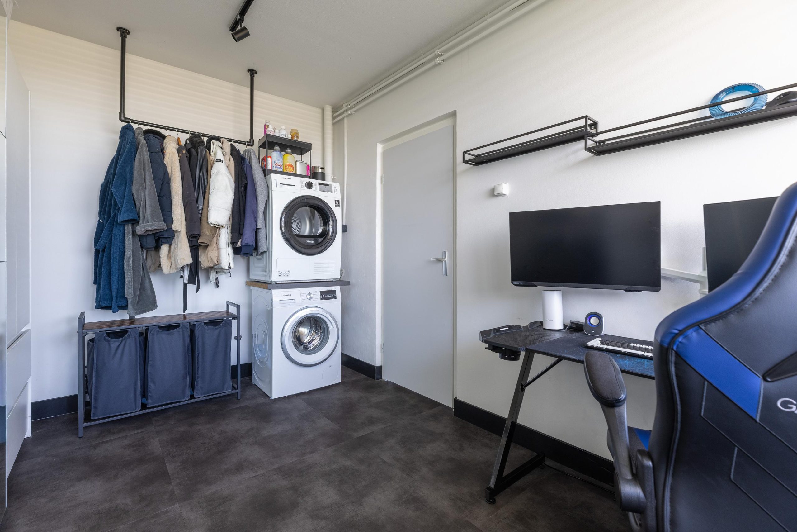 Entree, hal met uitgebreide meterkast en toegang tot de keuken, tweede hal met modern zwevend toilet met fontein en moderne badkamer met wastafelmeubel en ruime inloopdouche, aan de galerijzijde een slaapkamer met de wasmachine-/drogeropstelling, moderne keuken (aan de galerijzijde) voorzien van inbouwapparatuur: inductiekookplaat, afzuigkap, combi magnetron/oven, vaatwasser en koelkast (vriezer ter overname), lichte woonkamer met toegang tot het 10 meter brede balkon op het zuiden, via de eetkamer de toegang tot de 2e en 3e slaapkamer. Deze laatste heeft een grote inloopkast, beide slaapkamers liggen aan de balkonzijde.