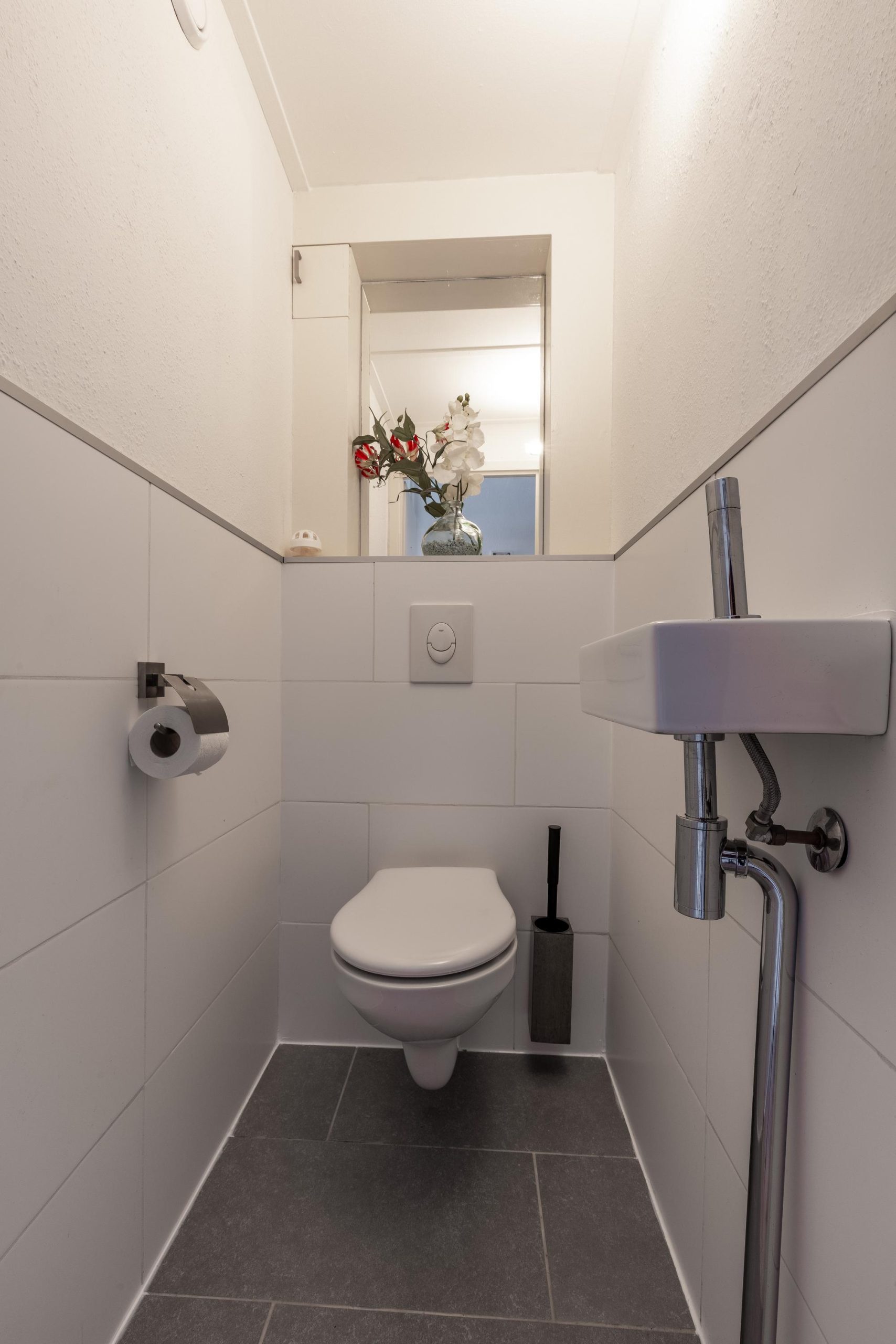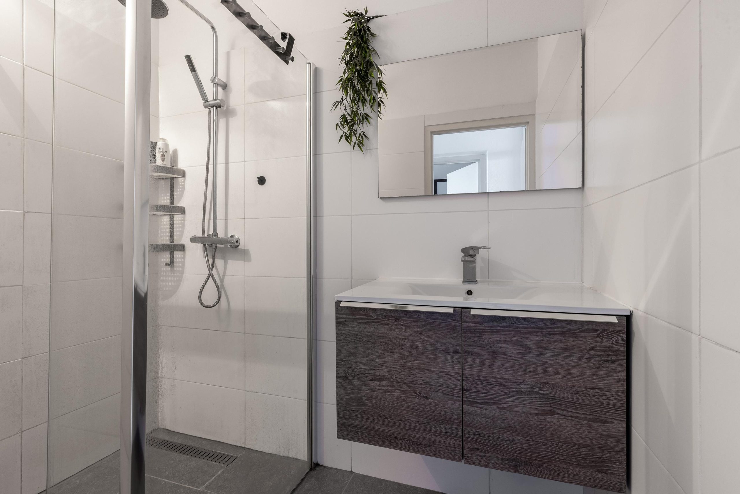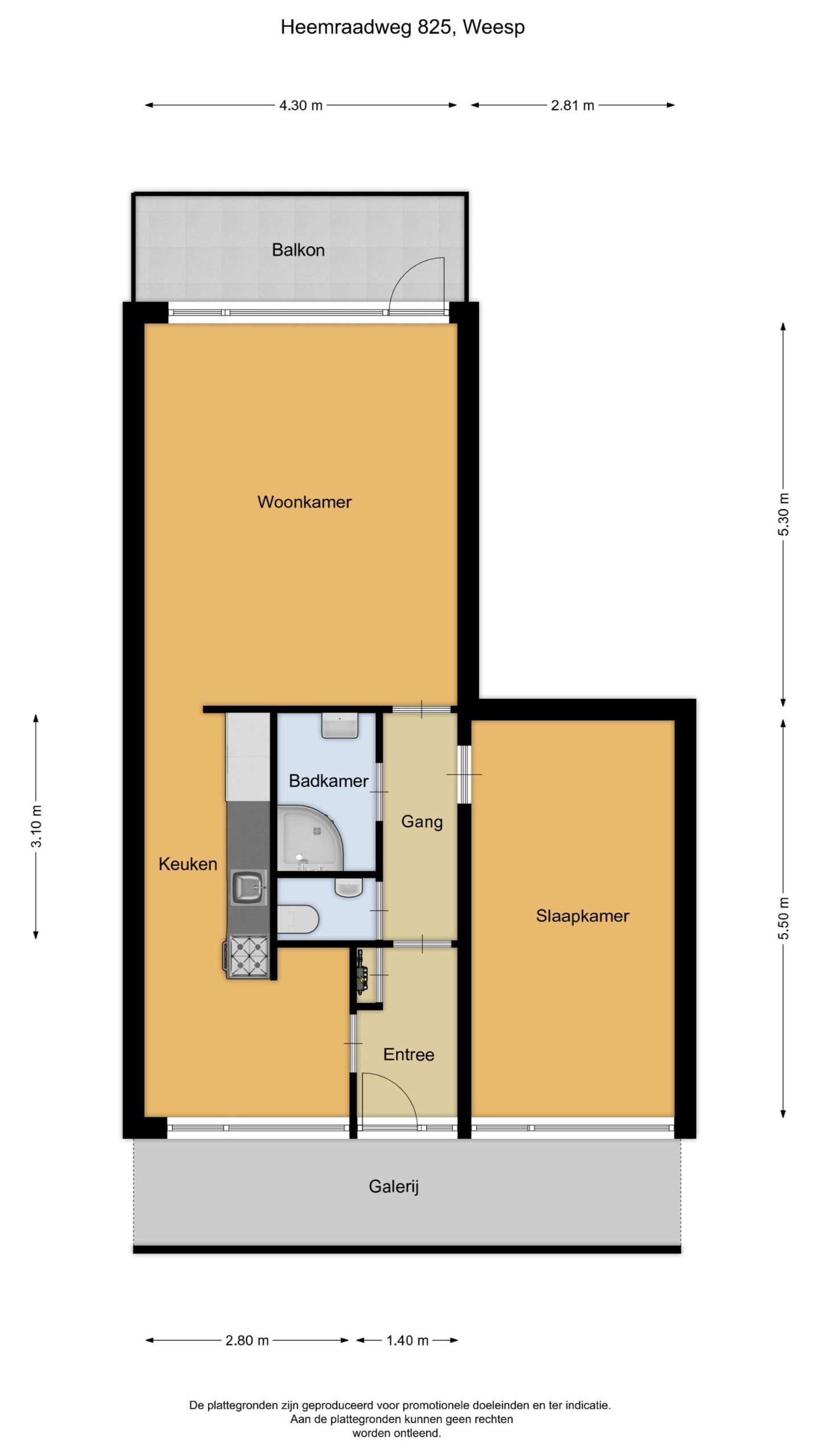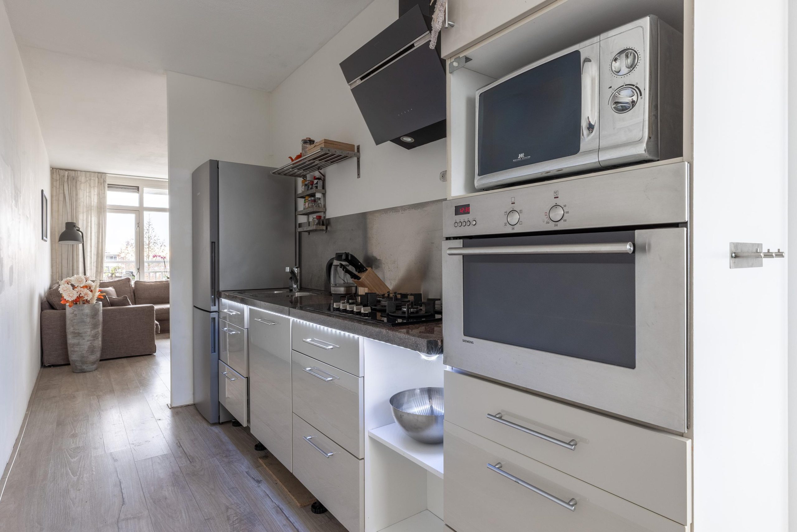 Entree, hal met meterkast, tweede hal met toegang tot het toilet met fontein, moderne badkamer met wastafelmeubel en ruime inloopdouche, aan de galerijzijde de slaapkamer, lichte woonkamer met toegang tot het 10 meter brede balkon op het zuiden, moderne keuken (aan de galerijzijde) voorzien van inbouwapparatuur: 5-pitsgaskookplaat, afzuigkap, oven, vaatwasser en koel-/vriescombinatie, elektrische geiser (eigendom) en de wasmachineaansluiting.