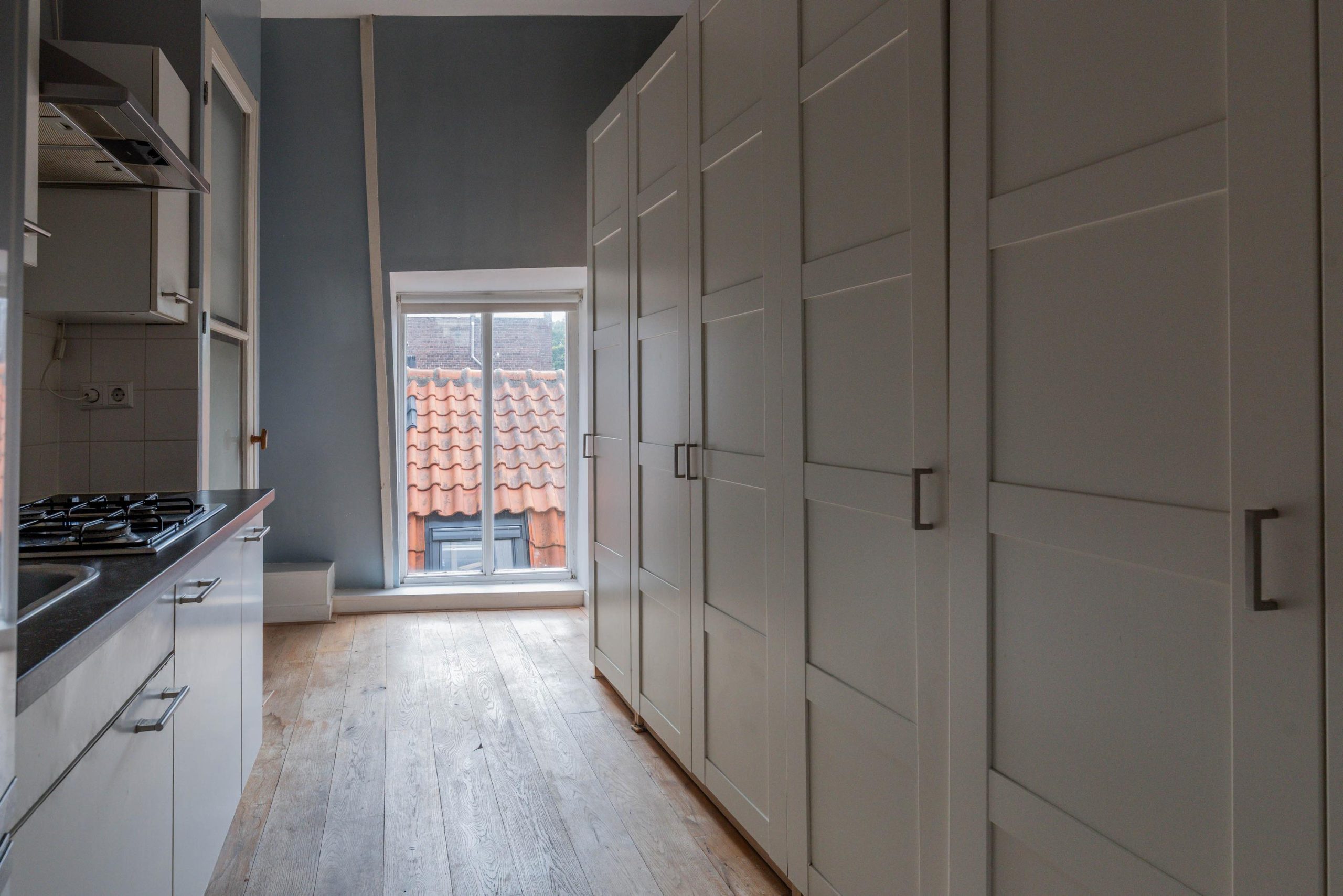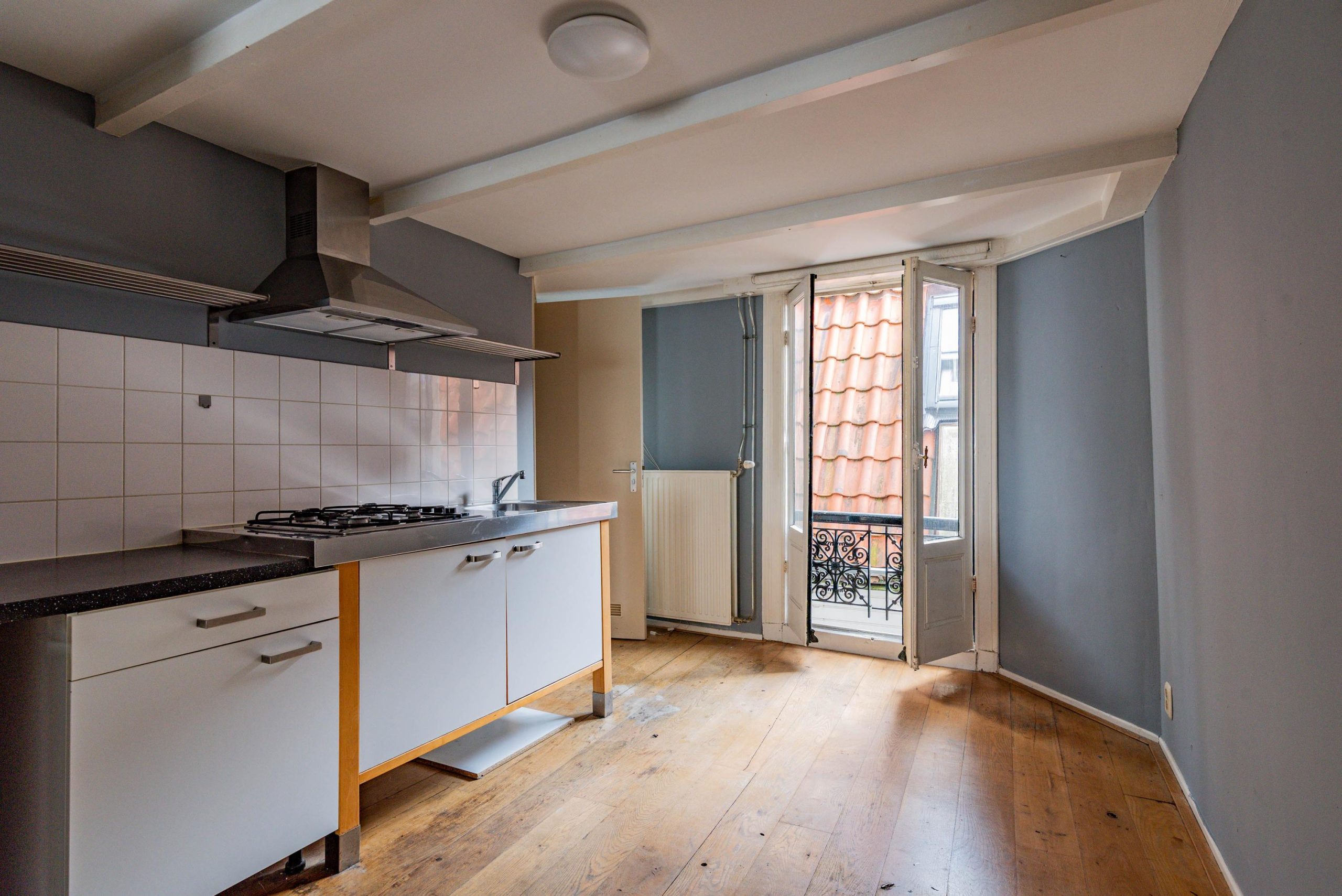 Op de eerste verdieping bevindt zich de woonkamer, de keuken en de badkamer. Vanuit de keuken stap je op het kleine balkonnetje, vanwaar je – tussen de karakteristieke gebouwen door – uitzicht hebt richting de Nieuwstad. Een plek om even van de buitenlucht en de historische omgeving te genieten.