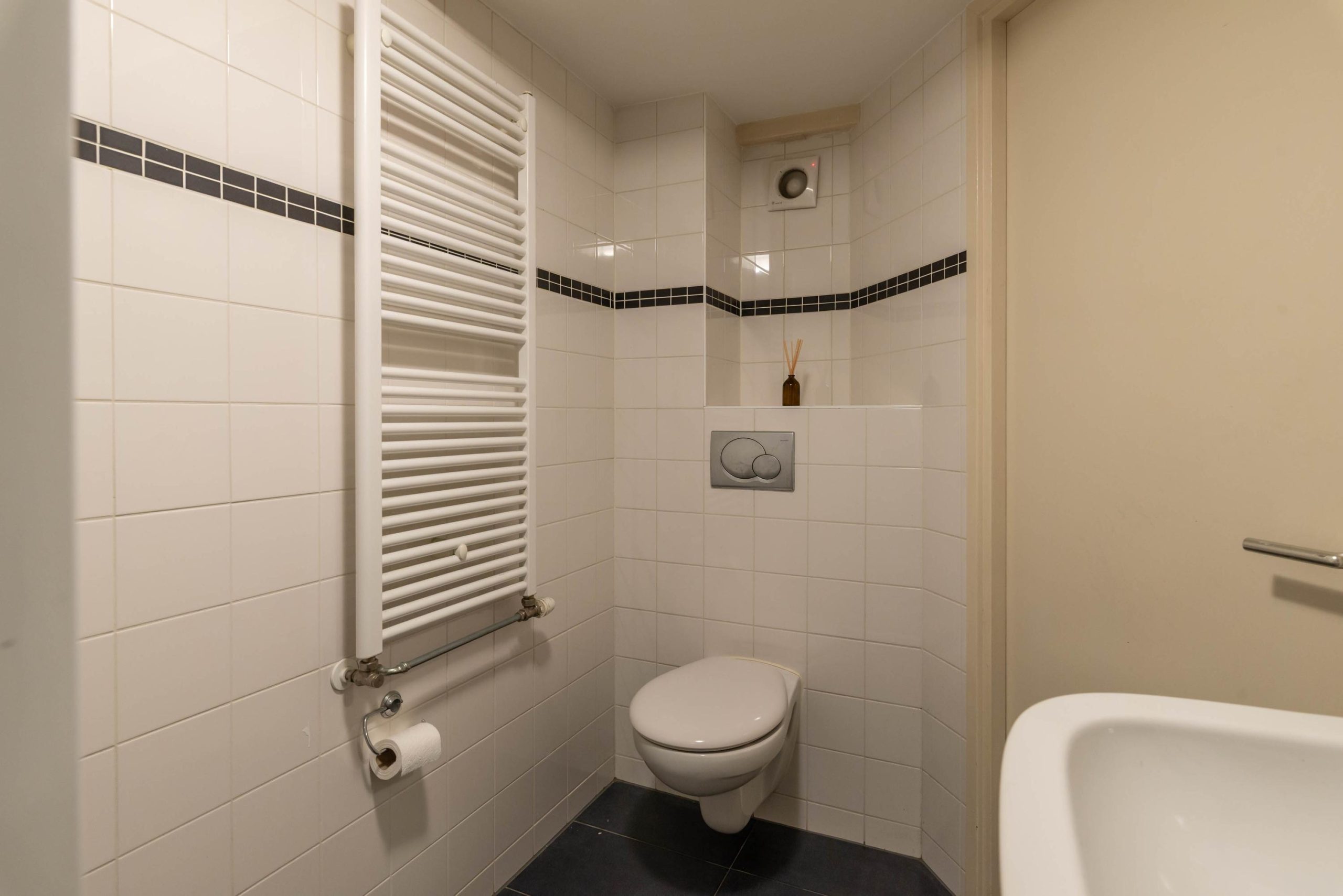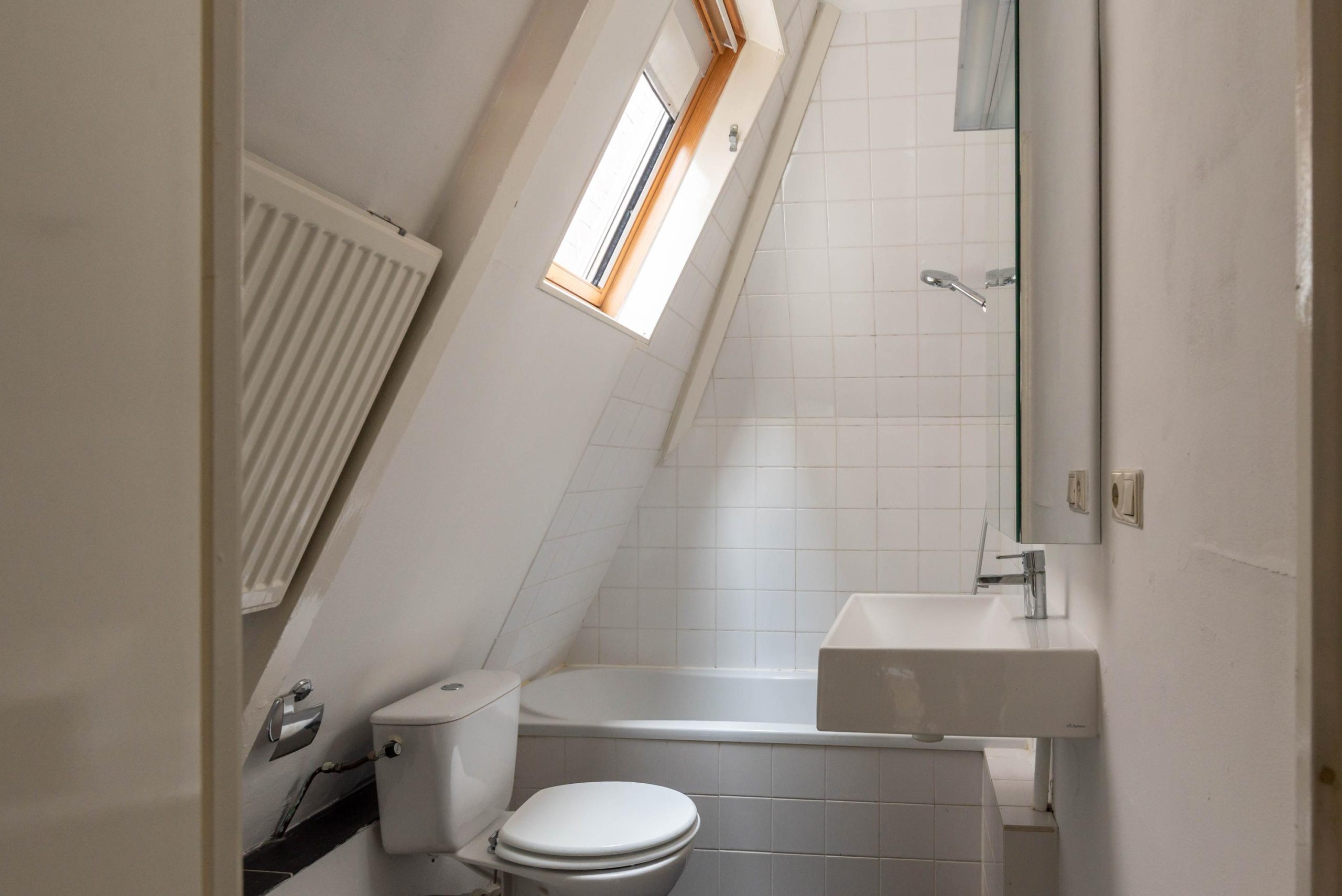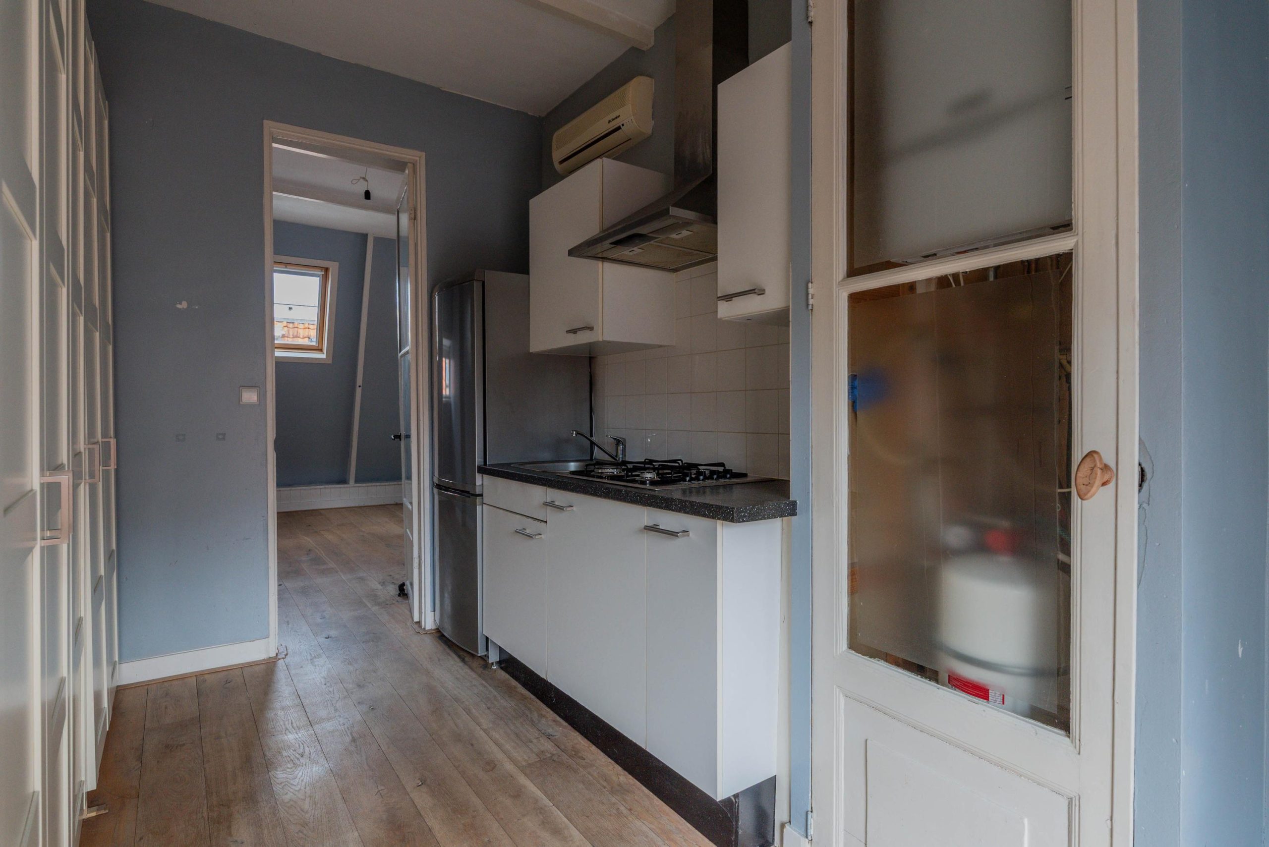 Tweede verdieping: badkamer met ligbad, toilet, radiator en wastafel, slaapkamer aan de voorzijde met airconditioning, keuken met 4-pits gasfornuis en inbouwzuigkap (tweede slaapkamer mogelijk) en airconditioning, opbergkast met cv uit 2010.