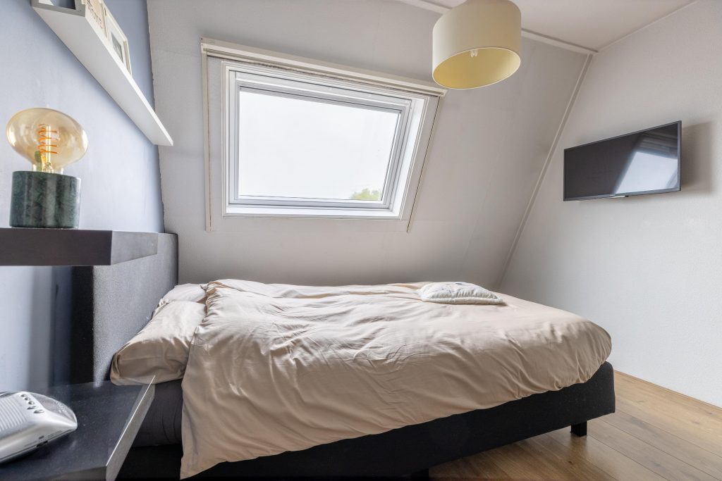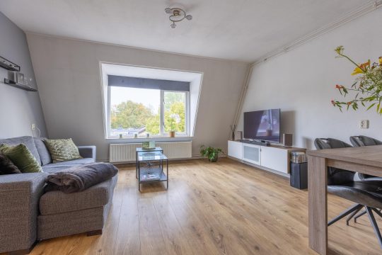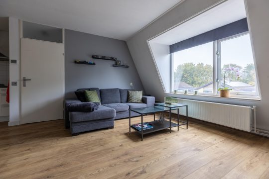 Het appartement is instapklaar en slim ingericht, met een praktische indeling die optimaal gebruikmaakt van de beschikbare ruimte. De woonkamer is licht en ruimtelijk, en beschikt over een open keuken met onder andere een 4-pitskookplaat, afzuigkap, losse koel-/vrieskast en oven. Aan de achterzijde van het appartement liggen de slaapkamer en de in 2023 gerenoveerde badkamer, uitgerust met inloopdouche met infra rood paneel, wastafelmeubel, hangtoilet en wasmachineaansluiting. De dakramen zijn vervangen in 2023 (badkamer) en 2024 (slaapkamer). Aan de entreezijde bevindt zich een terras van 8 m² op het noordoosten.