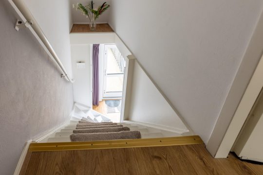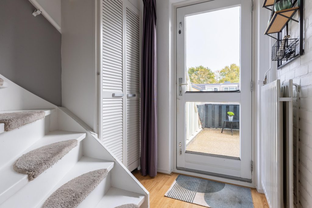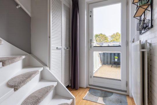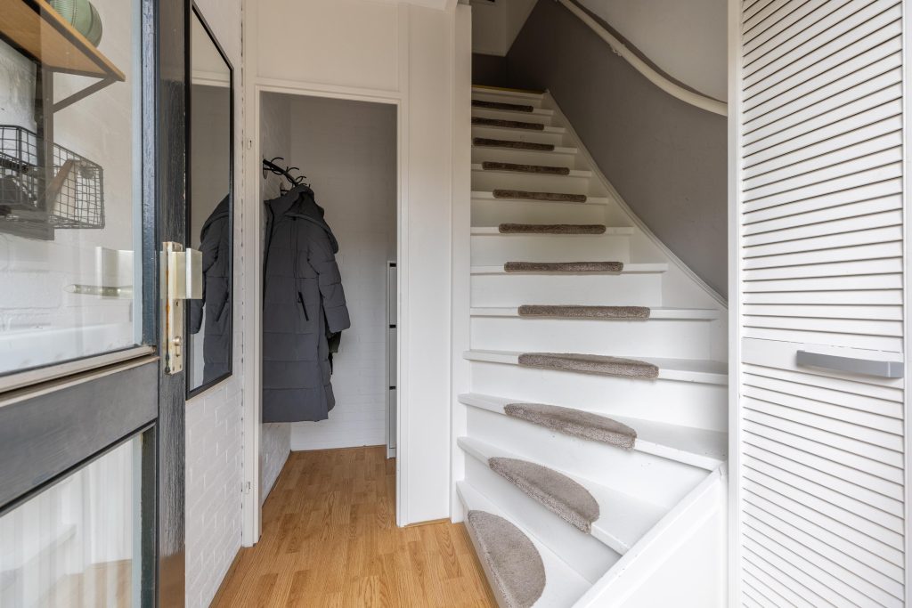 1e etage: voordeur met aan de voorzijde een heerlijk zonnig balkon gelegen op het noordoosten; entree/hal met trapkast en trapopgang naar de 2e etage.