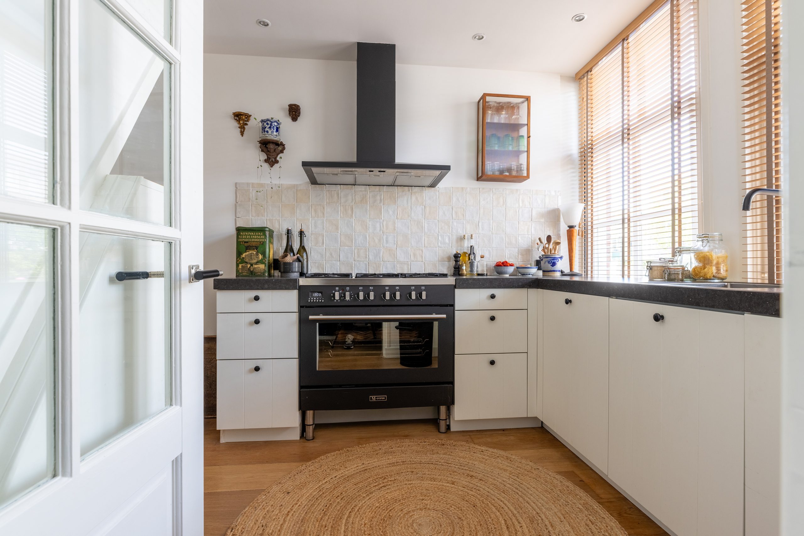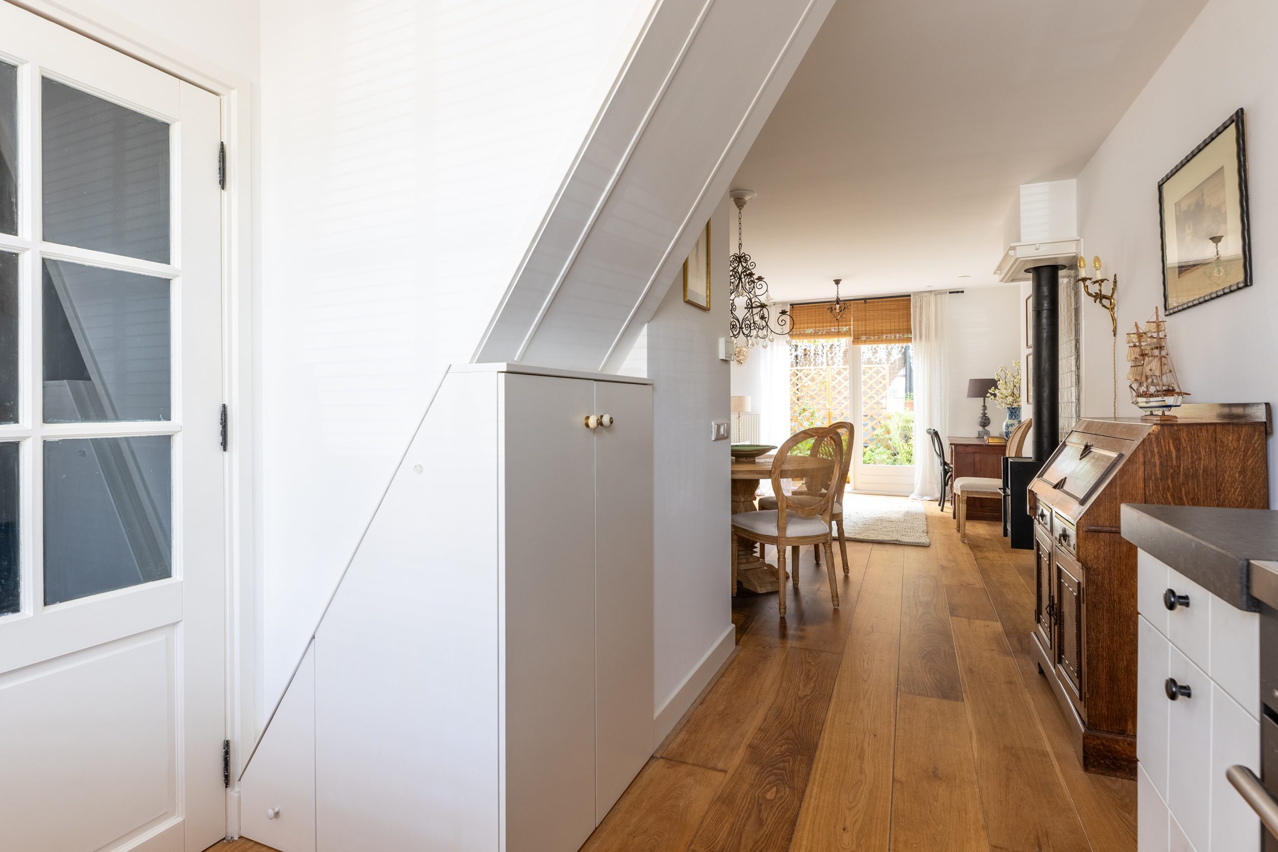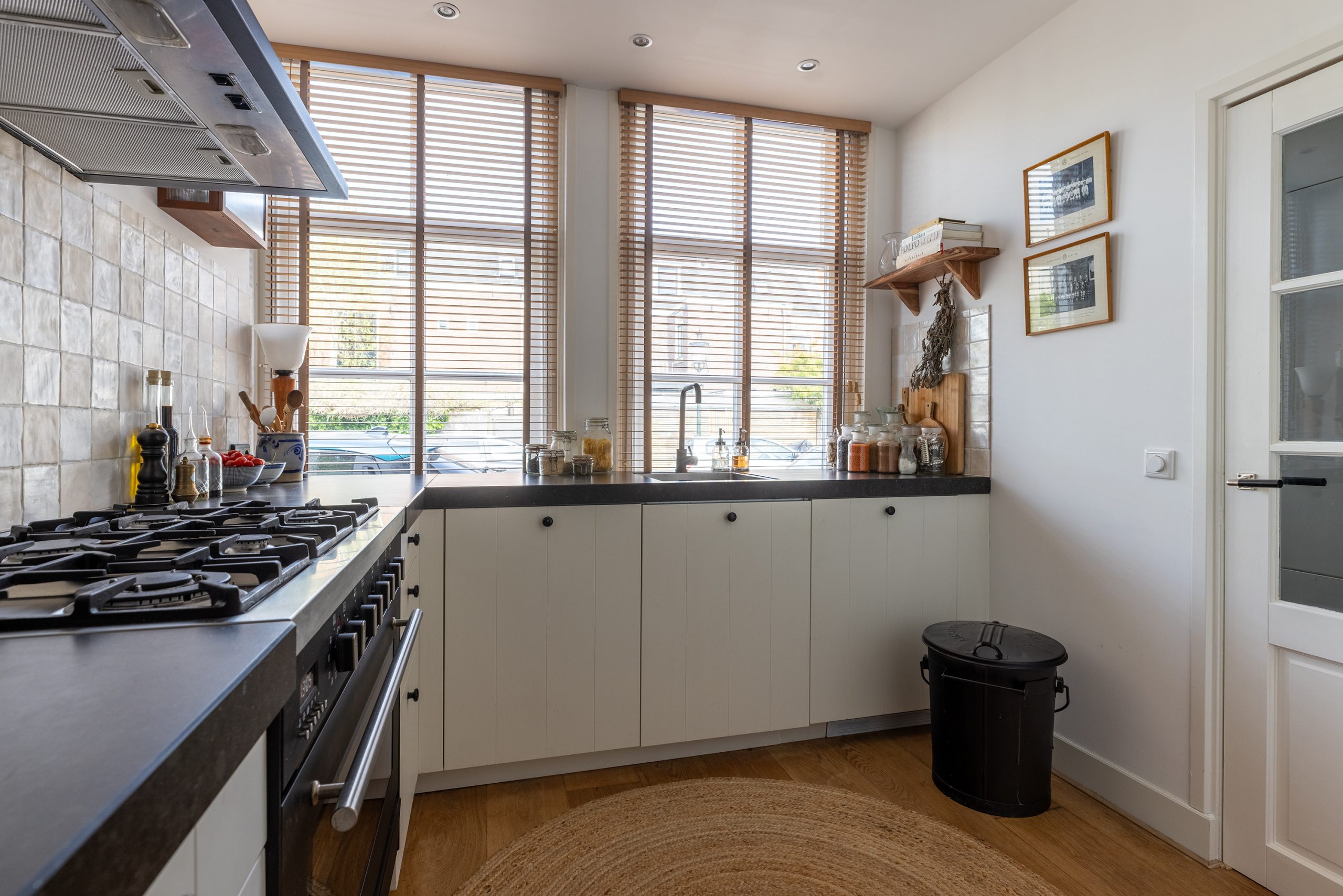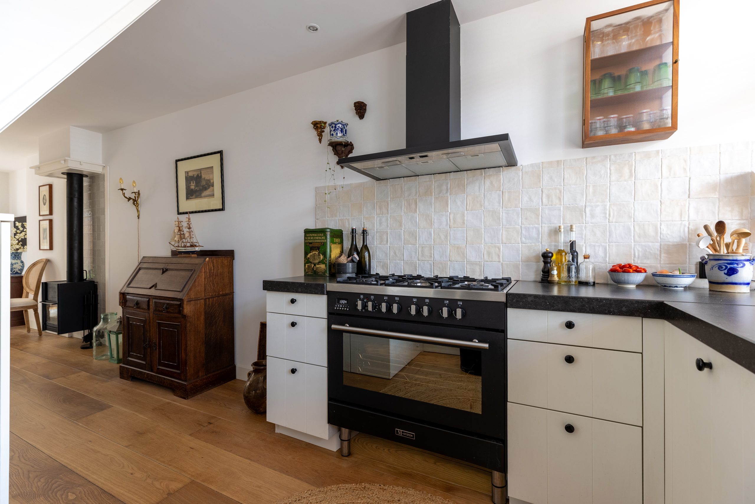 Entree, hal met meterkast, vernieuwd toilet (2025, vrijhangend) en trapopgang (prachtig bekleed met loper). De uitgebouwde woon-/eetkamer beschikt over openslaande deuren en een sfeervolle houtkachel met Hollandse witjes betegeld erachter. De ruimte is afgewerkt met glad stucwerk en een eikenhouten vloer. Aan de voorzijde bevindt zich de moderne keuken, voorzien van een breed 6-pitsgasfornuis met oven, afzuigkap en koelkast met vriesgedeelte.