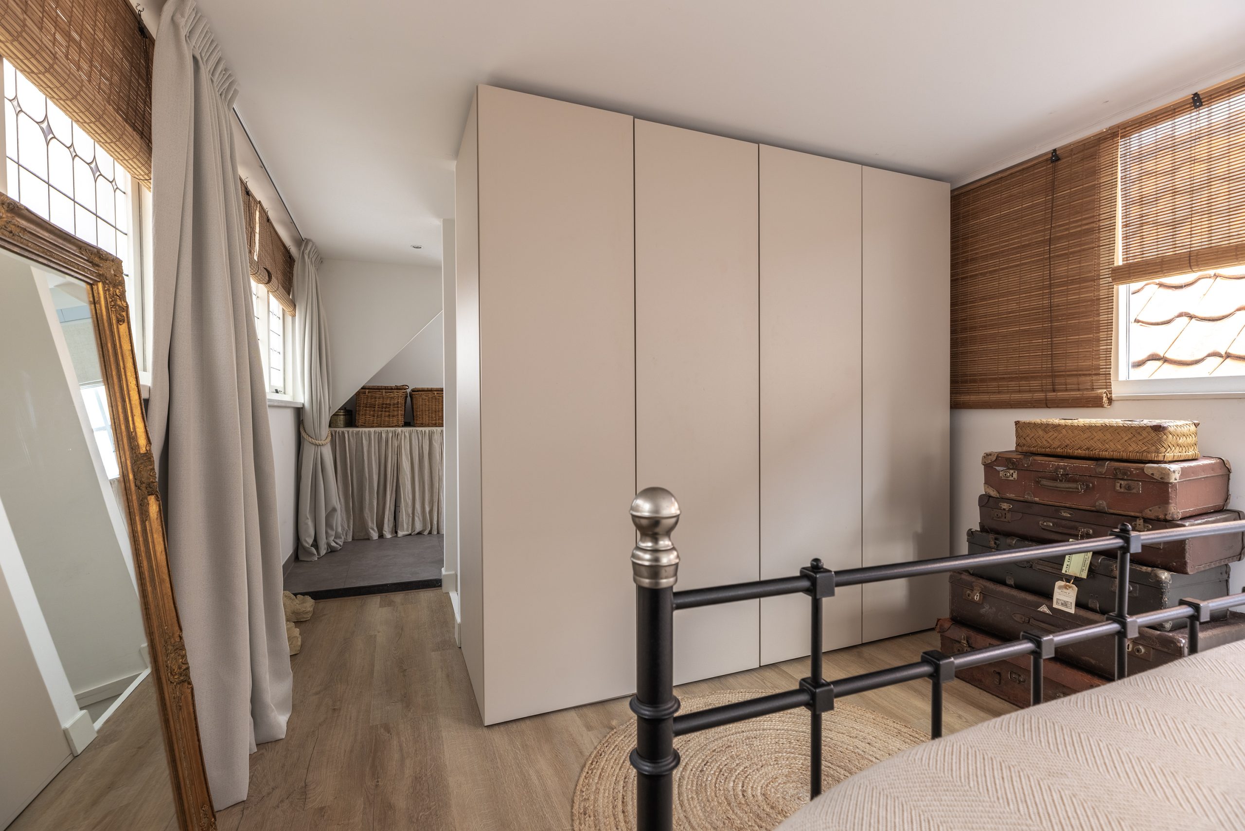 Open verdieping met aan de achterzijde de slaapkamer, voorzien van een kastenwand en vloerverwarming (2025). Aan de voorzijde bevindt zich de ruime, open badkamer met inloopdouche, wastafelmeubel en aansluitingen voor wasmachine en droger (beide blijven achter).