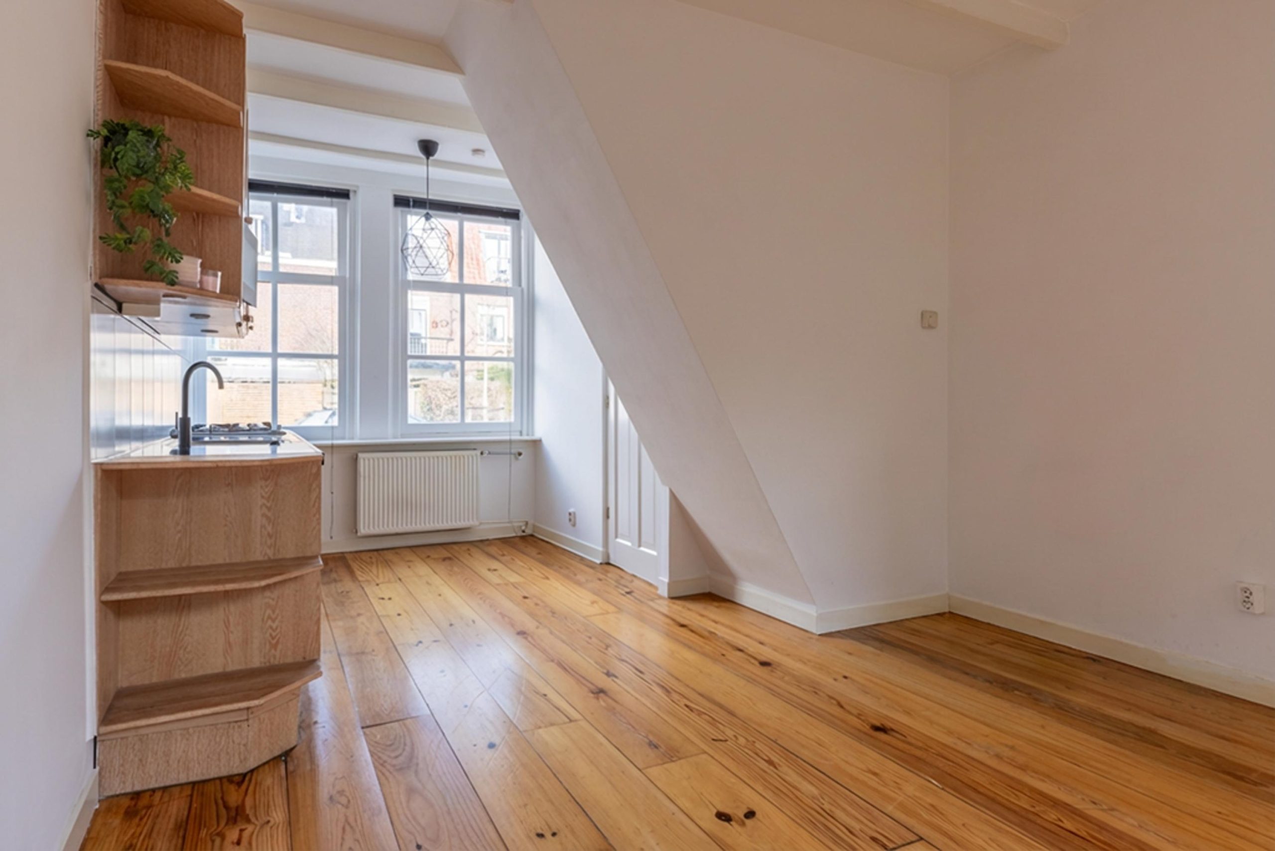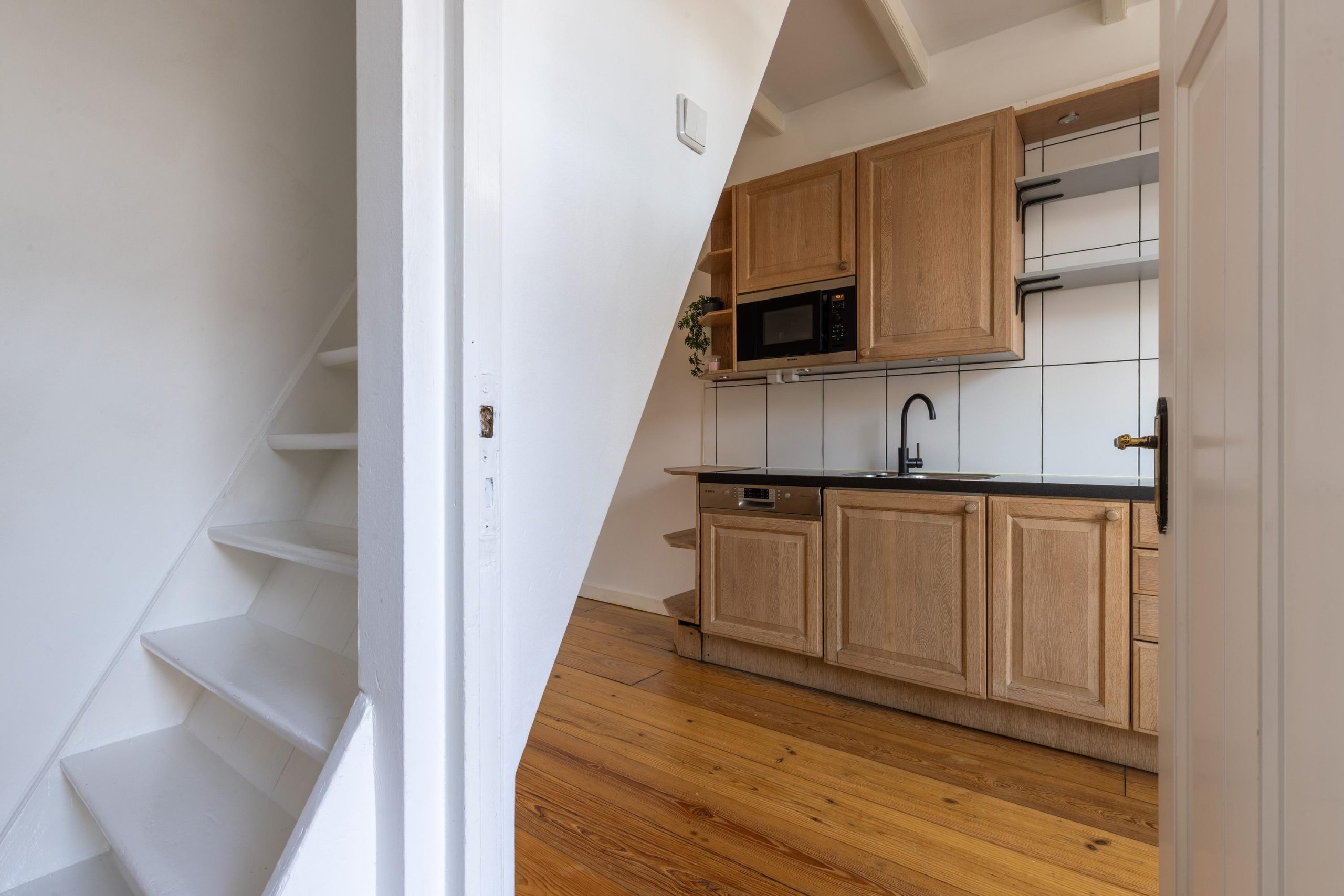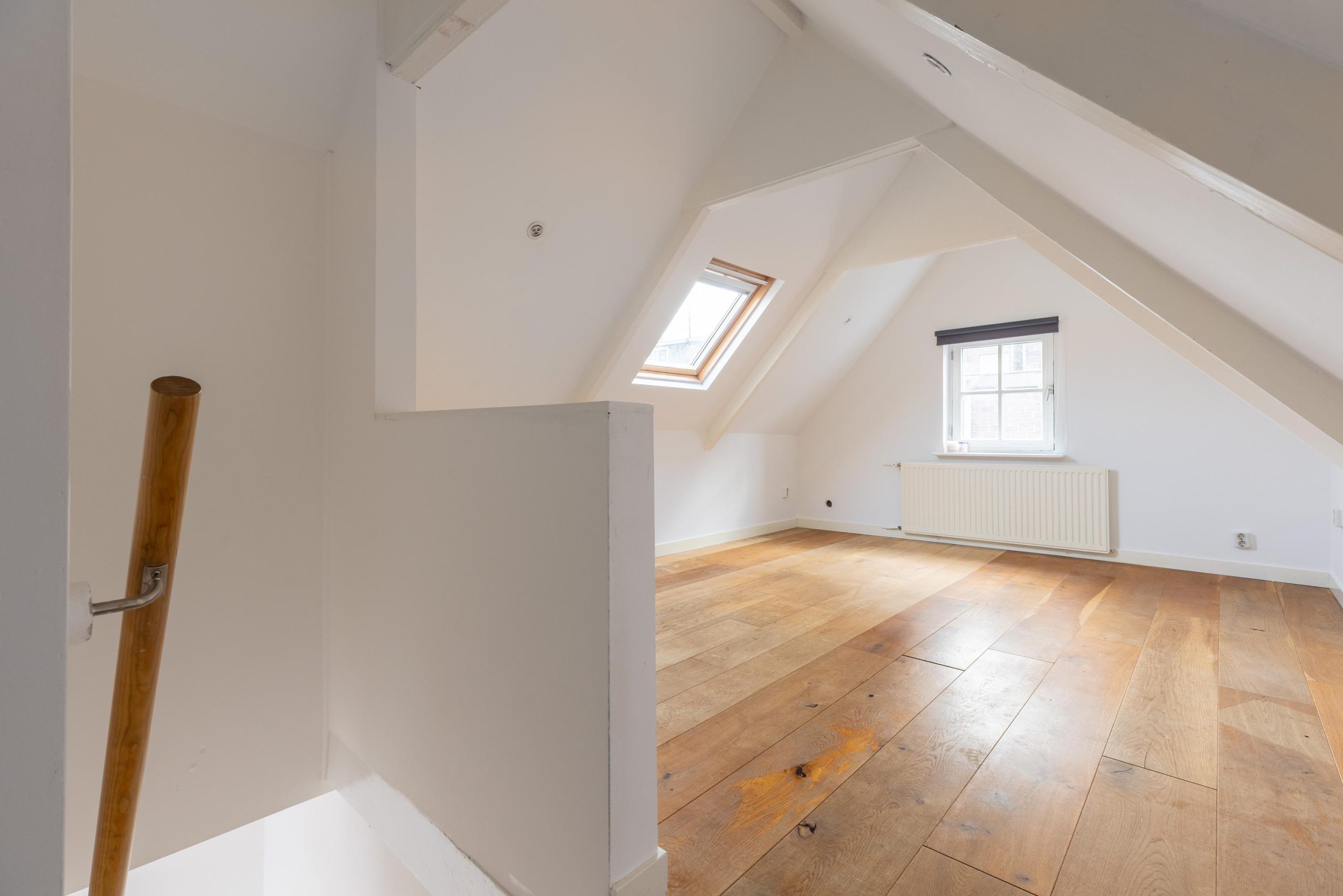Op de verdieping bevindt zich de slaapkamer en de badkamer. Ook hier is de ruimte efficiënt benut. De woning is compact, maar logisch en doordacht opgezet – precies wat je zoekt als je midden in de stad wil wonen.