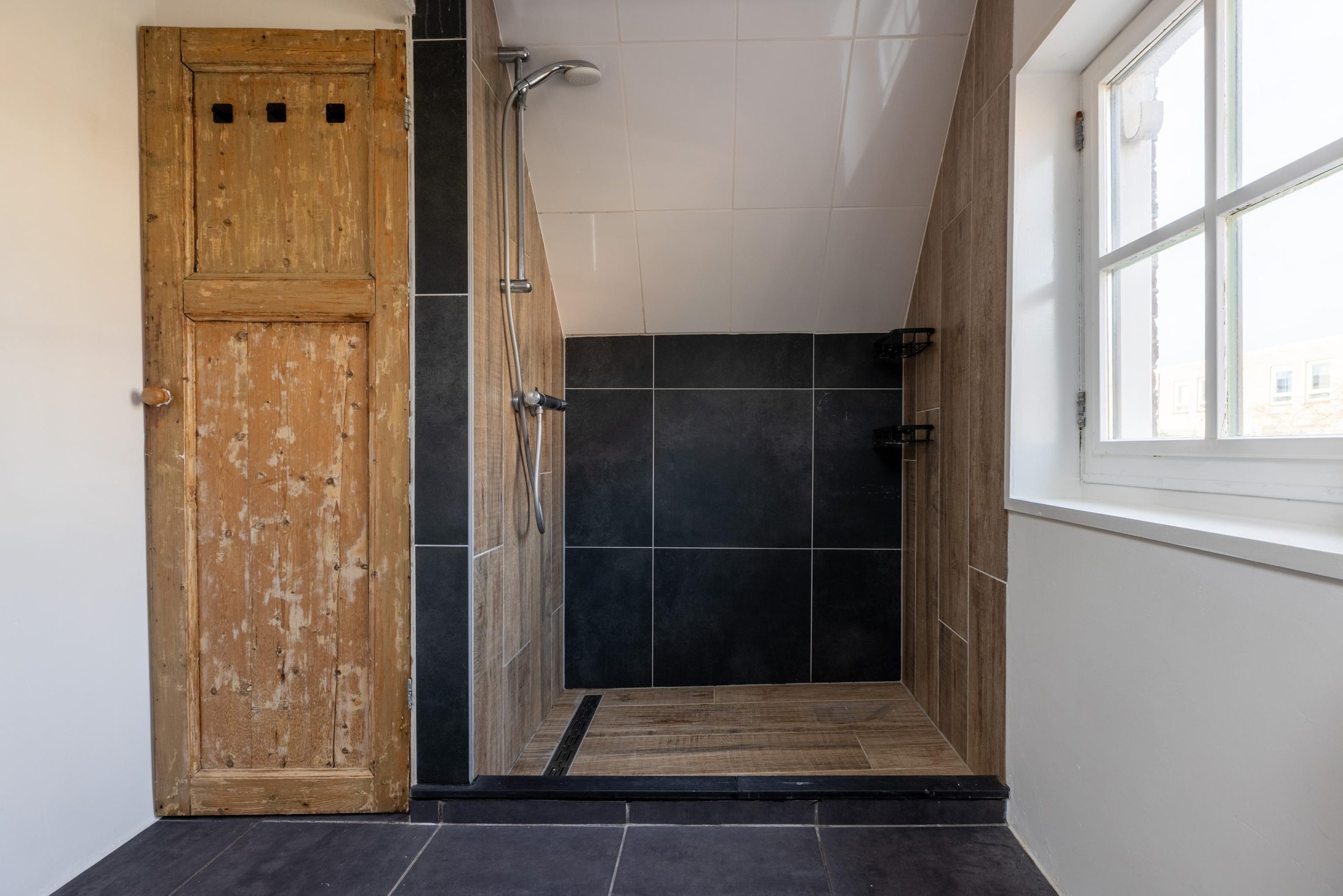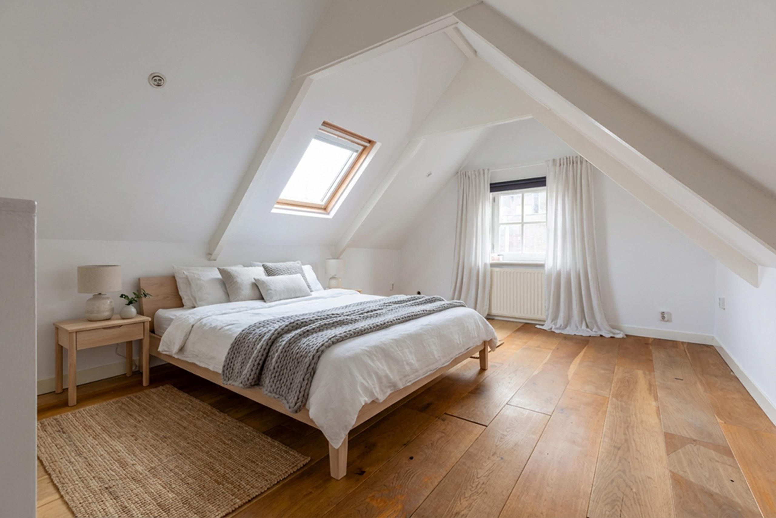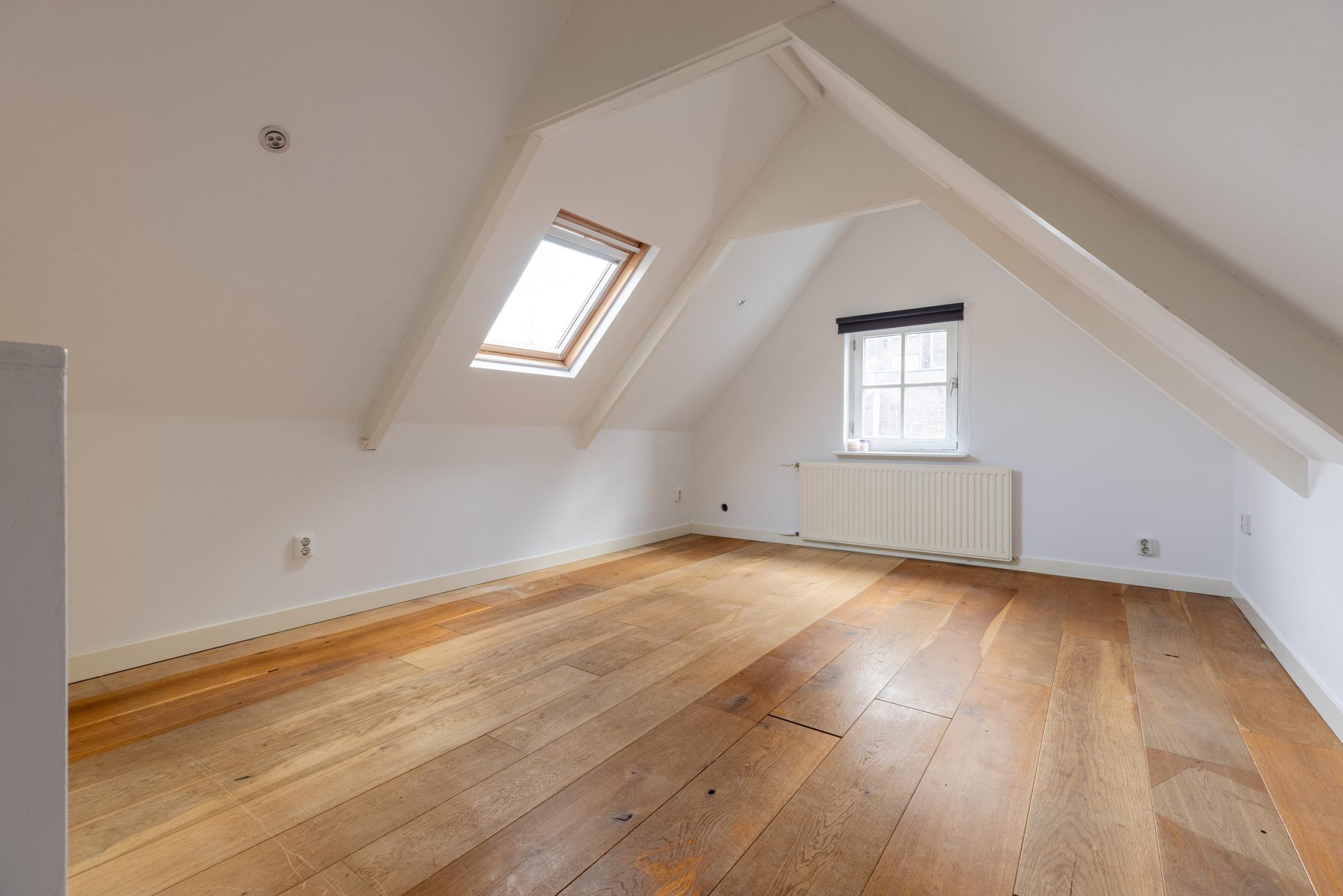 Op de verdieping bevindt zich de slaapkamer en de badkamer. Ook hier is de ruimte efficiënt benut. De woning is compact, maar logisch en doordacht opgezet – precies wat je zoekt als je midden in de stad wil wonen.