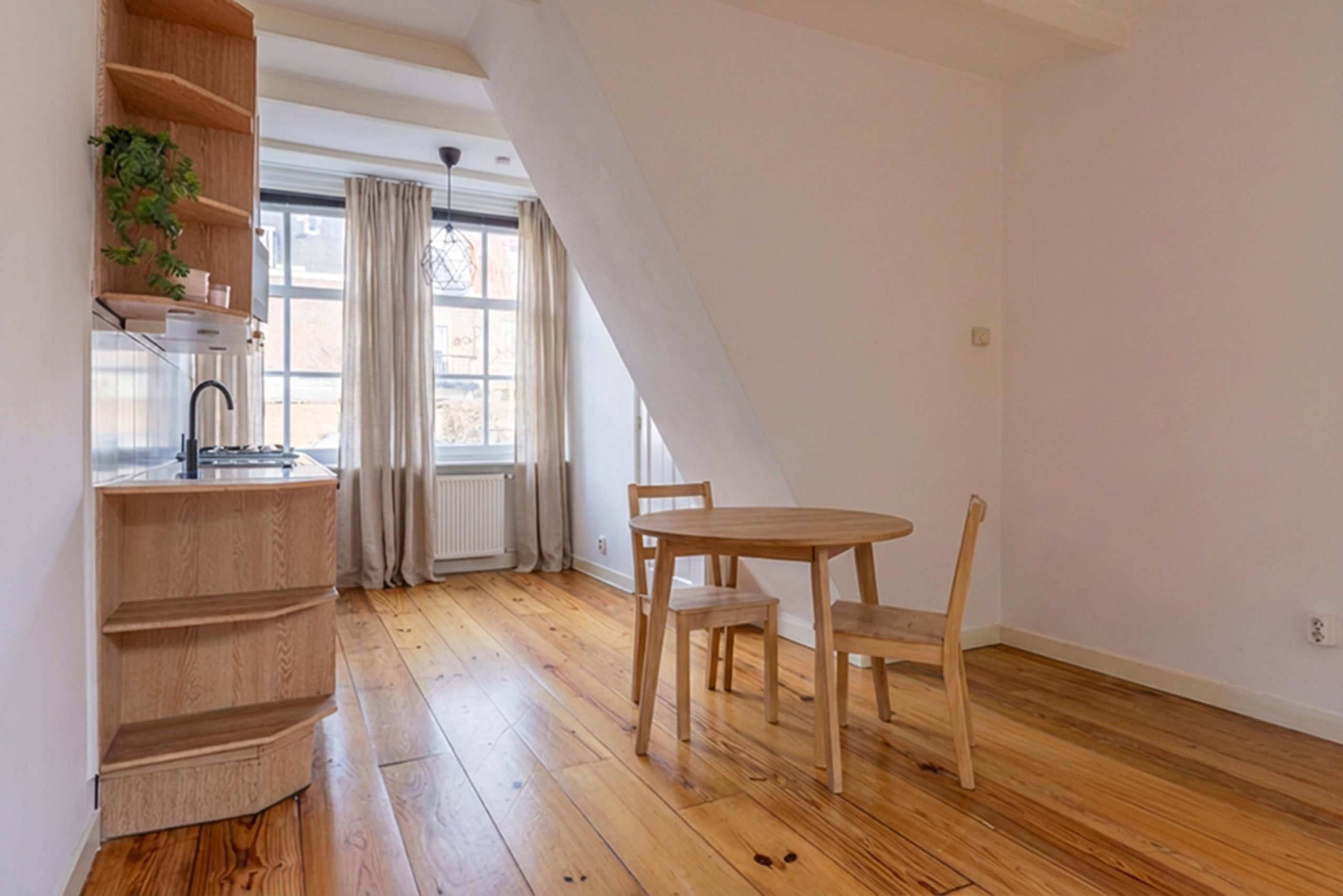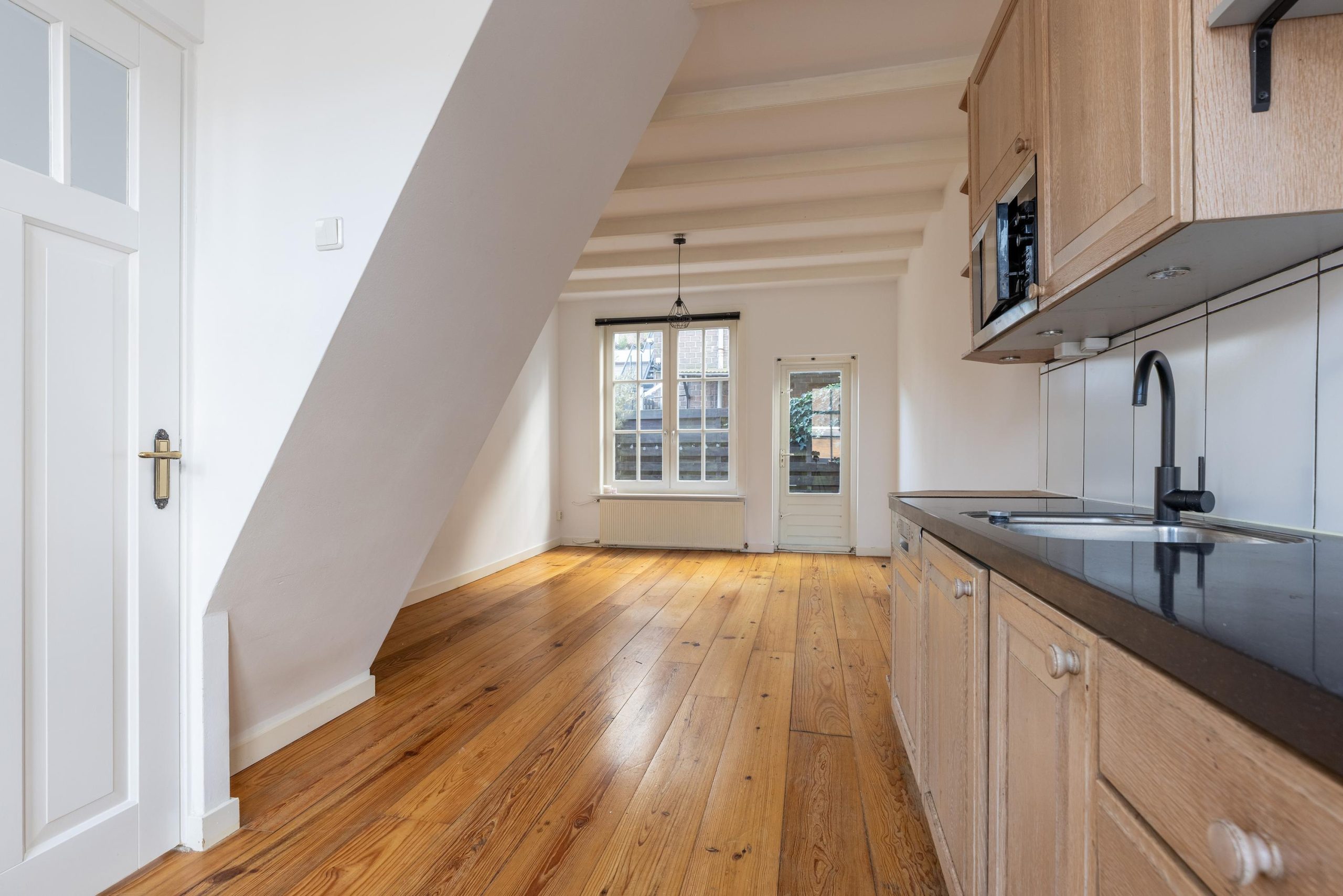 Achter de karakteristieke gevel schuilt een verrassend slim ingedeelde woning, verdeeld over twee woonlagen. De begane grond bestaat uit een lichte woonkamer met open keuken. Dankzij de prettige plafondhoogte en de rechte maatvoering voelt de ruimte groter aan dan je op basis van de vierkante meters zou verwachten. Een fijne plek om te wonen, te werken en gasten te ontvangen. Vanuit de woonkamer is er een deur naar de zonnige patio, gelegen op het zuiden, waar je volledig privé kan zitten.