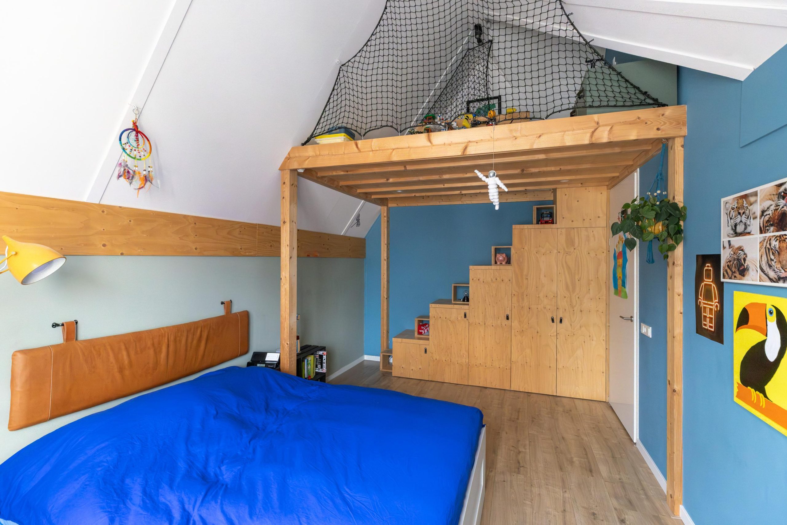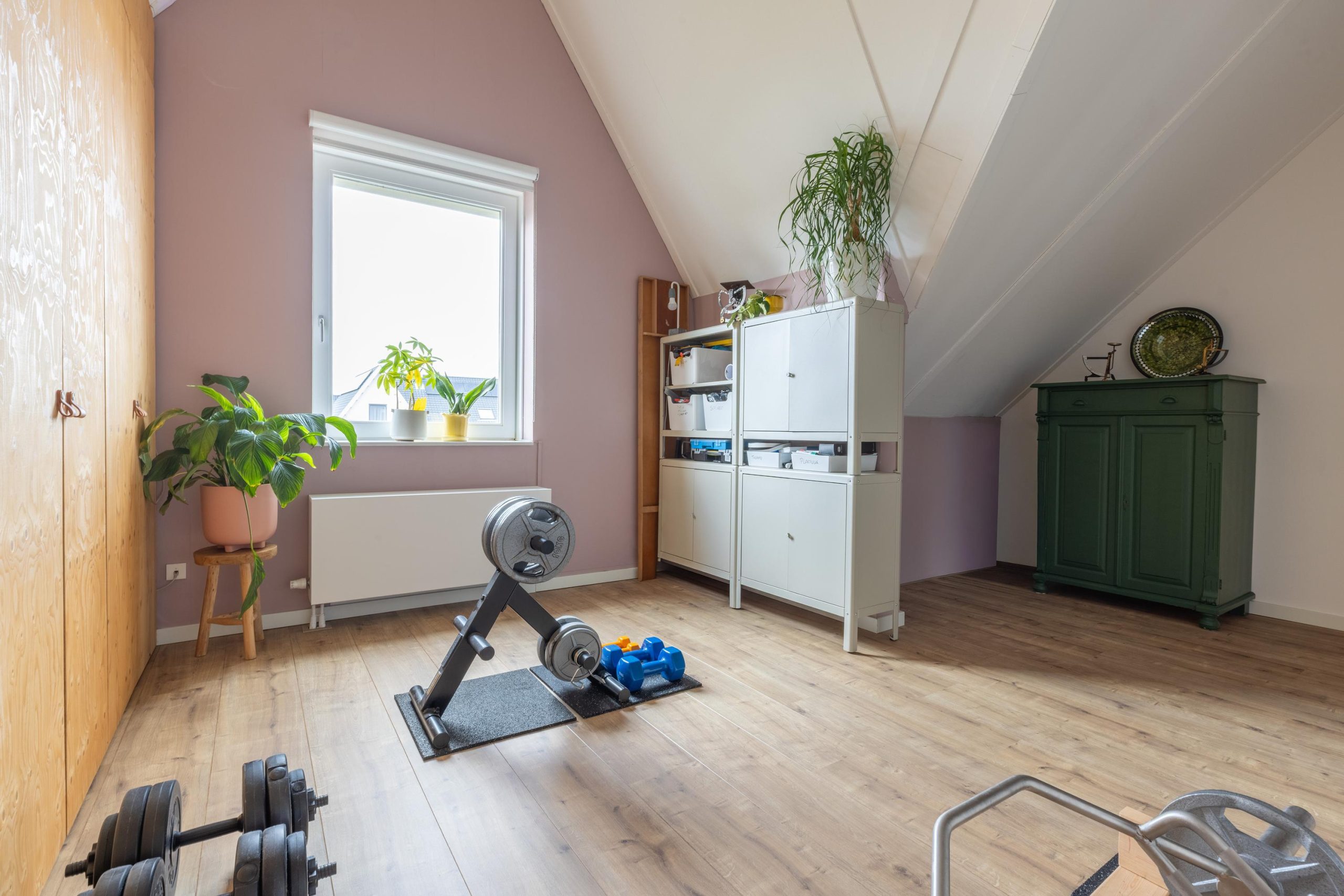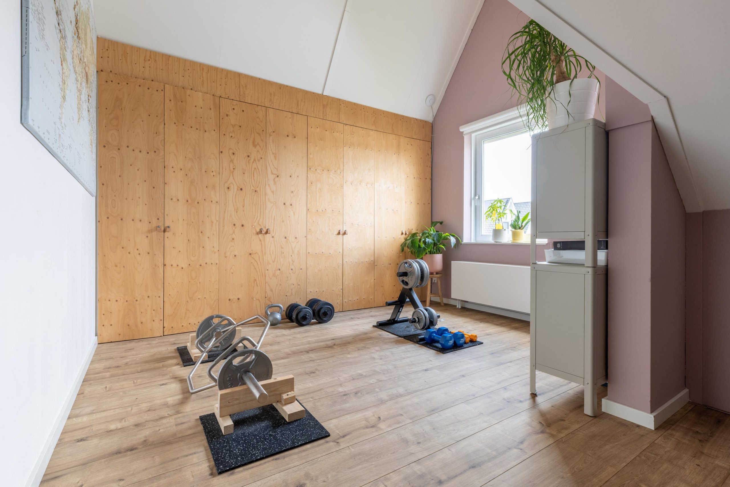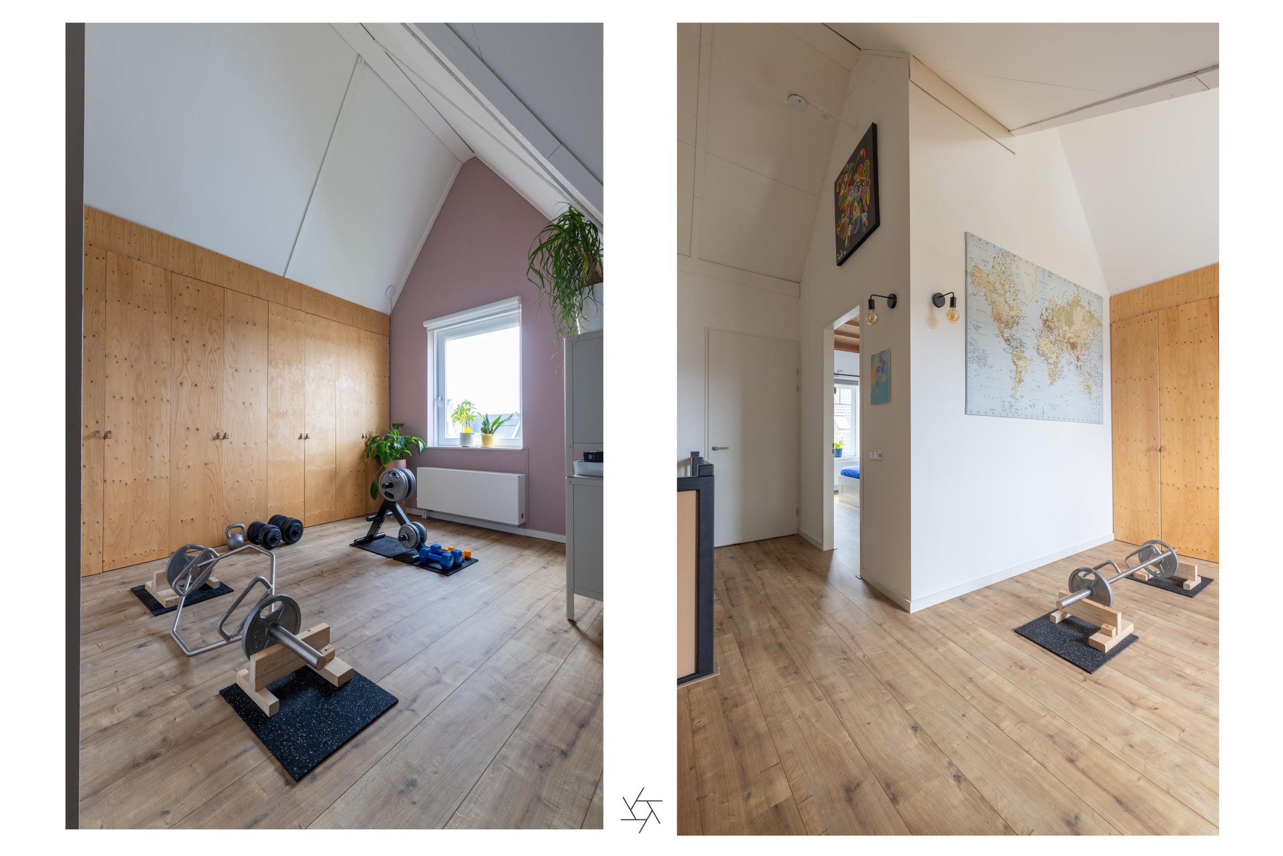 Tweede verdieping: Overloop met technische ruimte waarin zich de CV, omvormer van de zonnepanelen, mechanische ventilatie en de aansluiting voor wasmachine en droger. De Solartube zorgt voor daglicht toetreding. Aan de voorzijde vind je een riante slaapkamer met een leuke speel/slaapvide. De achterzijde is nu in gebruik als sportkamer. Hier kan eenvoudig een extra slaapkamer worden gecreëerd.