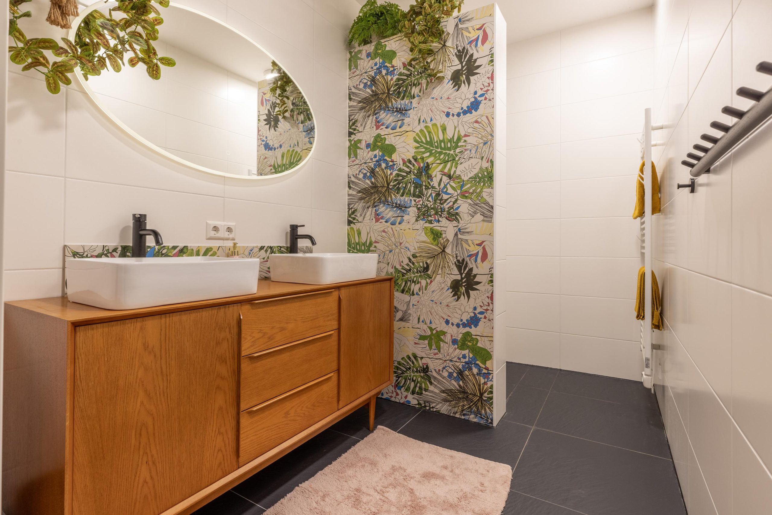 Eerste verdieping: Overloop met drie in grootte variërende slaapkamers. De grote raampartijen zorgen voor veel licht. De moderne badkamer is voorzien van een inloopdouche, een wastafelmeubel en vloerverwarming. Er is een separaat toilet.