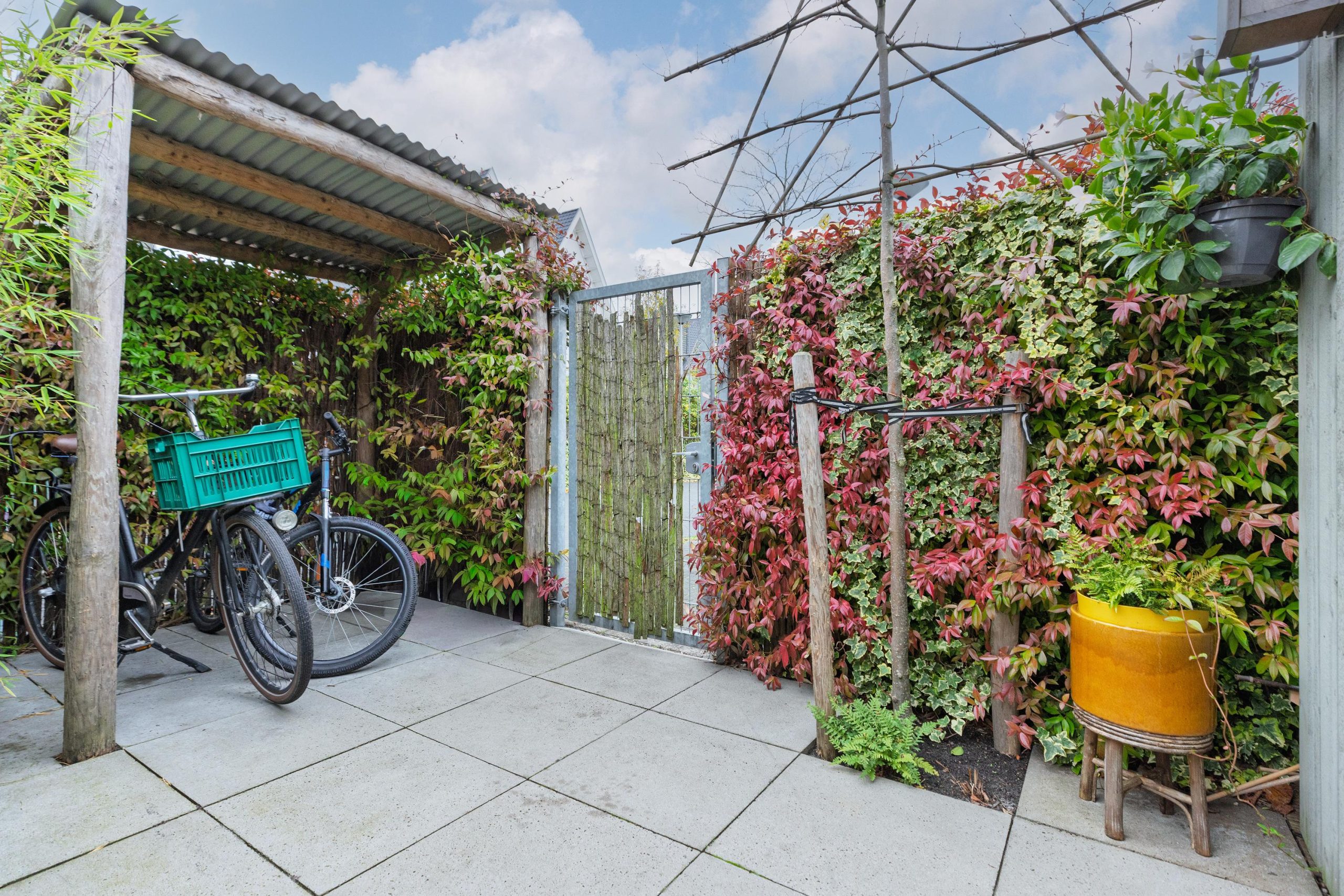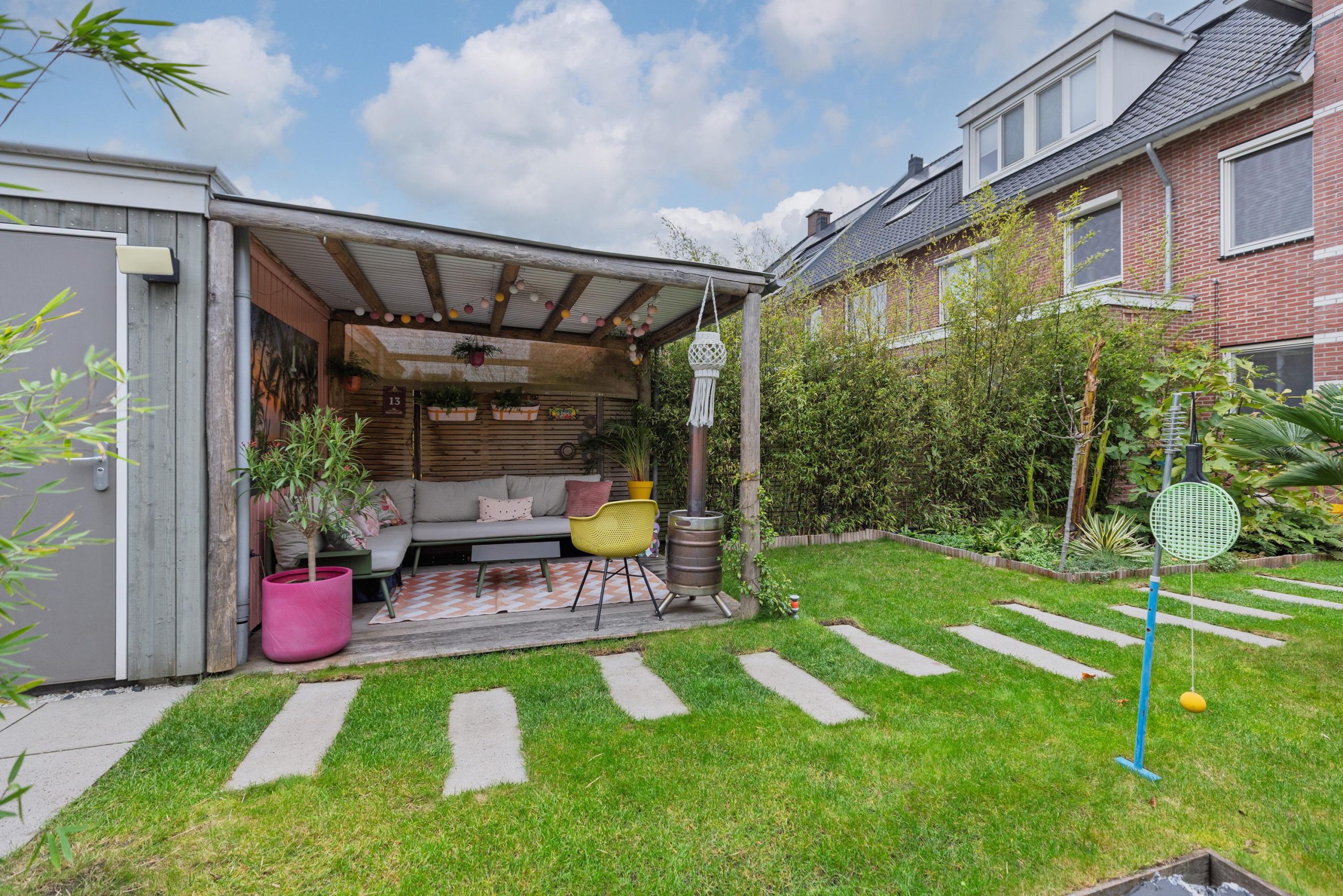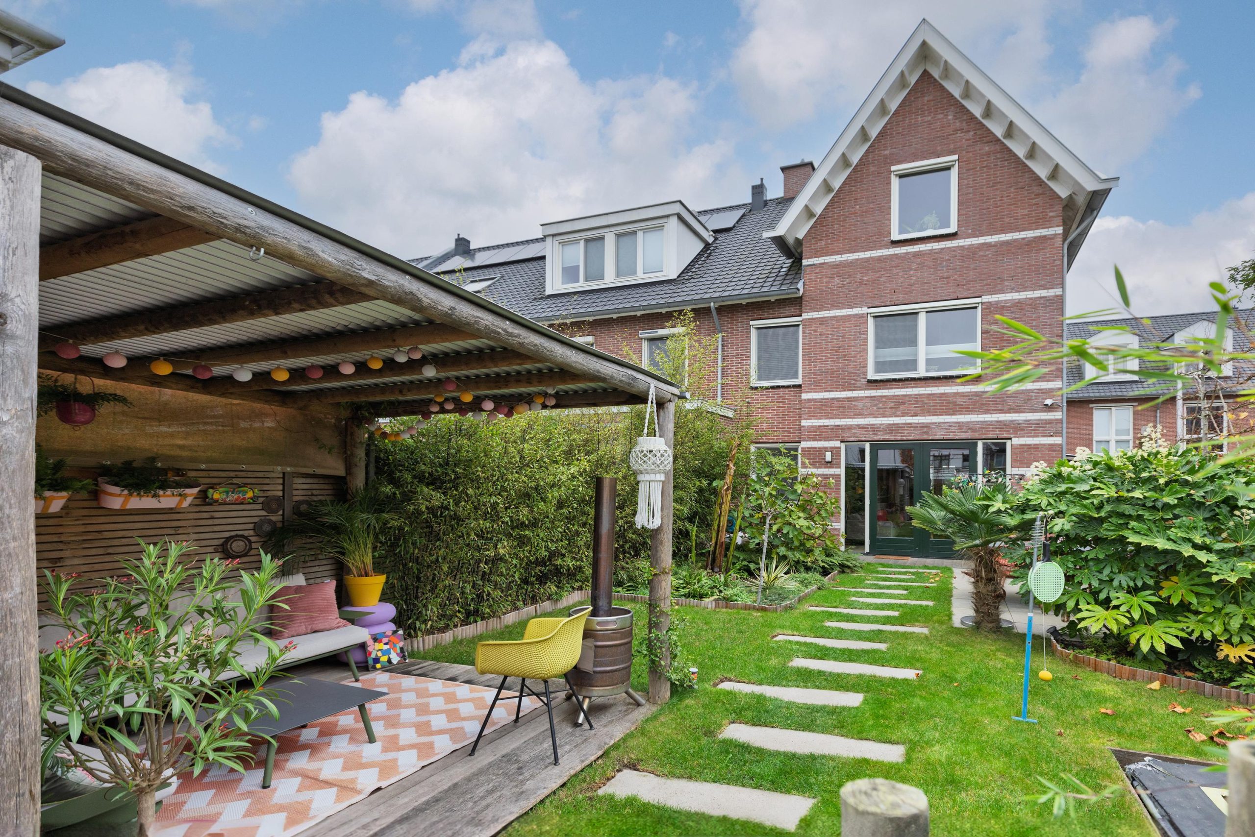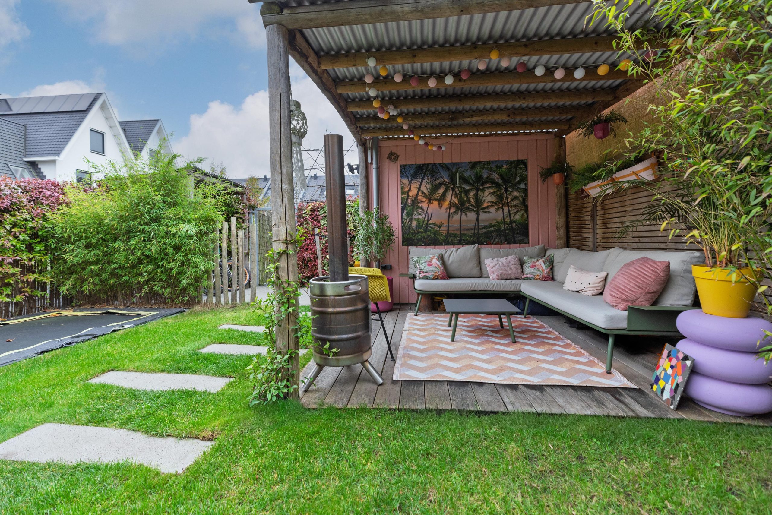Buitenruimte, overkapping en berging: De woning beschikt over een voor-/ en zijtuin en een circa 13 meter diepe achtertuin, welke gelegen is op het westen. In de tuin bevindt zich een veranda. Hier is het echt genieten. Er is een berging (5 m²) voorzien van elektra en twee aparte overkappingen, handig voor de fietsen. Natuurlijk is er een achterom.