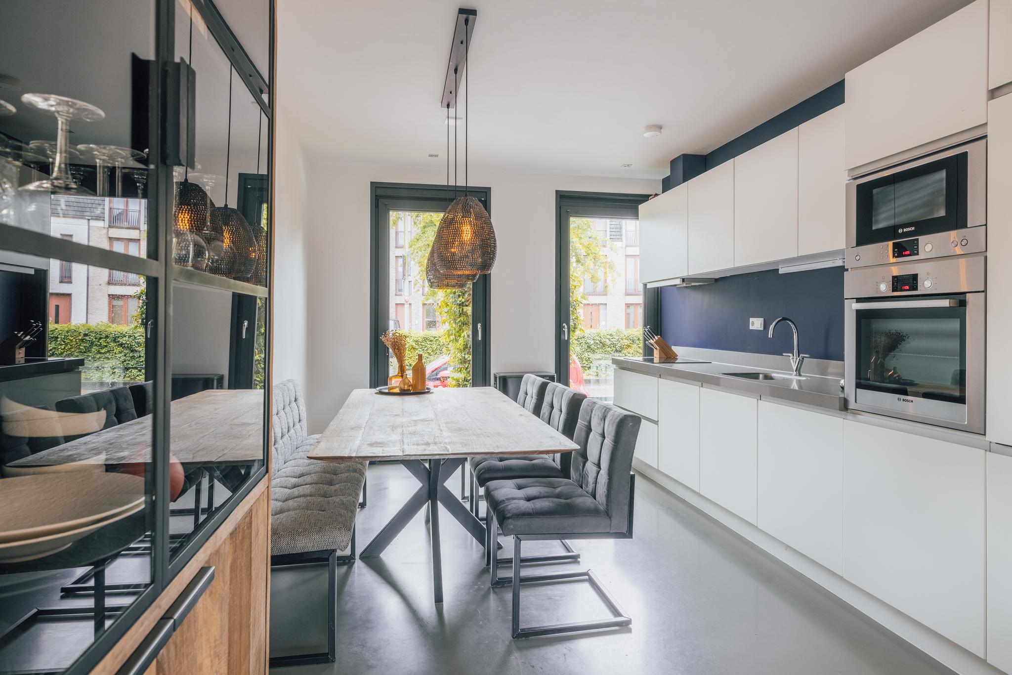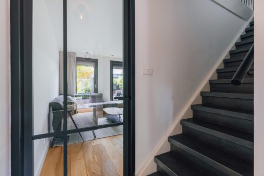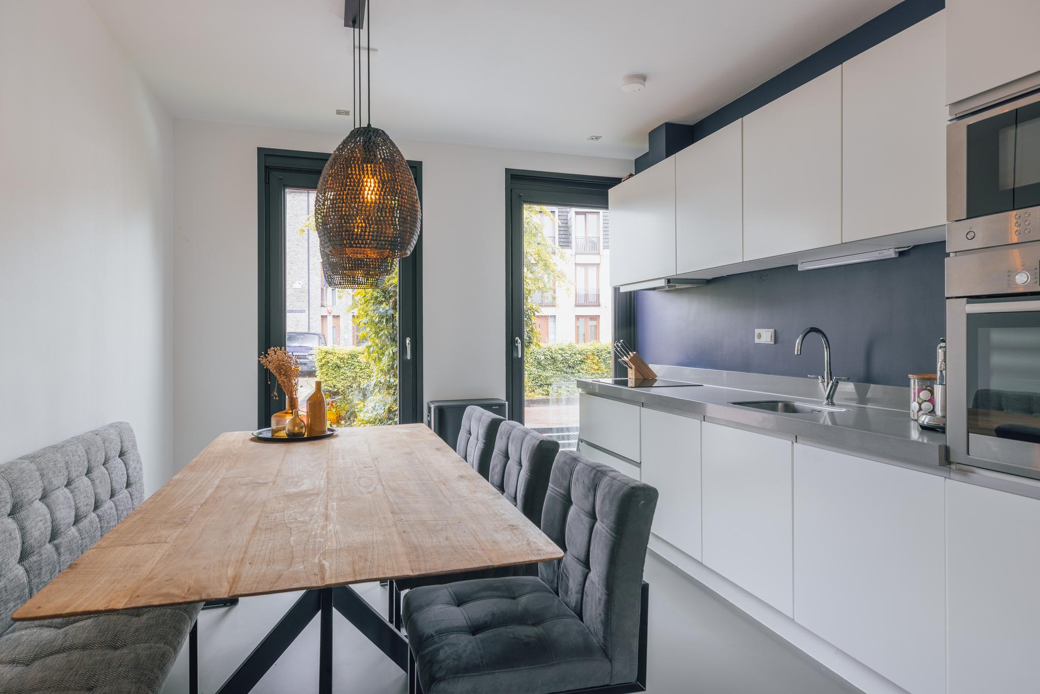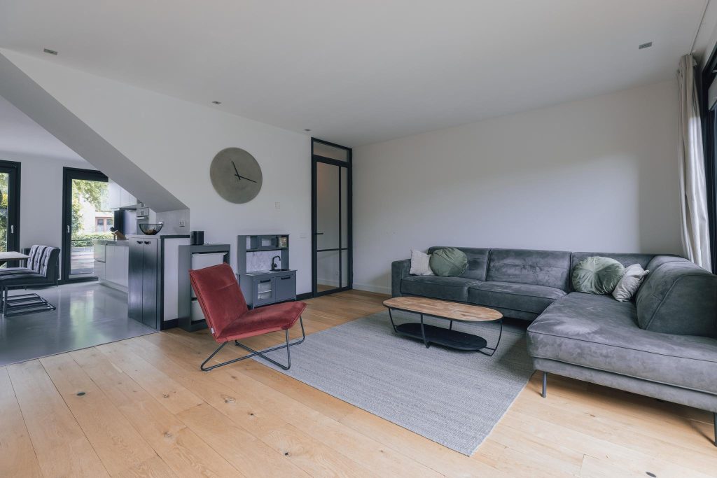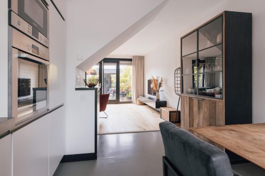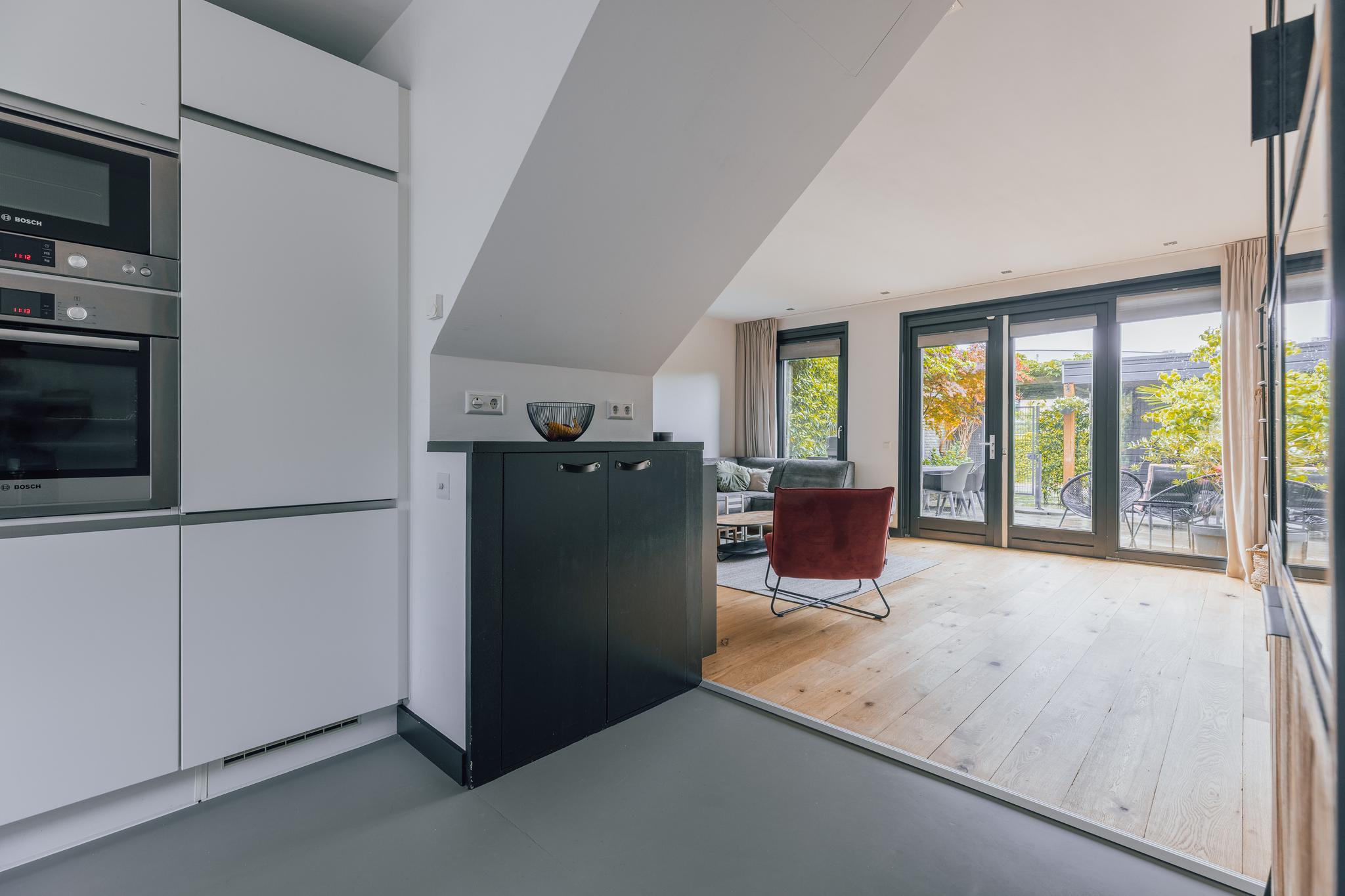 Entree met hal, garderobe, meterkast en een toilet met fontein. De trap is in 2021 opnieuw bekleed. Vanuit de hal kom je in de lichte woonkamer met houten vloer en openslaande deuren naar de tuin. Aansluitend vind je de moderne keuken, afgewerkt met een gietvloer en voorzien van alle benodigde inbouwapparatuur: een vaatwasser (2025), inductiekookplaat, afzuigkap, koel-/vriescombinatie, combimagnetron en voldoende kastruimte.