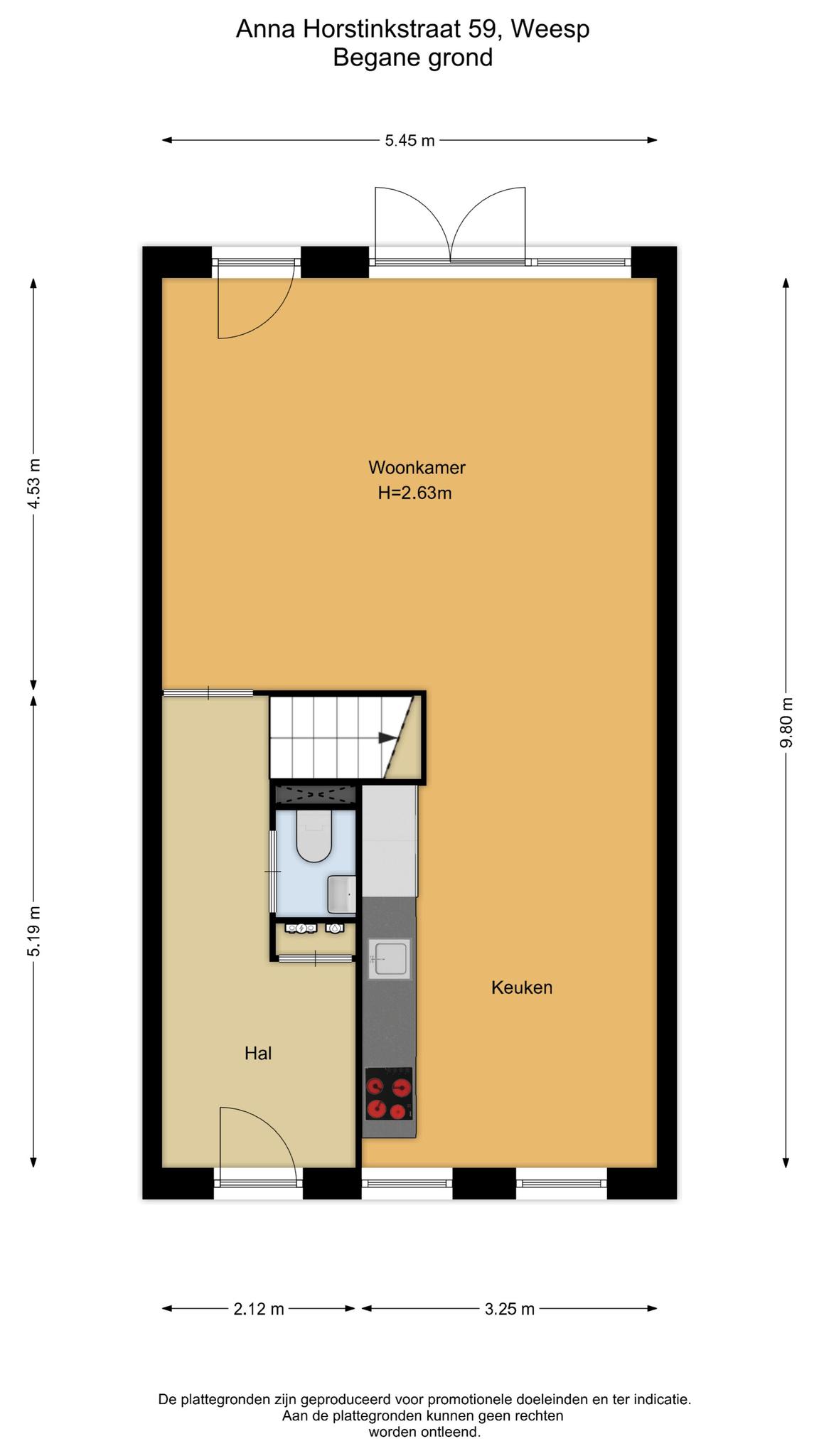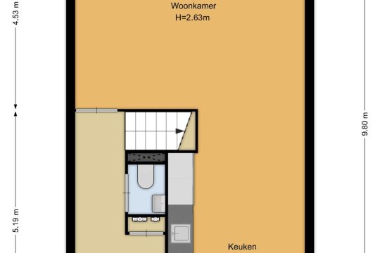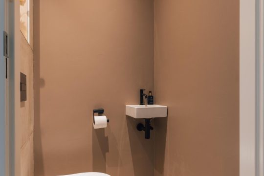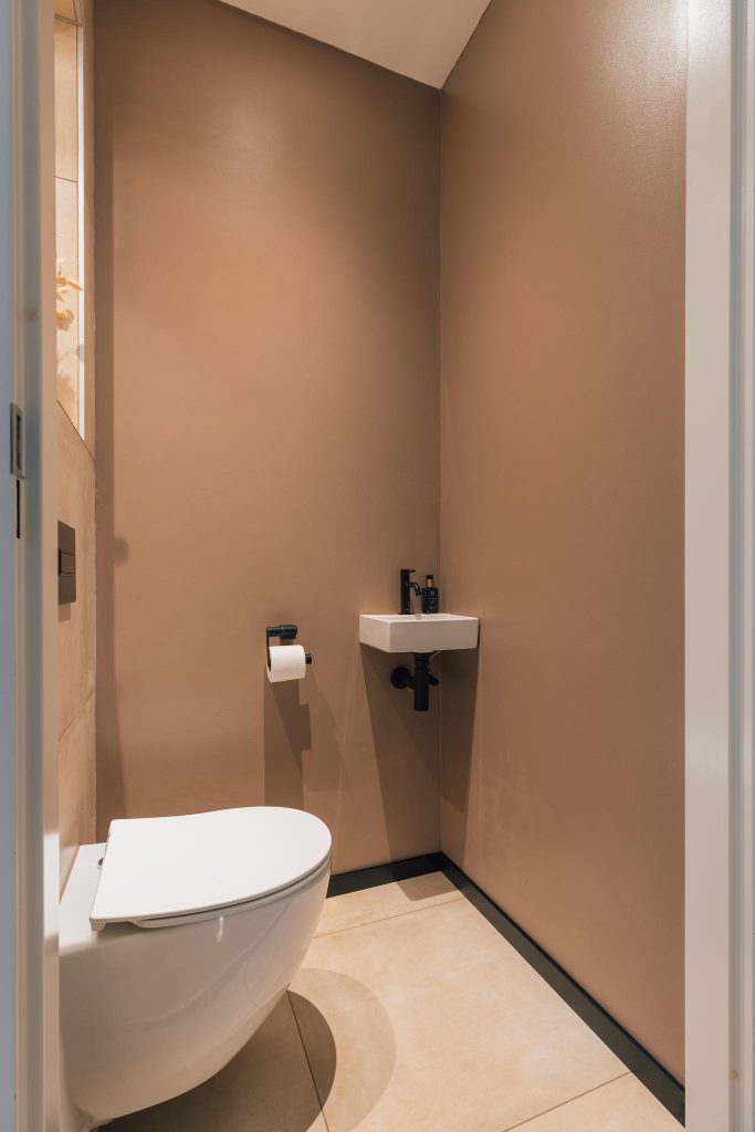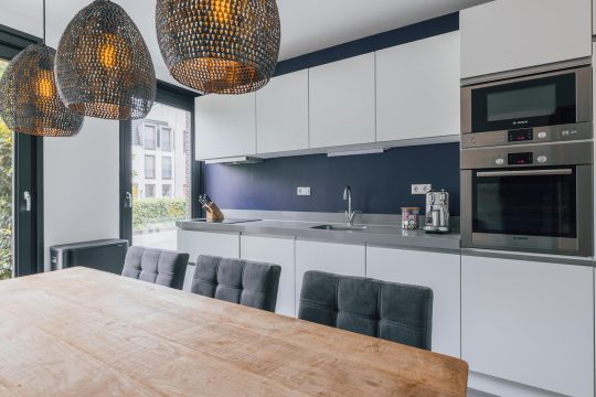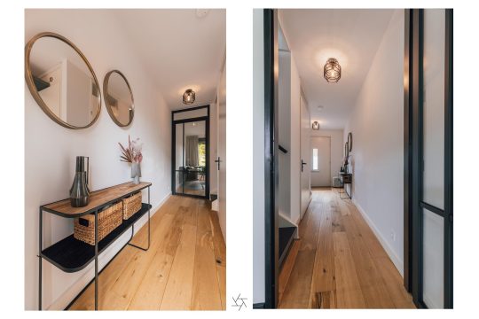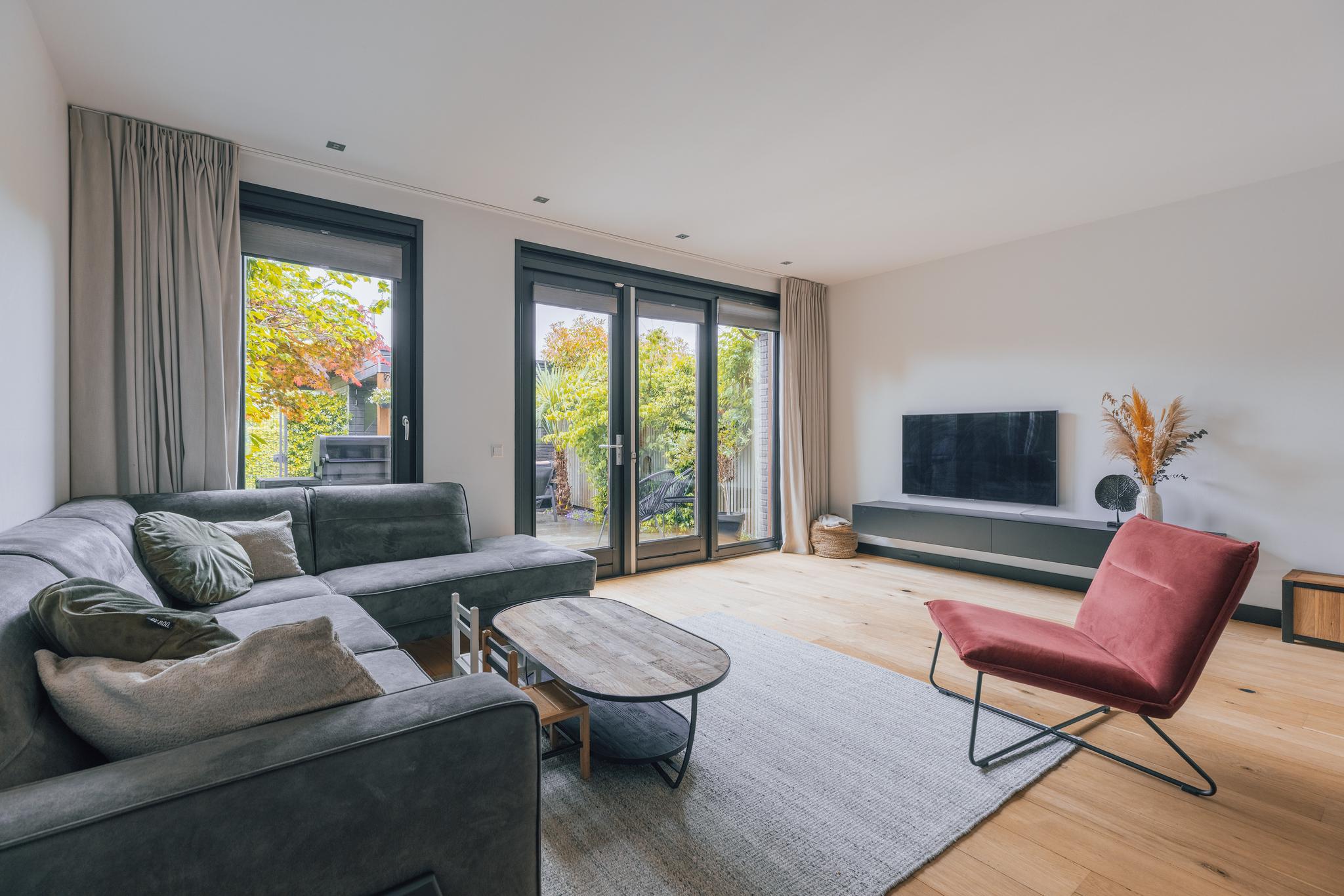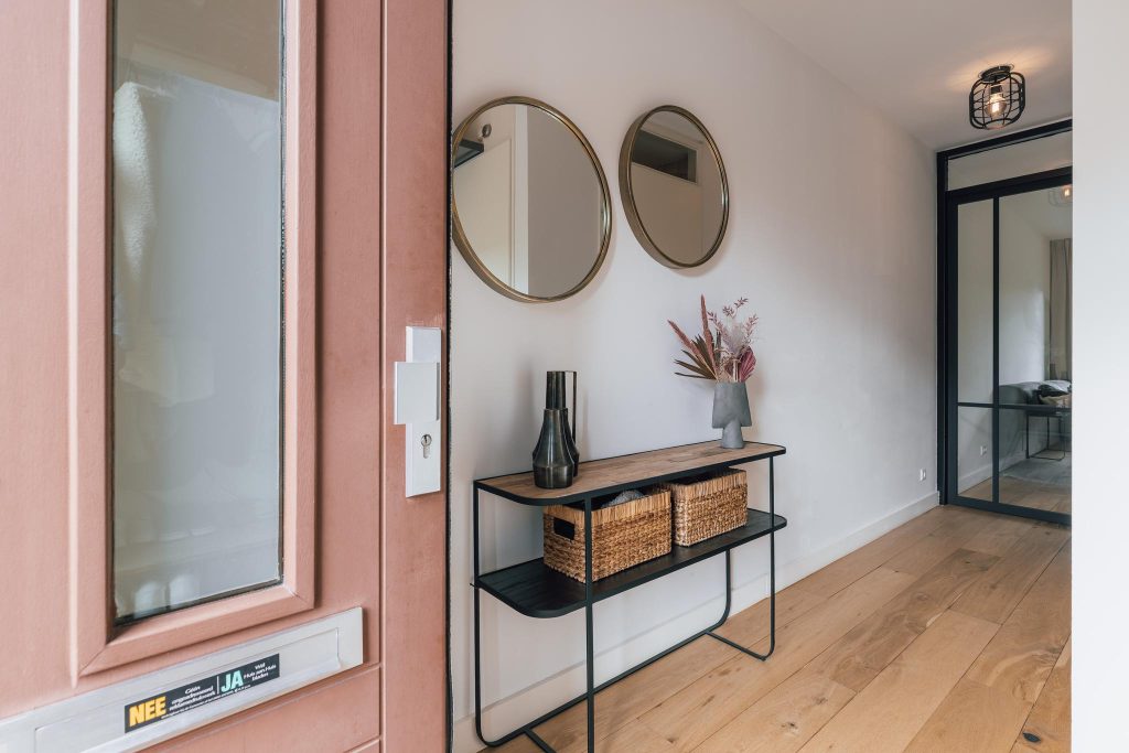 Entree met hal, garderobe, meterkast en een toilet met fontein. De trap is in 2021 opnieuw bekleed. Vanuit de hal kom je in de lichte woonkamer met houten vloer en openslaande deuren naar de tuin. Aansluitend vind je de moderne keuken, afgewerkt met een gietvloer en voorzien van alle benodigde inbouwapparatuur: een vaatwasser (2025), inductiekookplaat, afzuigkap, koel-/vriescombinatie, combimagnetron en voldoende kastruimte.