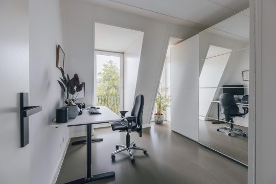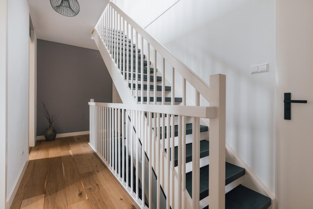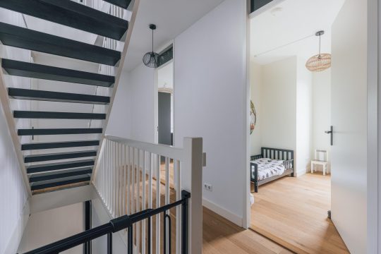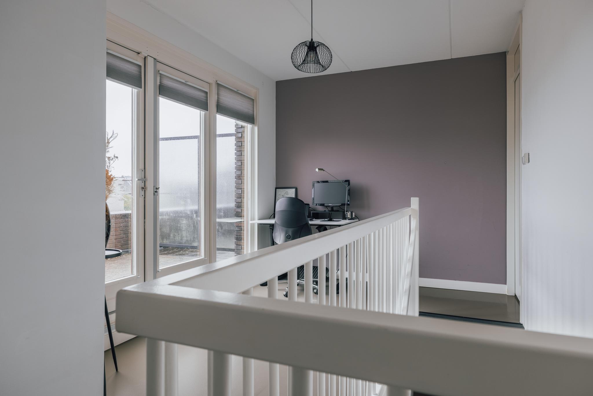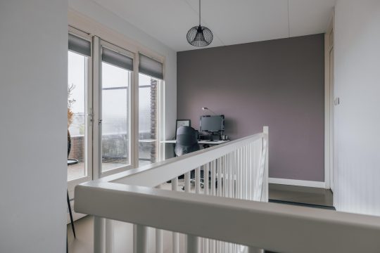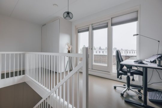 Vanaf de overloop de opgang naar de tweede verdieping voorzien van gietvloer. De ruime voorzolder met vaste kasten is perfect als studie/-werkruimte en geeft ook toegang tot het heerlijke dakterras van 13 m².