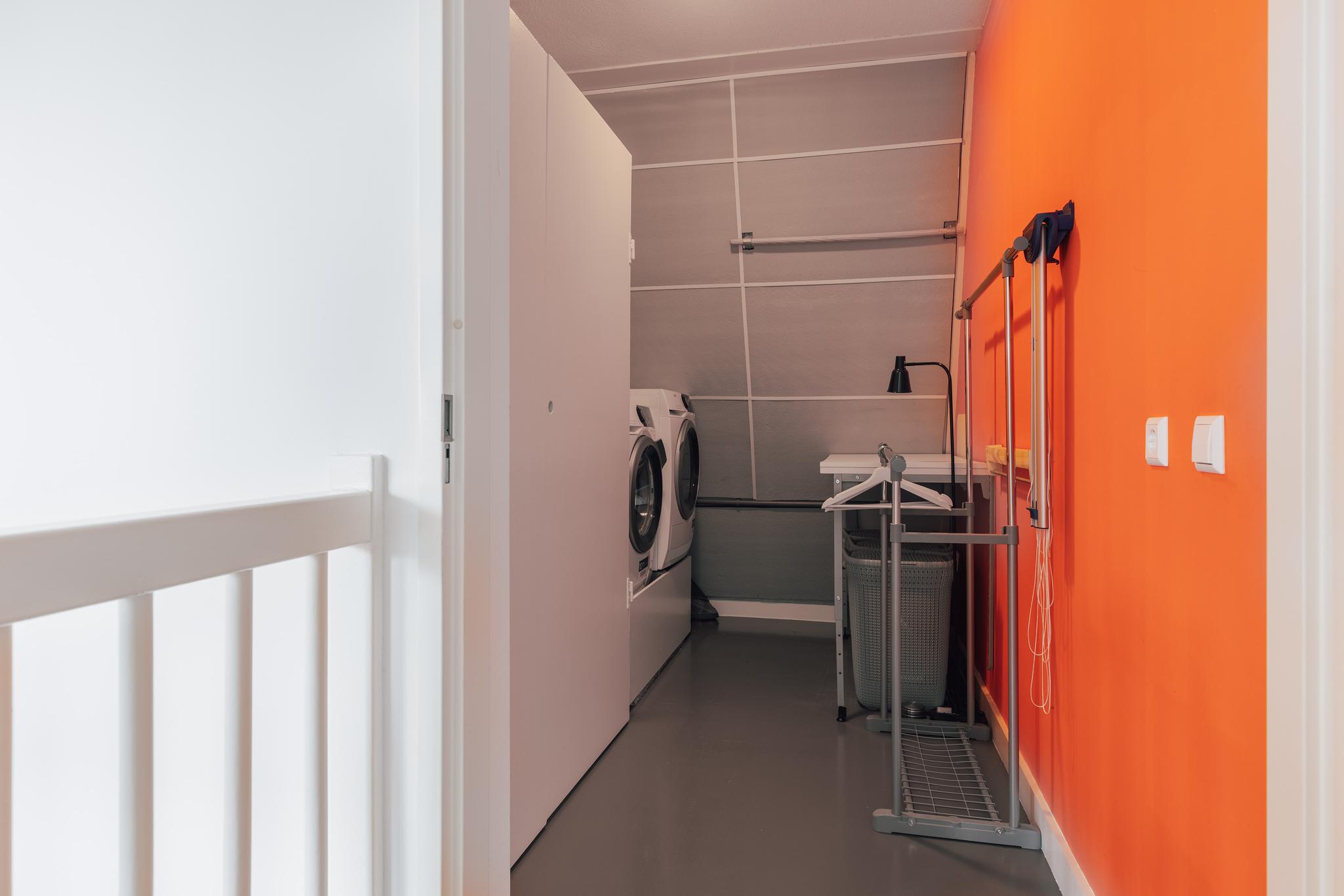 Verder bevindt zich op deze verdieping nog de ruime was-/bergruimte voor het opbergen van spullen. De opstelling van de warmtepomp, mechanische ventilatie (2024), wasmachine en droger.