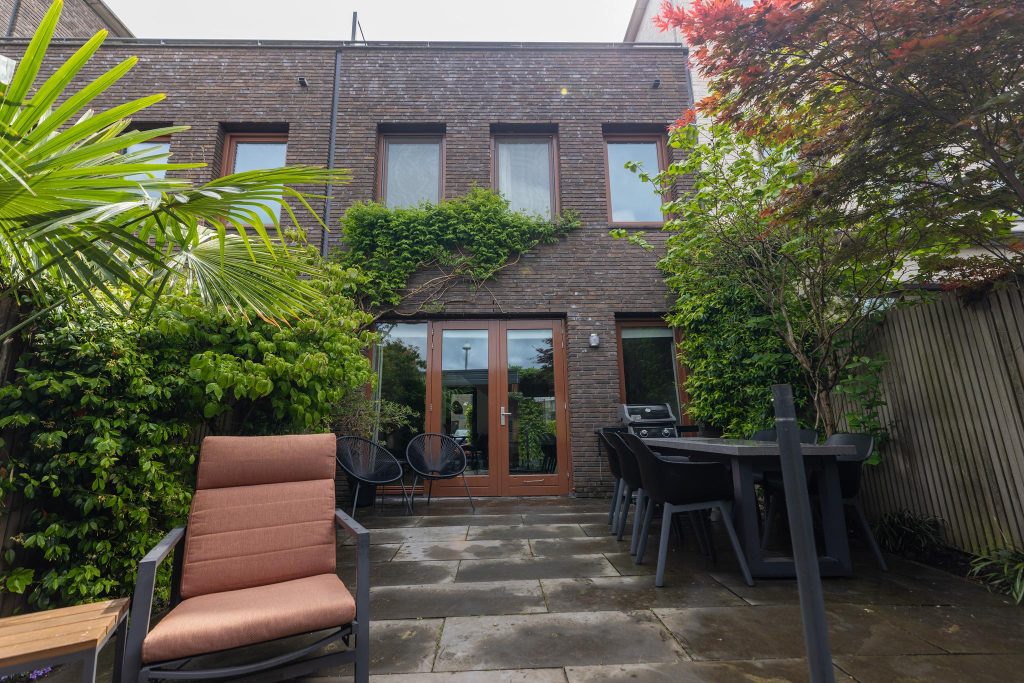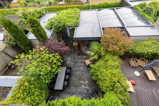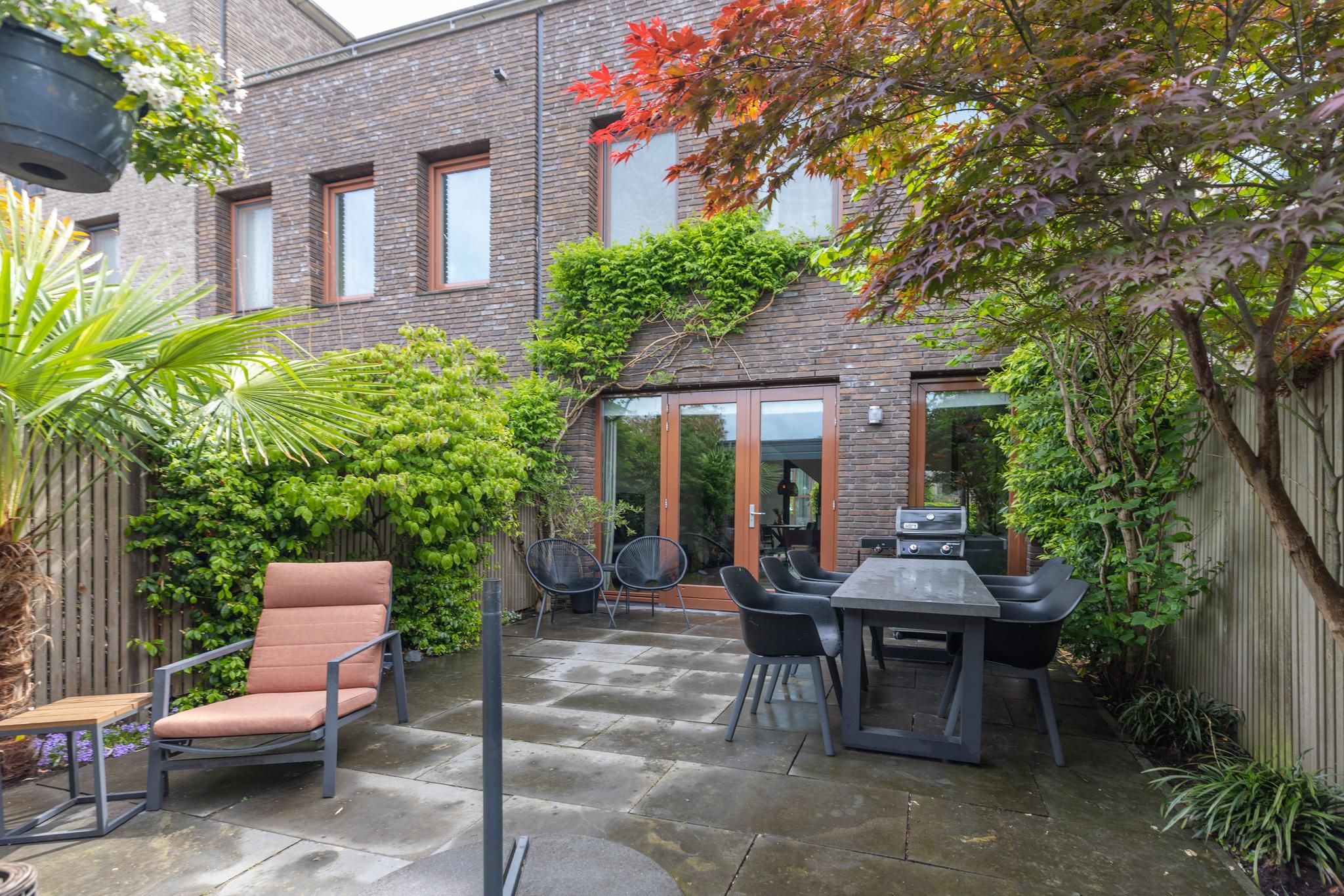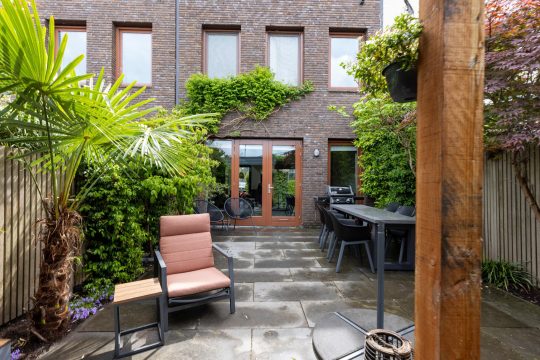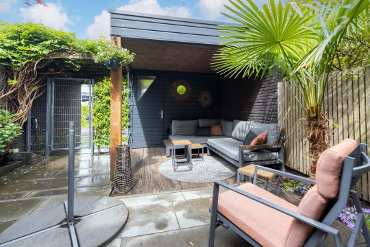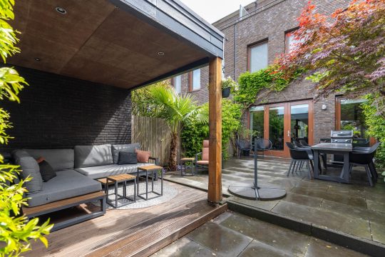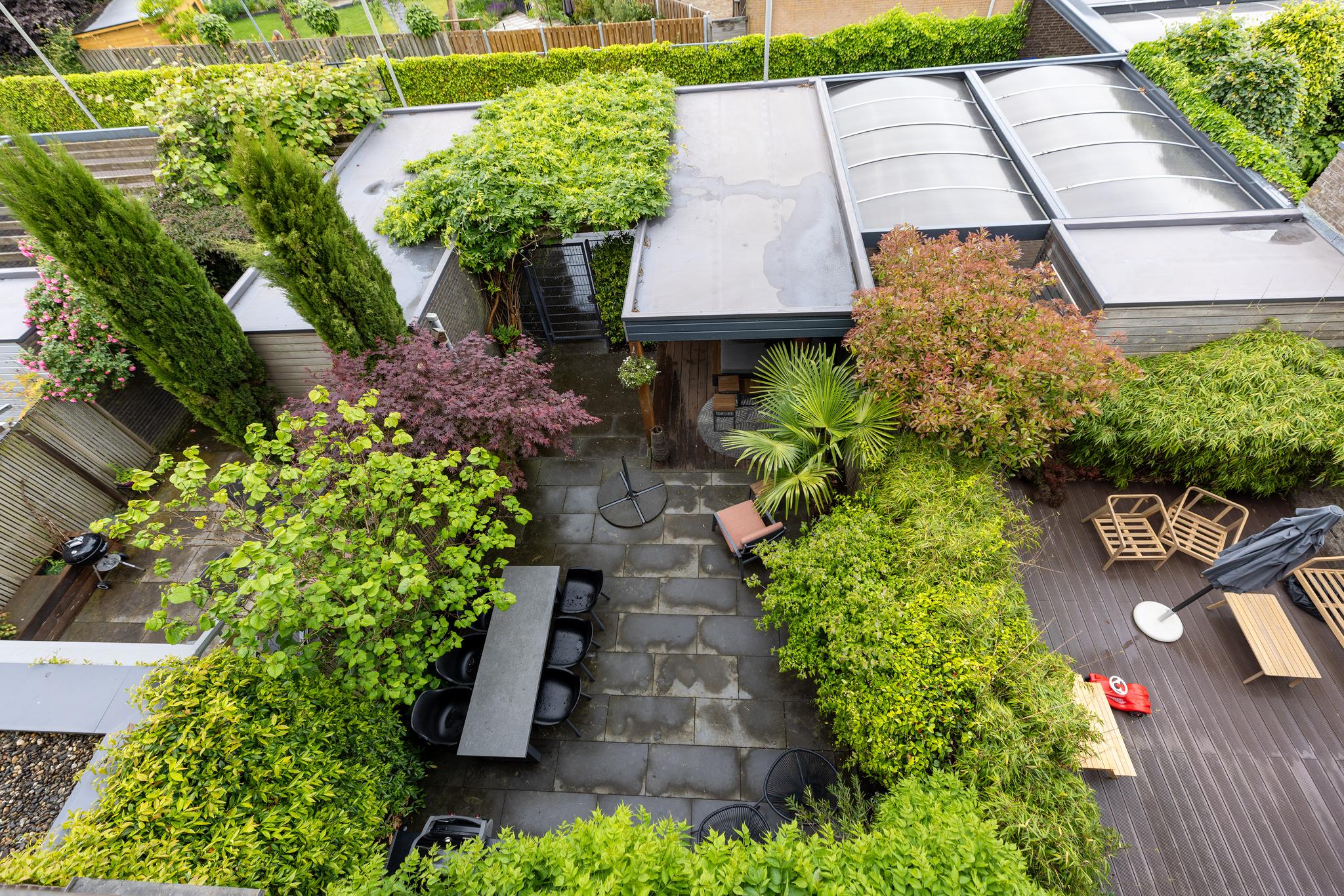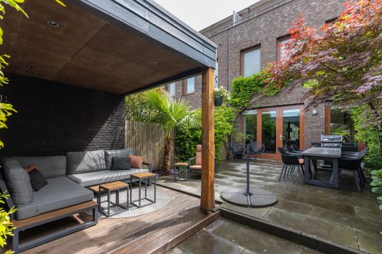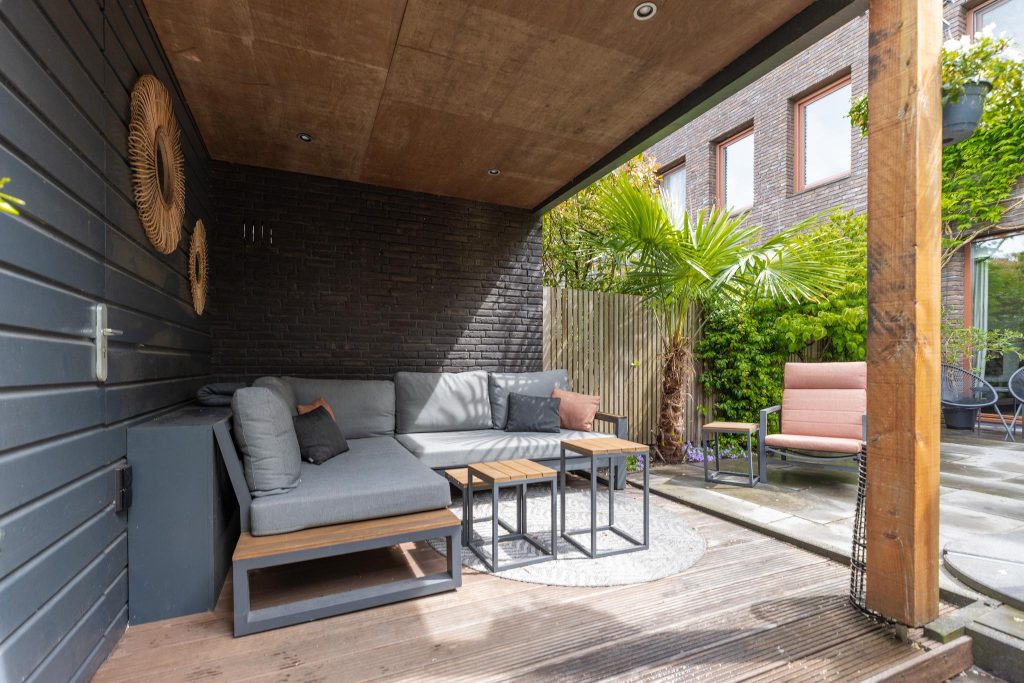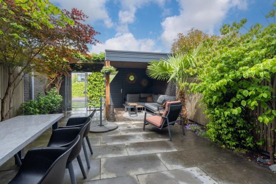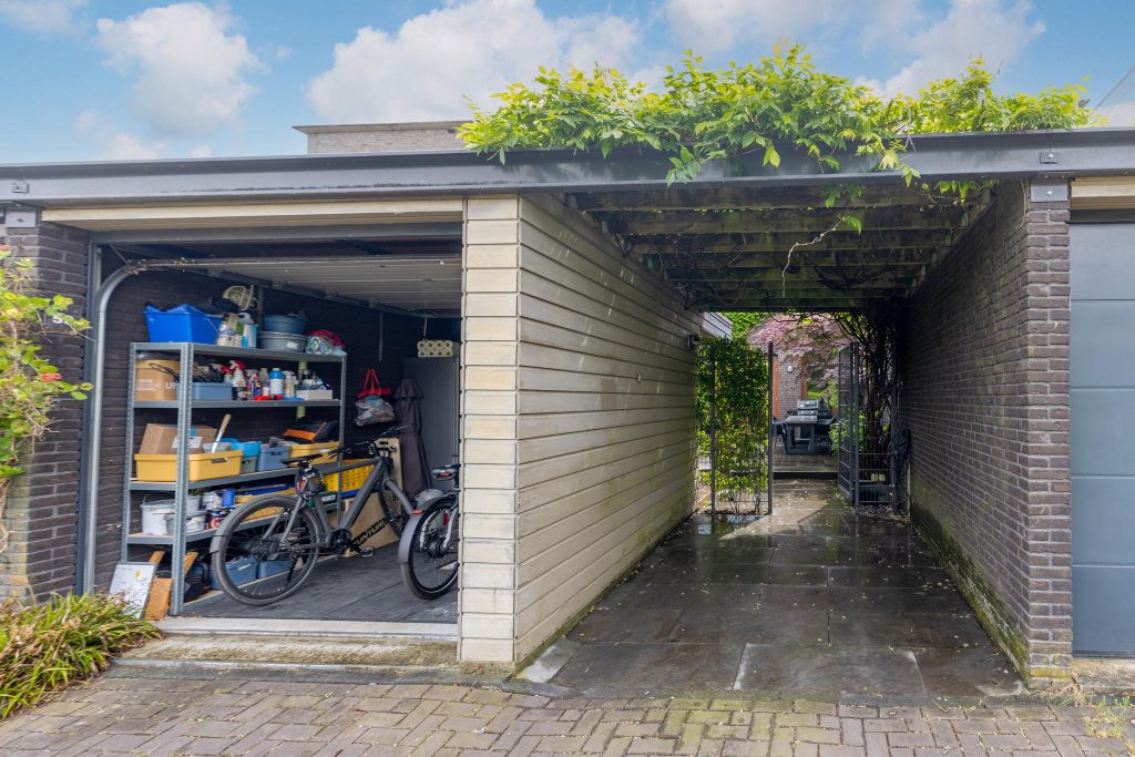 De bijna 9 meter diepe achtertuin is gelegen op het noordwesten en grenst, middels een af te sluiten hek, aan de eigen parkeerplaats en deze dient gelijk als achterom. De parkeerplaats heeft een oplaadpunt voor elektrisch opladen. Er is een zeer ruime berging (voorheen garage) van 13 m² voorzien van elektra en een grote elektrische deur. Aan de berging is een mooie overkapping met spotjes gemaakt. Ideaal om lekker te zitten met familie en vrienden.
