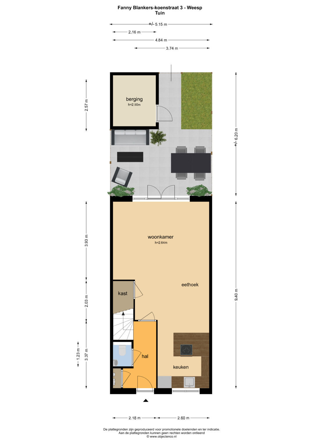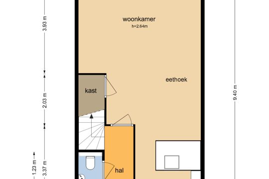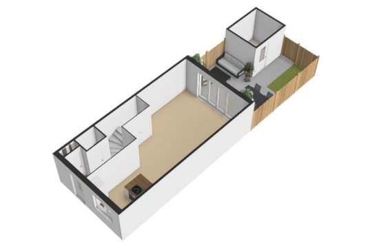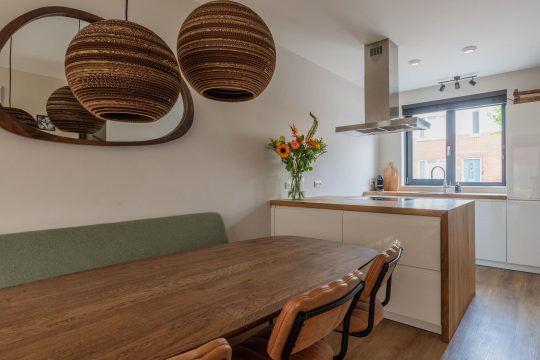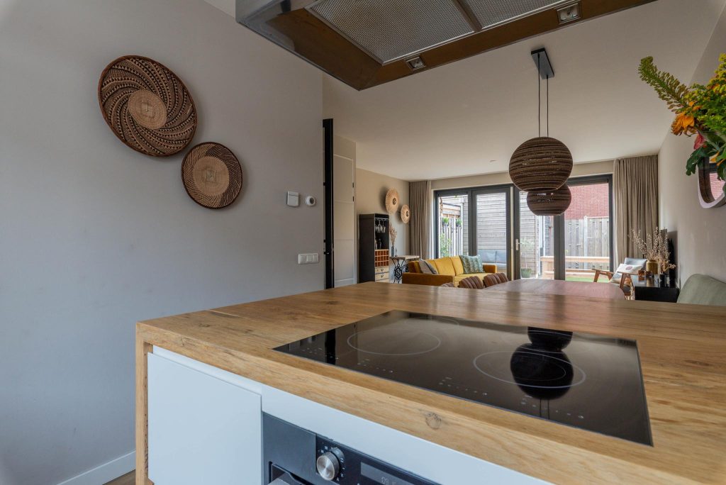 Entree met hal, meterkast en modern, vrijhangend toilet. Aan de voorzijde bevindt zich de open keuken met een stijlvol schiereiland, eikenhouten werkblad en hoogwaardige inbouwapparatuur zoals een Quooker, vaatwasser, combi-oven, inductiekookplaat, afzuigkap en koel-vriescombinatie. De lichte woonkamer met openslaande deuren naar de tuin biedt veel leefruimte en is voorzien van een ruime trapkast. De achtertuin, gelegen op het zuiden, beschikt over een achterom en een ruime berging.