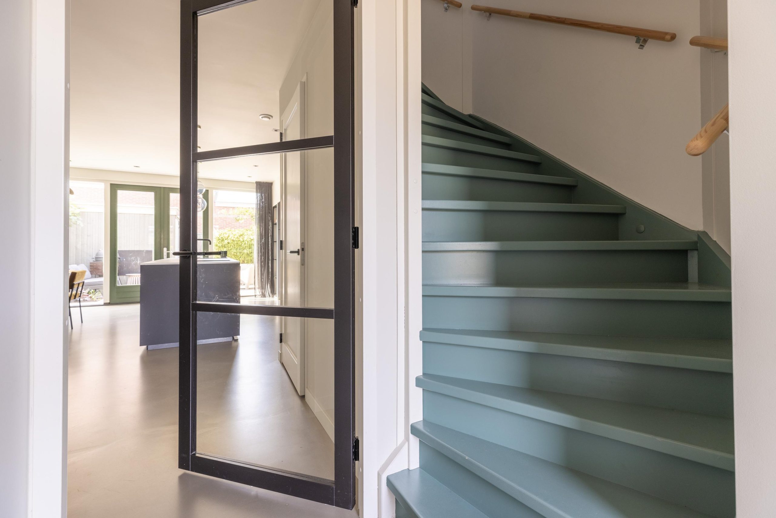 Begane grond: entree, toilet met fontein, meterkast, leefkeuken met kookeiland en de benodigde inbouwapparatuur met o.a. een afwasmachine, inductiekookplaat met geïntegreerd afzuigsysteem, koel-/vriescombinatie, combi-oven en stoomoven. De woonkamer aan de voorzijde van de woning, openslaande deuren naar de tuin met schuur en achterom op het noordwesten.