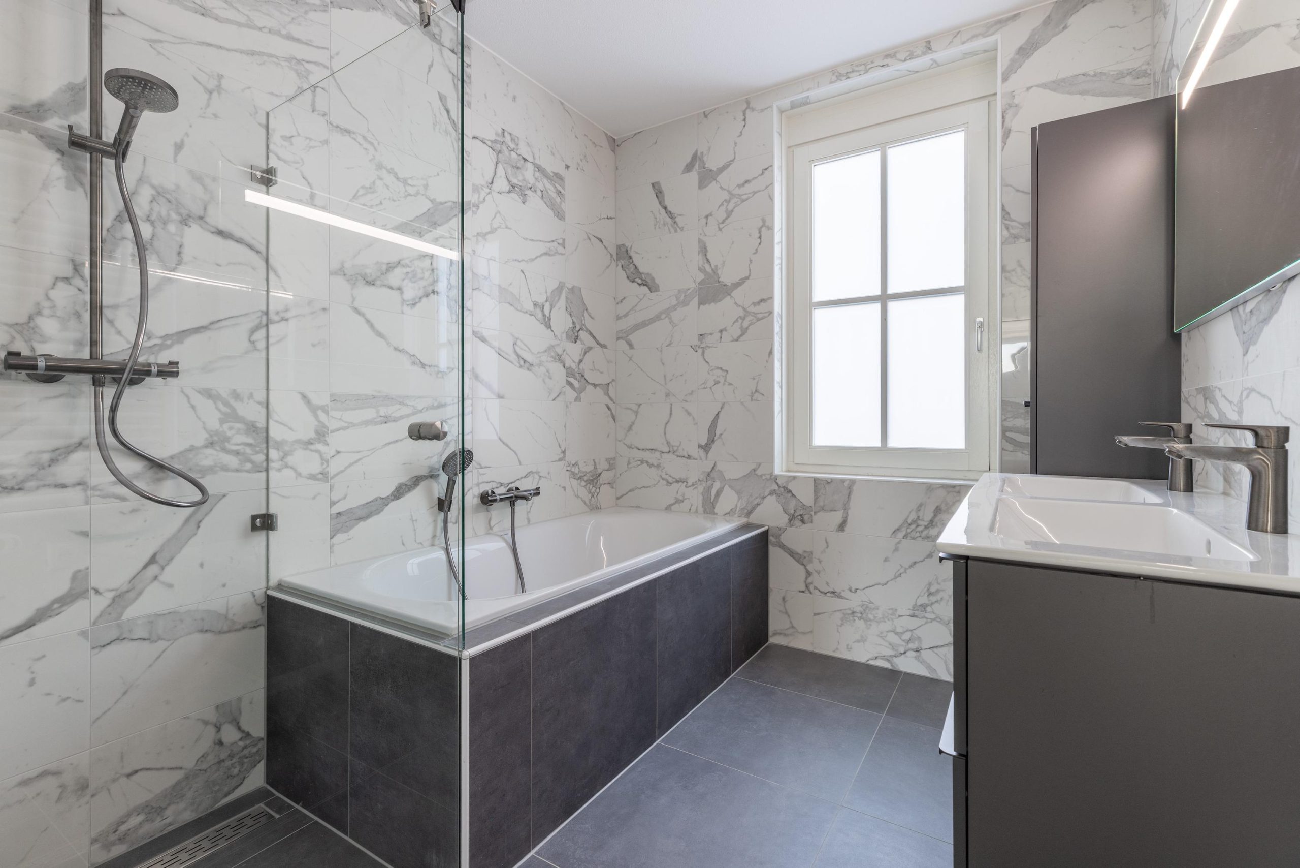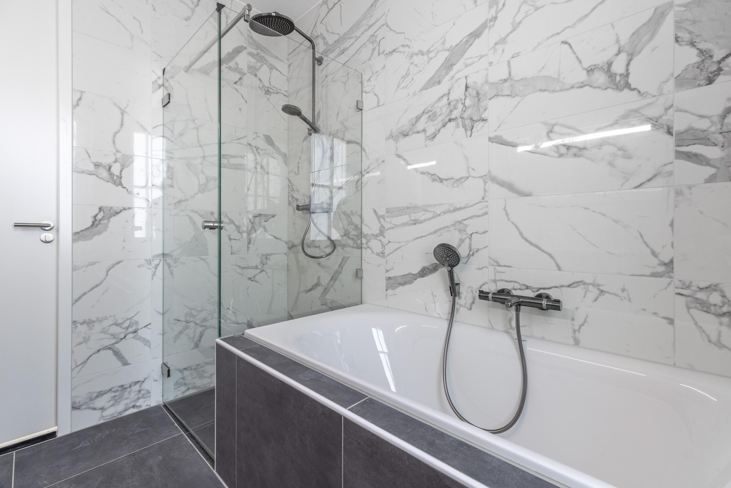 Eerste verdieping: Overloop met drie in grootte variërende lichte slaapkamers. De luxe badkamer met daglicht is voorzien van een ligbad, inloopdouche, wastafelmeubel met dubbele kraan en spiegel met verlichting. Er is een separaat toilet.