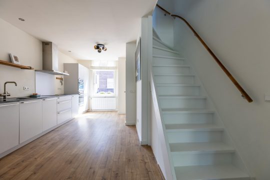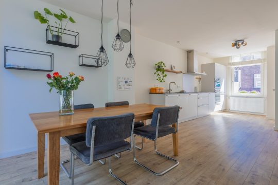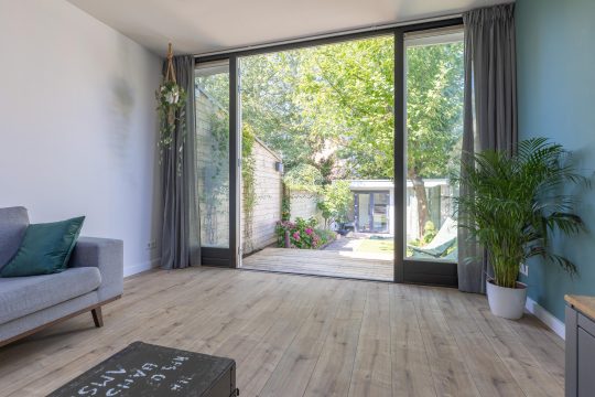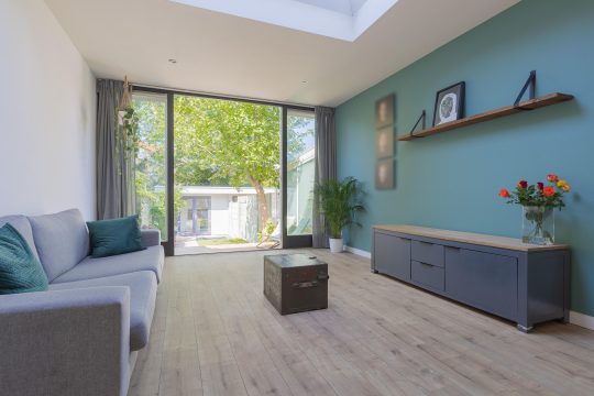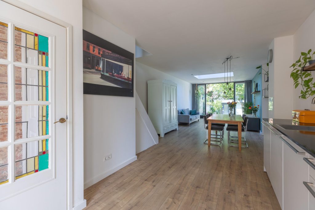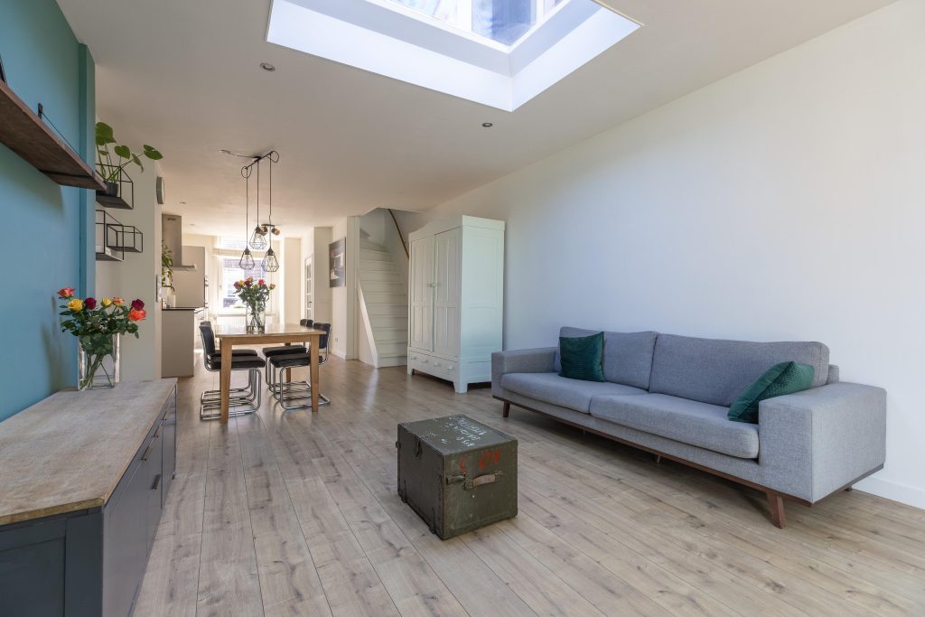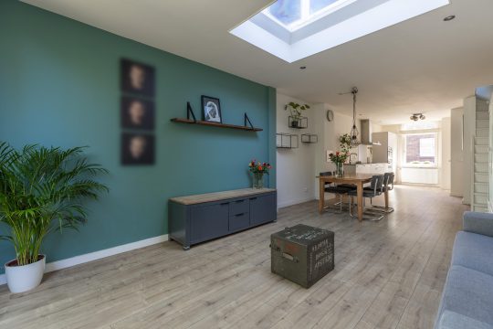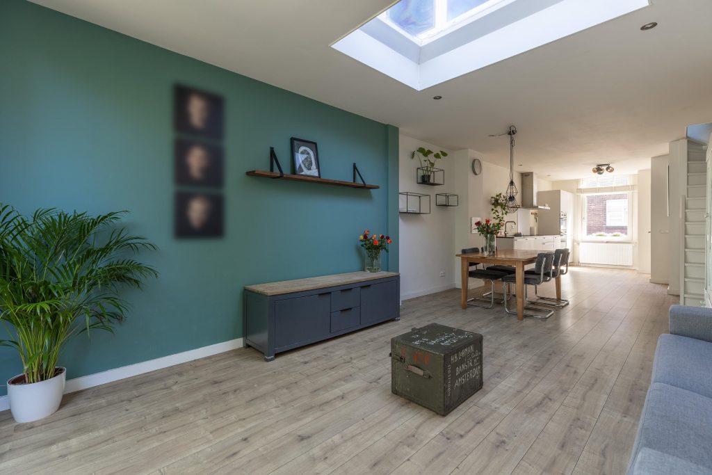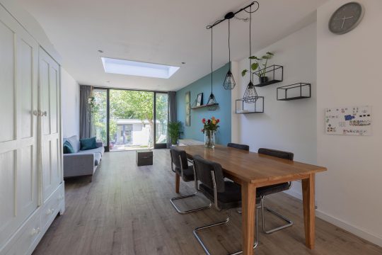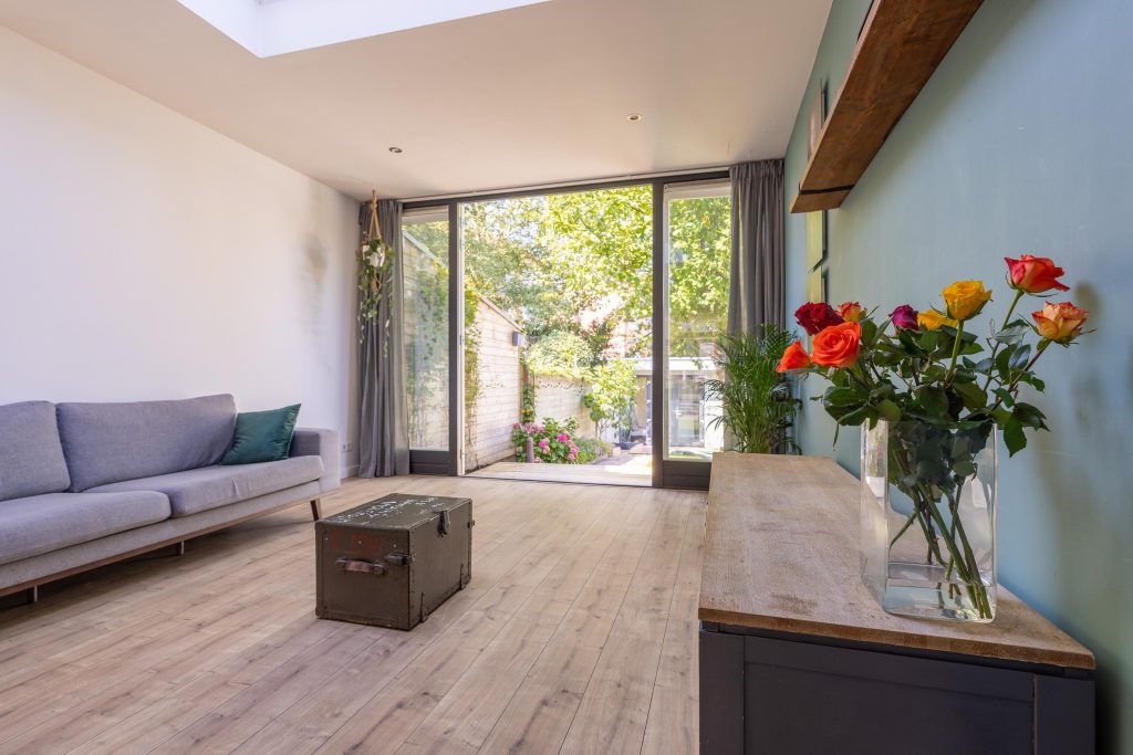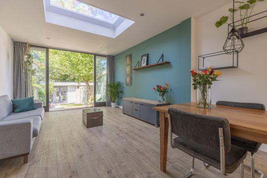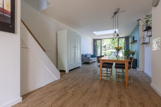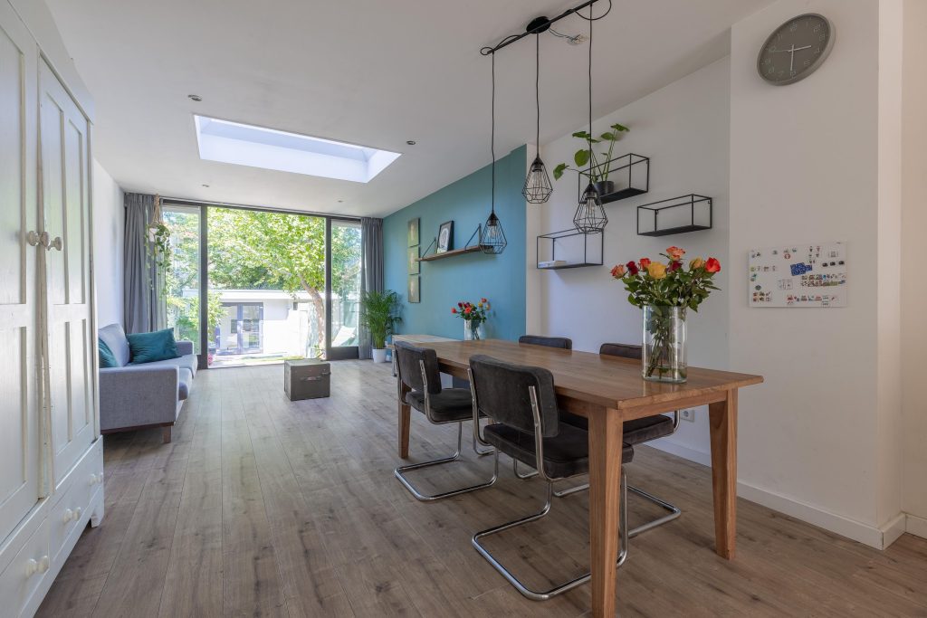 Tuingerichte en uitgebouwde woon-/eetkamer met praktische trapkast en in de uitbouw een groot daklicht en grote pui met openslaande deuren (2018) naar de achtertuin.