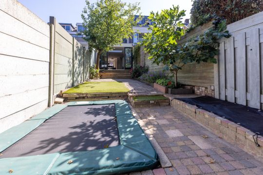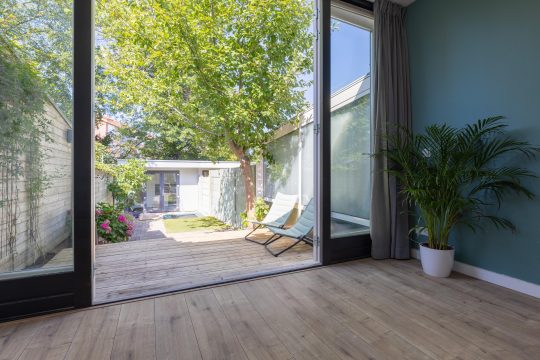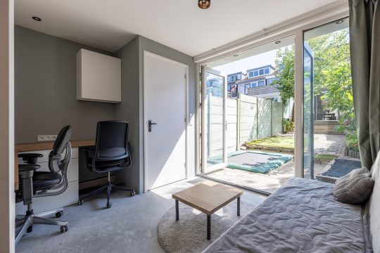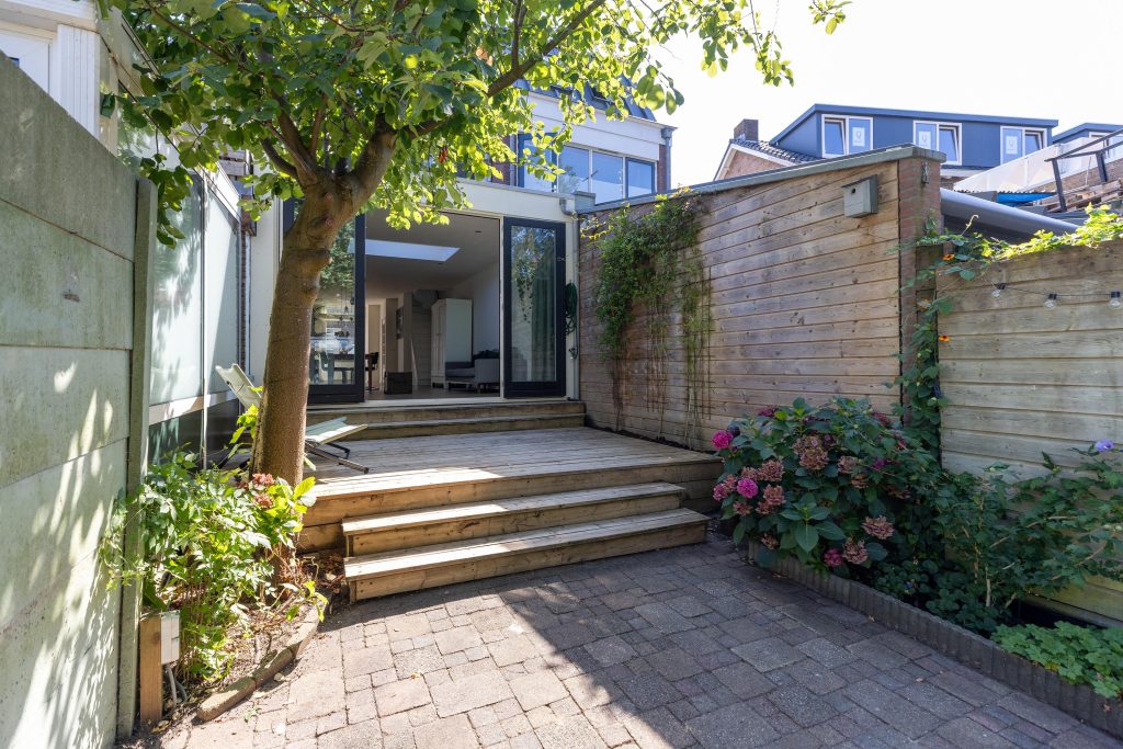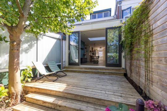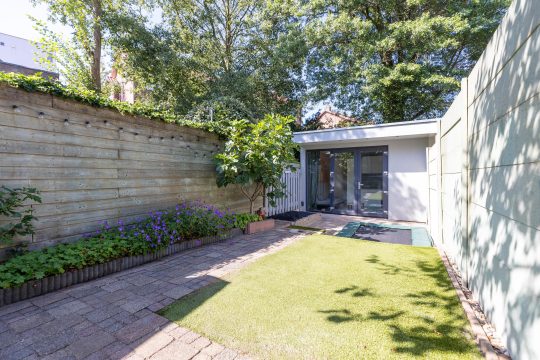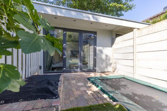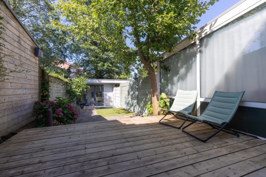 Vanuit de uitgebouwde woonkamer loop je via een mooi vlonderterras de tuin in. Wat een verrassing: een circa 17 meter diepe tuin met veel privacy achter de woning. Elektrapunten en kraantje, grote zandzak en trampoline aanwezig. Achterin de tuin staat het ruime en geïsoleerde bijgebouw van 12 m². Deze ruimte met 2 openslaande deuren is te gebruiken naar wens, als atelier, werk-/ studeerruimte, ’game-/ chill room’. Het kan allemaal, er zit zelfs een toilet en koelkast in, plus een mooi ingebouwd bureau.