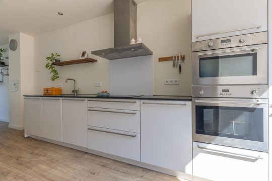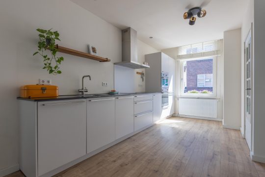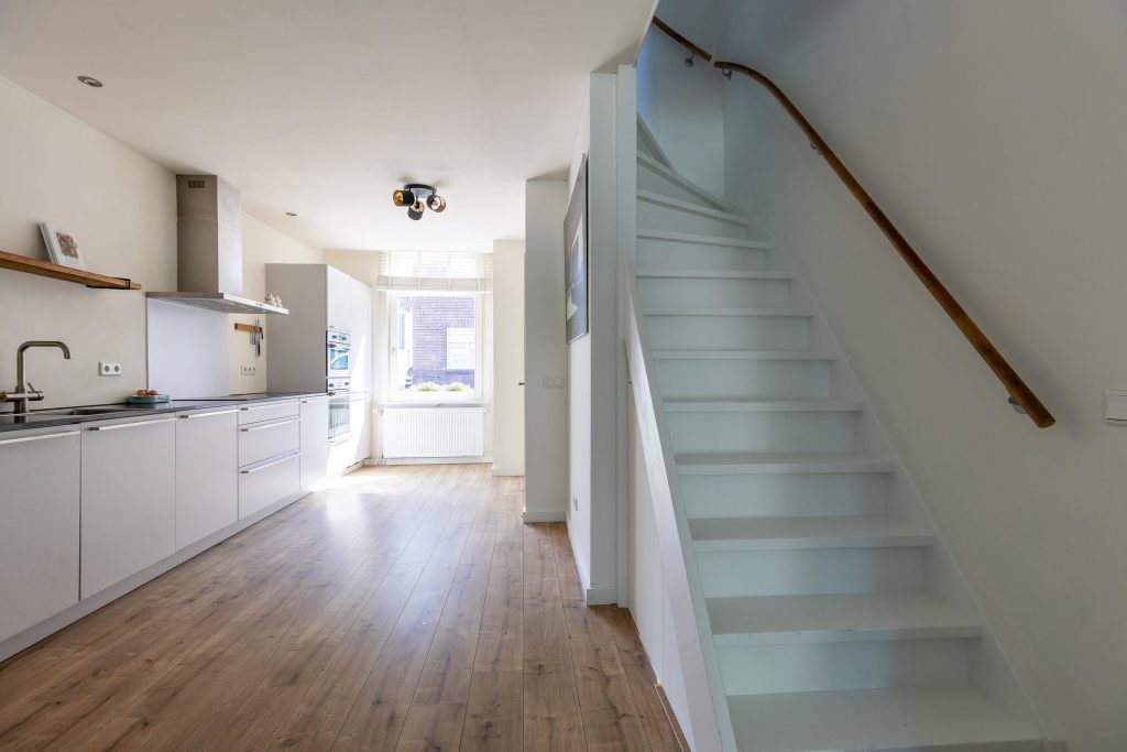 Entree, hal met originele bakstenen muur in het zicht, meterkast, toilet met fontein met hier ook een bakstenen muur en de toegang naar de lichte woon-/eetkamer. Aan de voorzijde bevindt zich de keuken (2018), voorzien van een vaatwasser, oven, combimagnetron, inductiekookplaat, afzuigkap en koel-/vriescombinatie.