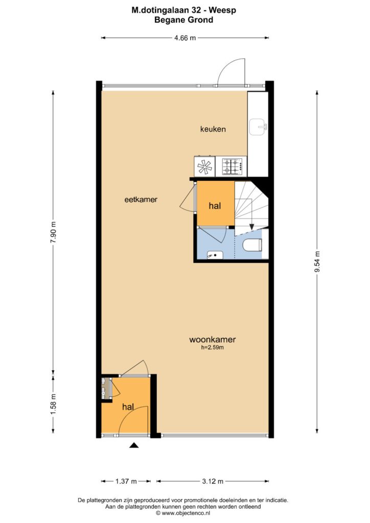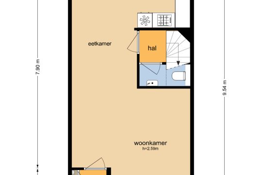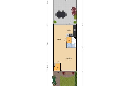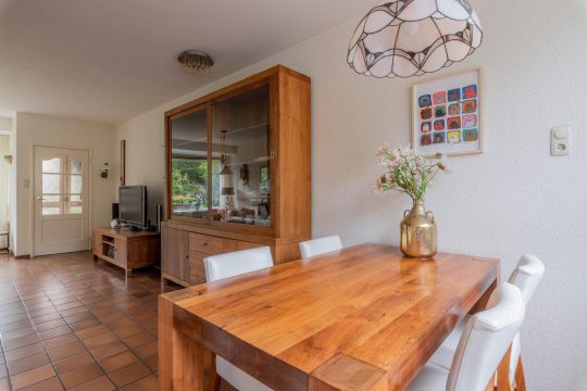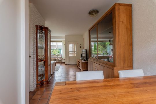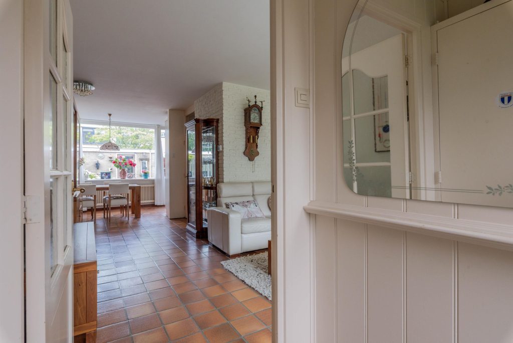 Zeer ruime voortuin, entree, hal met meterkast, royale woon-/eetkamer met aan de achterzijde de open keuken met deur naar de zonnige achtertuin. Het toilet bevindt zich in een tussenhal, waar eveneens de trap naar boven is.