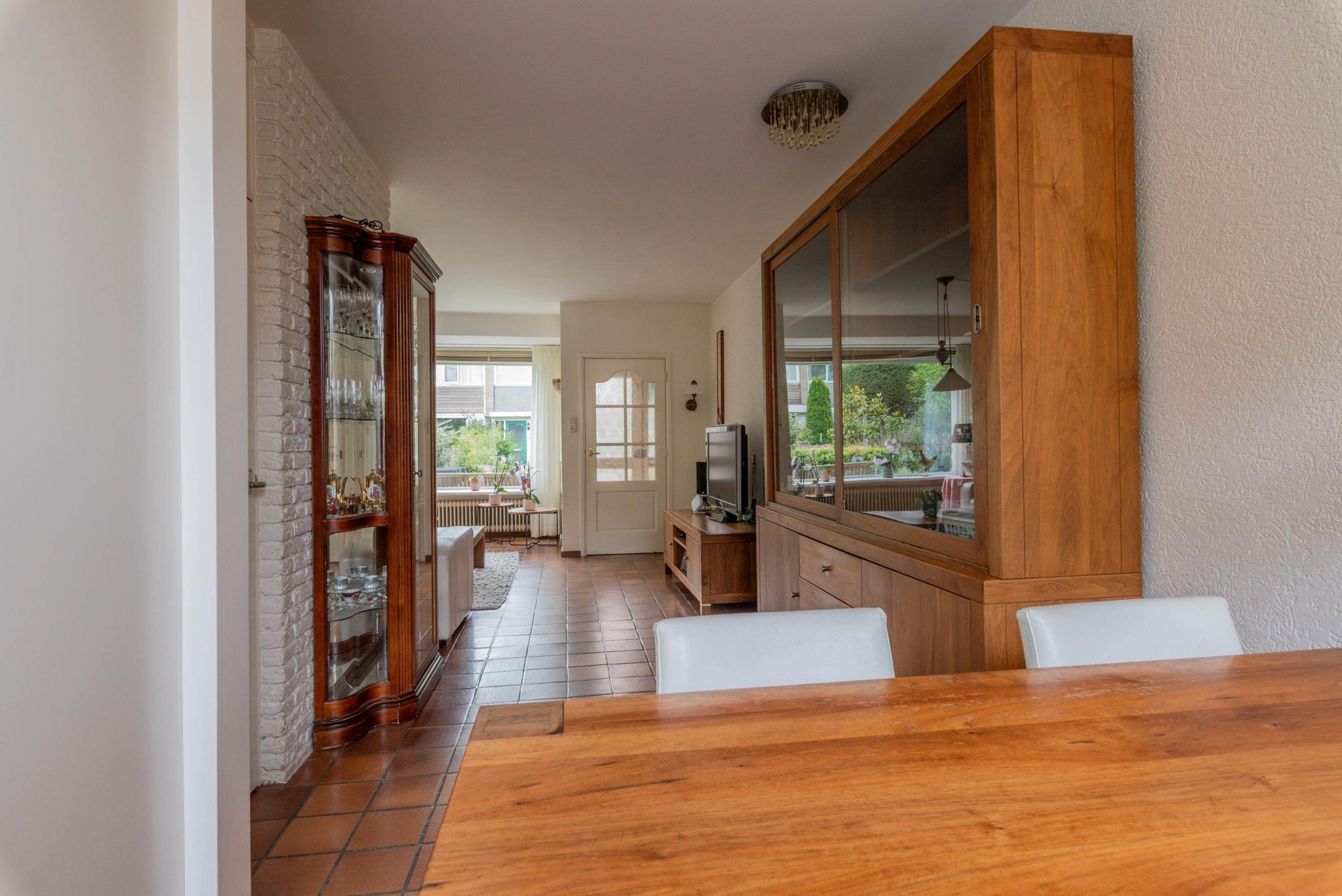 Zeer ruime voortuin, entree, hal met meterkast, royale woon-/eetkamer met aan de achterzijde de open keuken met deur naar de zonnige achtertuin. Het toilet bevindt zich in een tussenhal, waar eveneens de trap naar boven is.