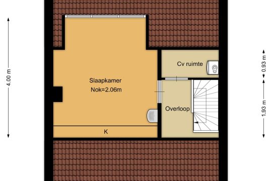 Overloop met de wasmachine aansluiting en aparte ruimte met de CV ketel, vierde slaapkamer met dakkapel, wastafel en bergruimte achter de knieschotten.