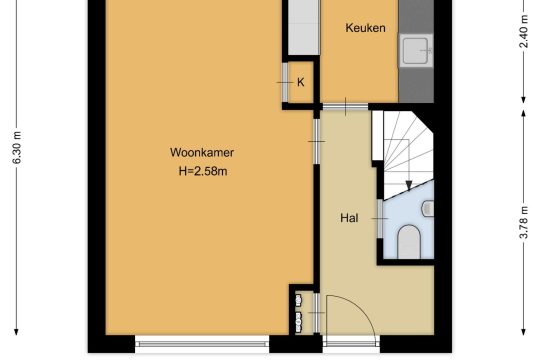 Entree met hal, meterkast, garderobehoek en toilet met fontein en trapje naar de kelder. Lichte woon-/eetkamer, eenvoudige keuken met enige inbouwapparatuur. Vanuit de keuken de toegang tot de ruime achtertuin op het noorden met schuur en achterom.