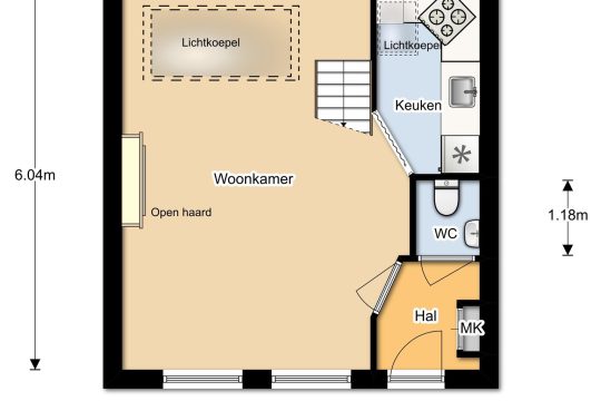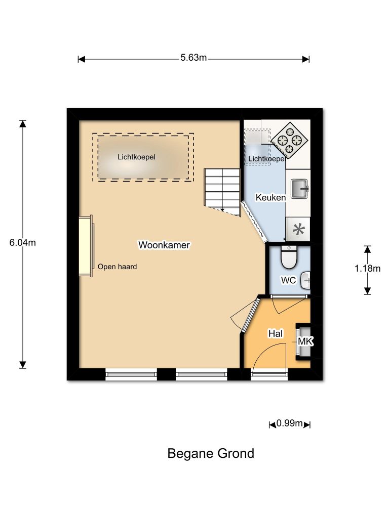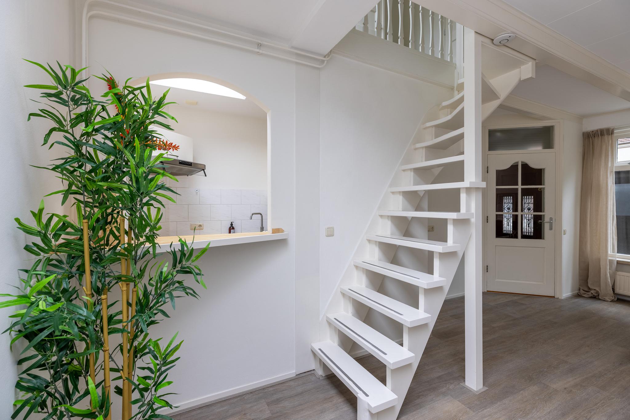 Entree, hal, toilet met fontein, ruime woonkamer met openhaard en half open keuken voorzien van 4-pits gaskookstel, koelkast, magnetron en afzuigkap. De woning is voorzien van een brede lichtkoepel, een laminaatvloer en in de keuken een plavuizenvloer.