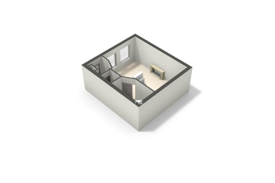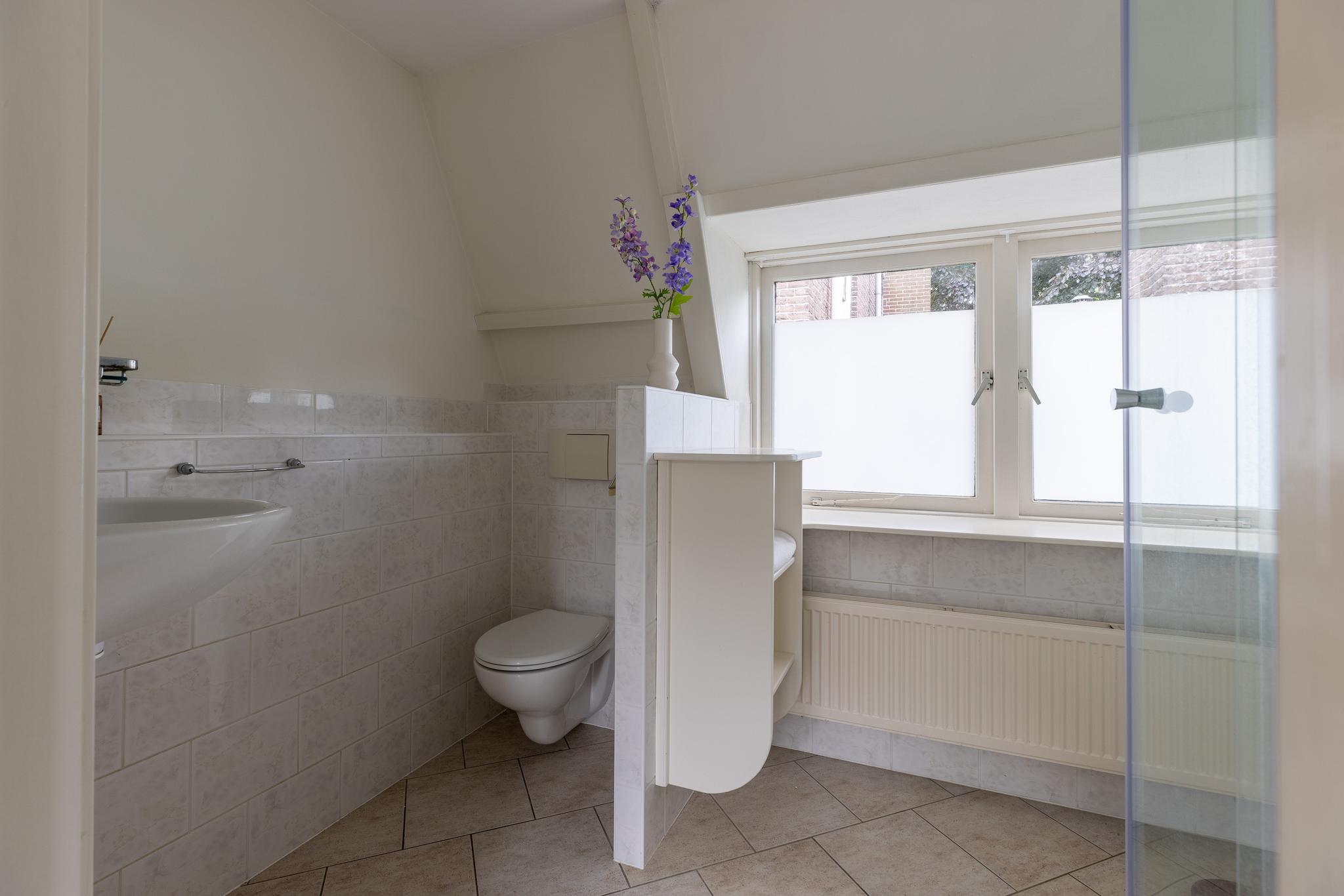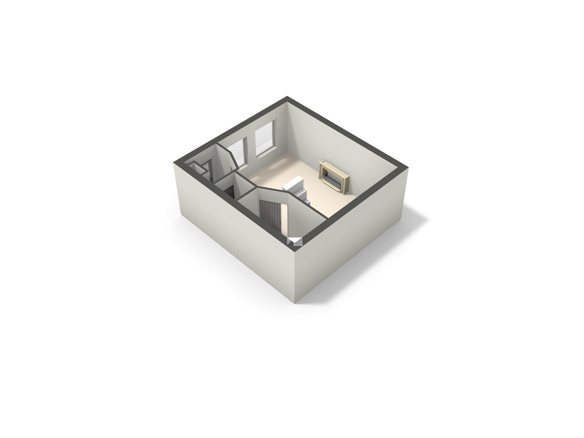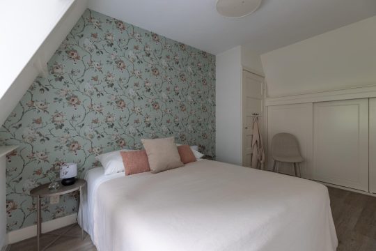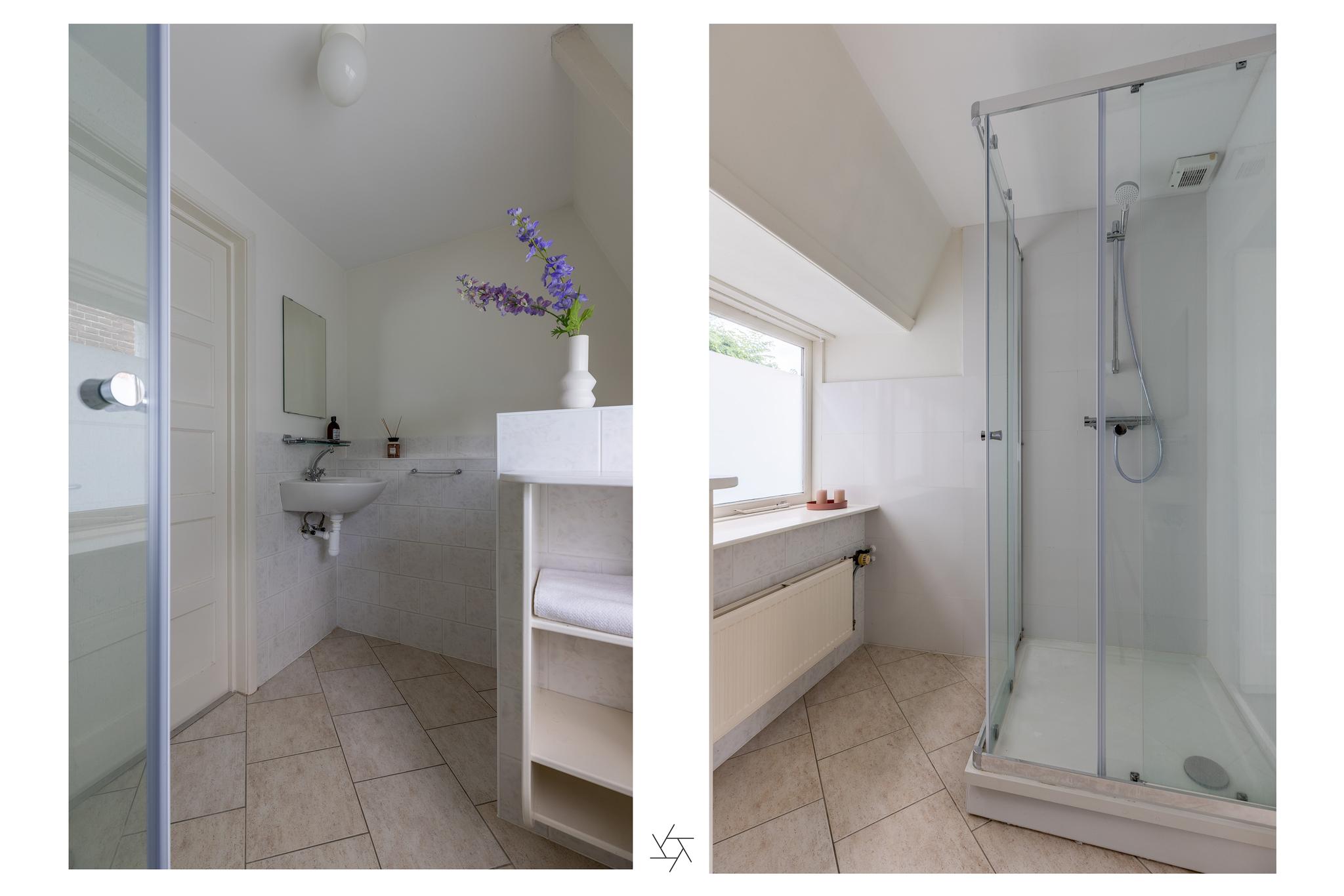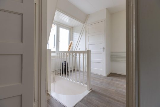 Overloop met CV-/opbergkast en vliering, aan de voorzijde een royale slaapkamer met vaste kasten en de badkamer.