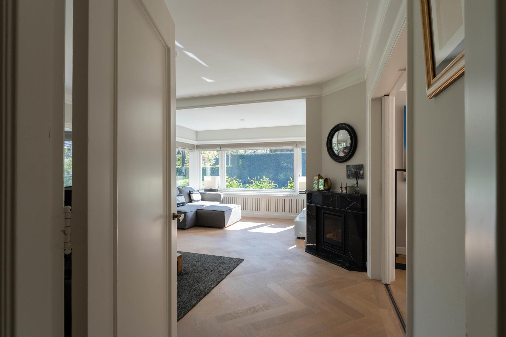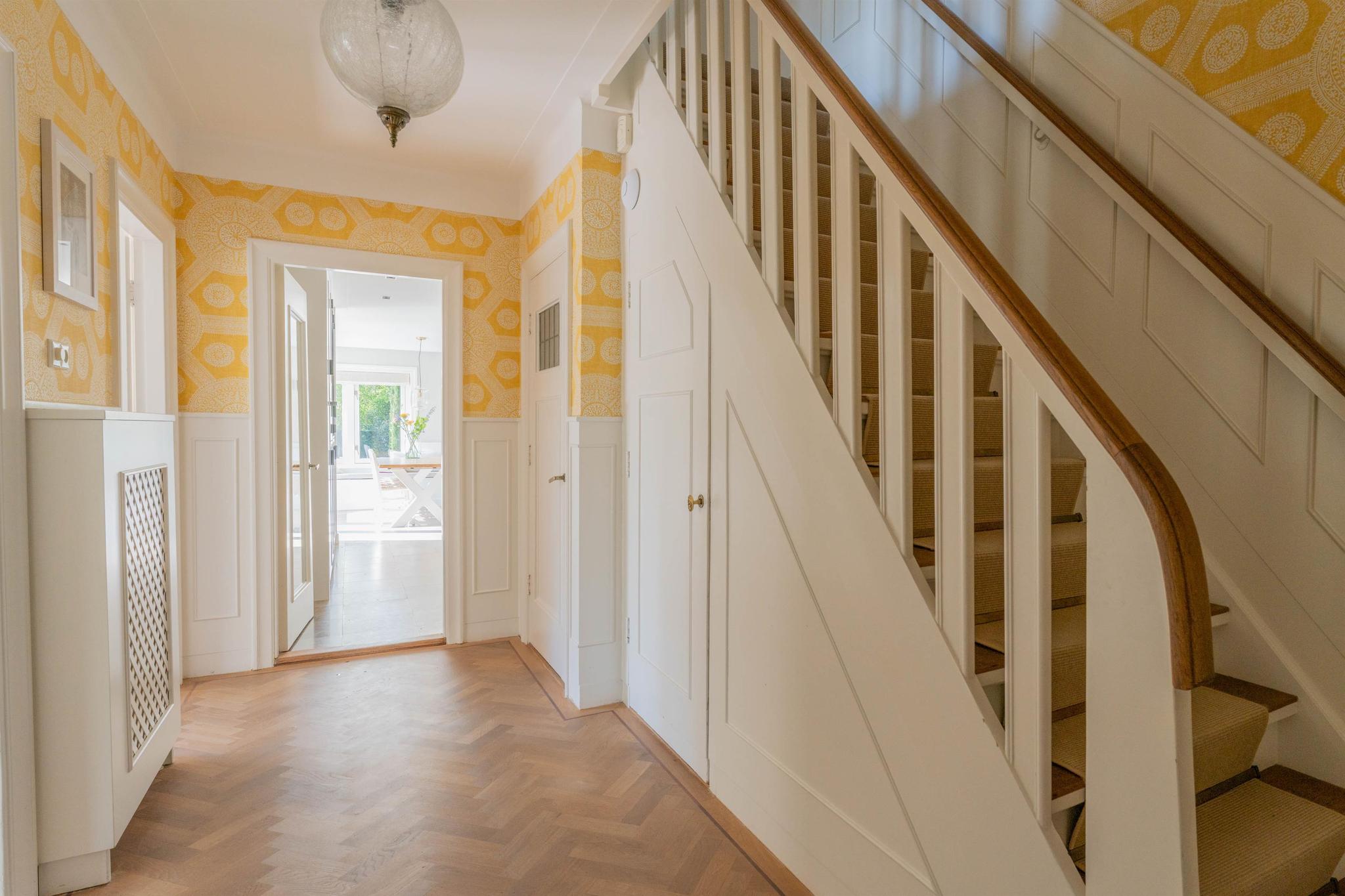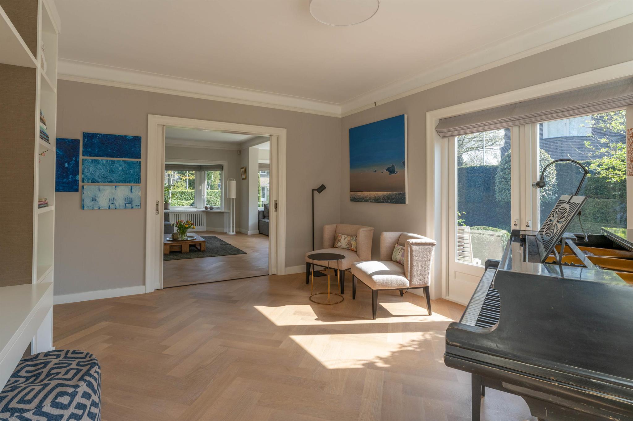Entree, marmeren vestibule met garderobe, hal met fraai trappenhuis met houten lambrisering, modern zwevend toilet met fonteintje, toegang tot de sta-hoge kelder van 31 m² (met meterkast, grote bergruimte, separate was-/stookruimte met wasmachineaansluiting, cv ketel en boiler). De lichte woonkamer met originele en-suite schuifdeuren is voorzien van een lichteiken visgraat parket vloer, een schouw met gashaard en aan de voorzijde een erker. Aan de achterzijde is de speel- annex muziekkamer met openslaande deuren naar het terras. De woonkeuken met eveneens openslaande deuren naar het terras is een heerlijke lichte leefruimte met grote raampartijen en zicht op de tuin. Deze keuken uit december 2021 is voorzien van vloerverwarming, een sfeervolle gashaard, luxe inbouwapparatuur (o.a. inductie kookplaat met down-draft afzuigsysteem, Quooker, stoomoven, koelkast, vriezer, vaatwasser) en eindeloos veel op maat gemaakte kastruimte. De woonkamer en eetkeuken zijn geheel voorzien van radiator ombouwen.