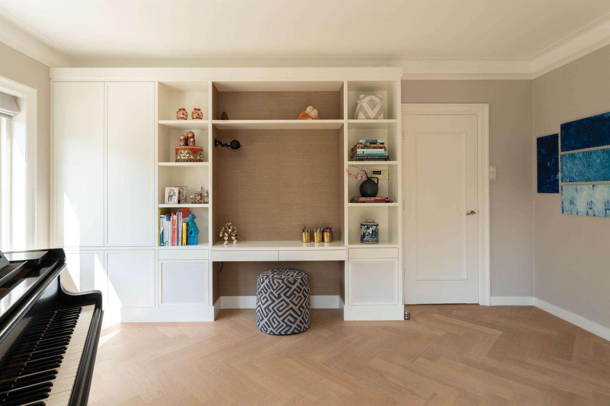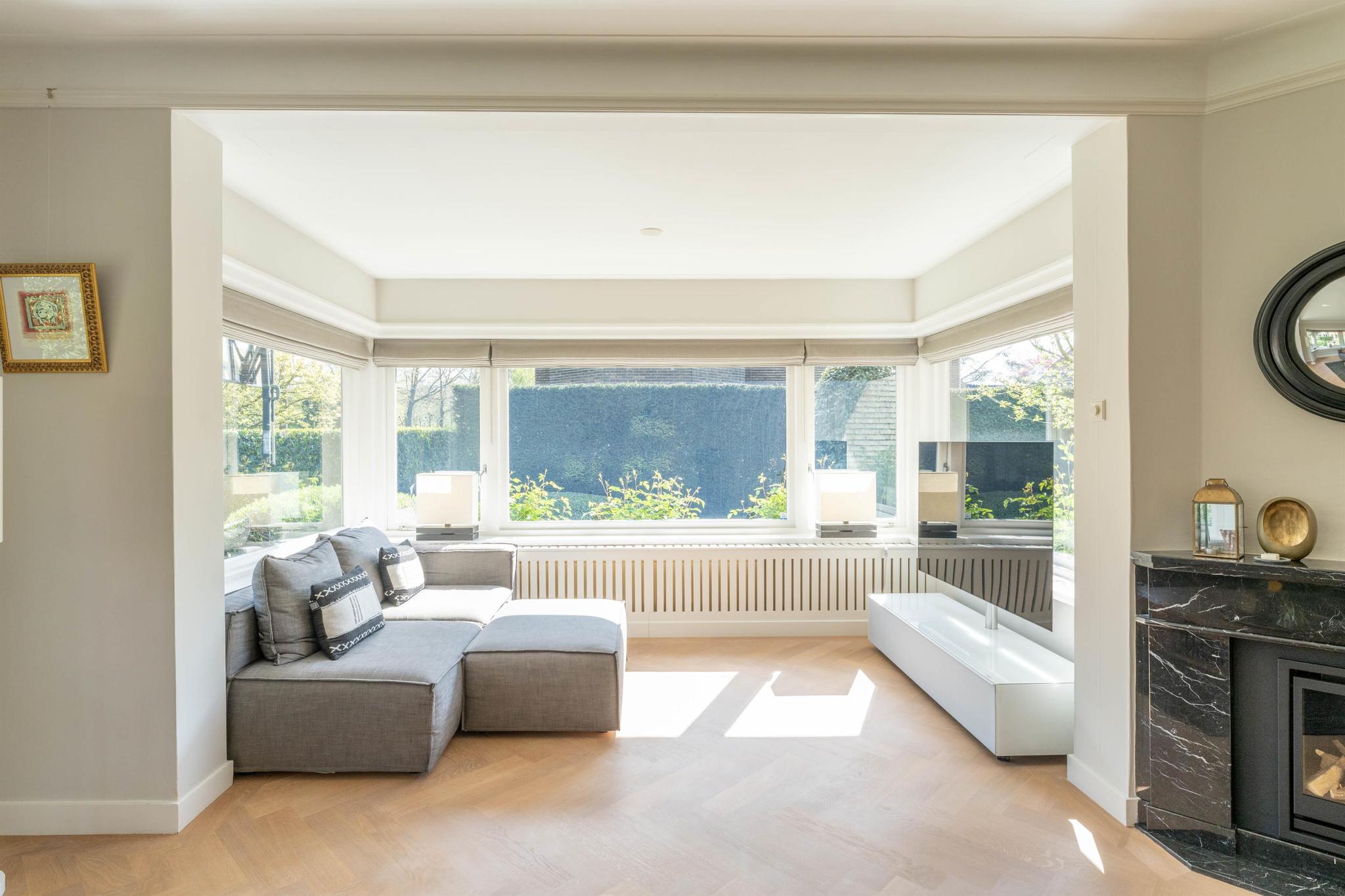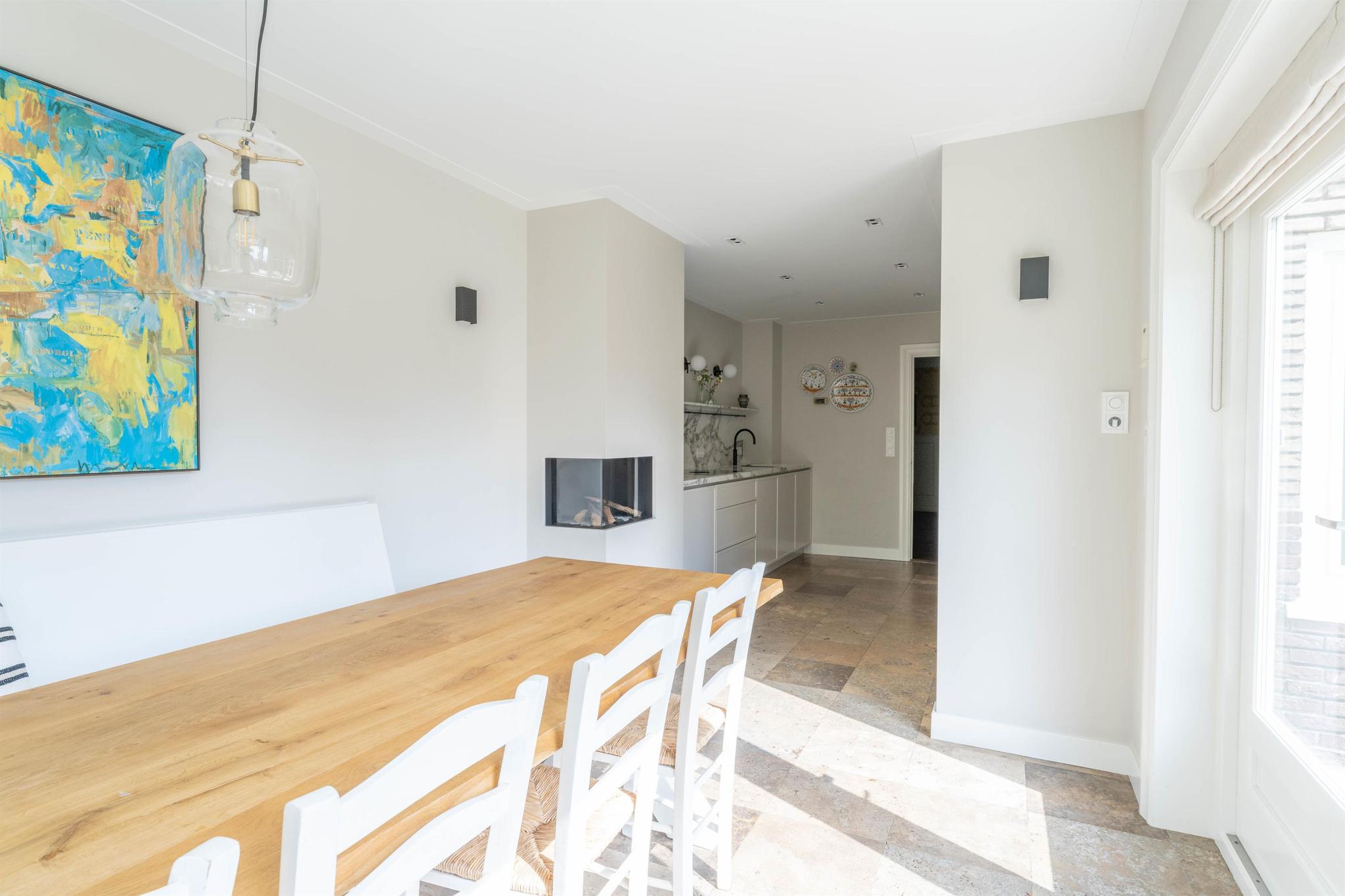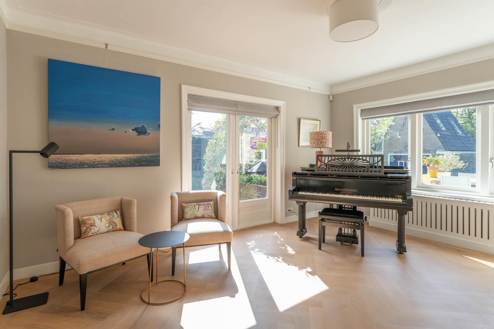 Entree, marmeren vestibule met garderobe, hal met fraai trappenhuis met houten lambrisering, modern zwevend toilet met fonteintje, toegang tot de sta-hoge kelder van 31 m² (met meterkast, grote bergruimte, separate was-/stookruimte met wasmachineaansluiting, cv ketel en boiler). De lichte woonkamer met originele en-suite schuifdeuren is voorzien van een lichteiken visgraat parket vloer, een schouw met gashaard en aan de voorzijde een erker. Aan de achterzijde is de speel- annex muziekkamer met openslaande deuren naar het terras. De woonkeuken met eveneens openslaande deuren naar het terras is een heerlijke lichte leefruimte met grote raampartijen en zicht op de tuin. Deze keuken uit december 2021 is voorzien van vloerverwarming, een sfeervolle gashaard, luxe inbouwapparatuur (o.a. inductie kookplaat met down-draft afzuigsysteem, Quooker, stoomoven, koelkast, vriezer, vaatwasser) en eindeloos veel op maat gemaakte kastruimte. De woonkamer en eetkeuken zijn geheel voorzien van radiator ombouwen.