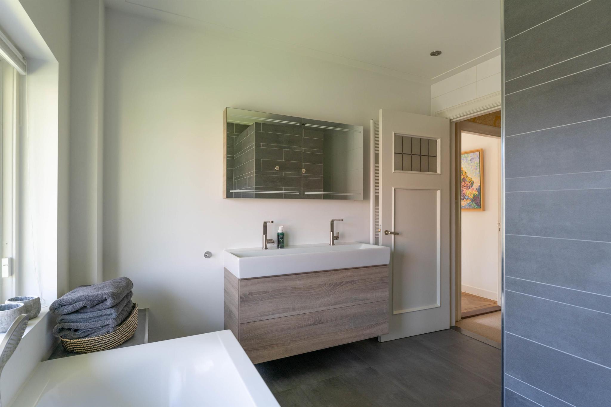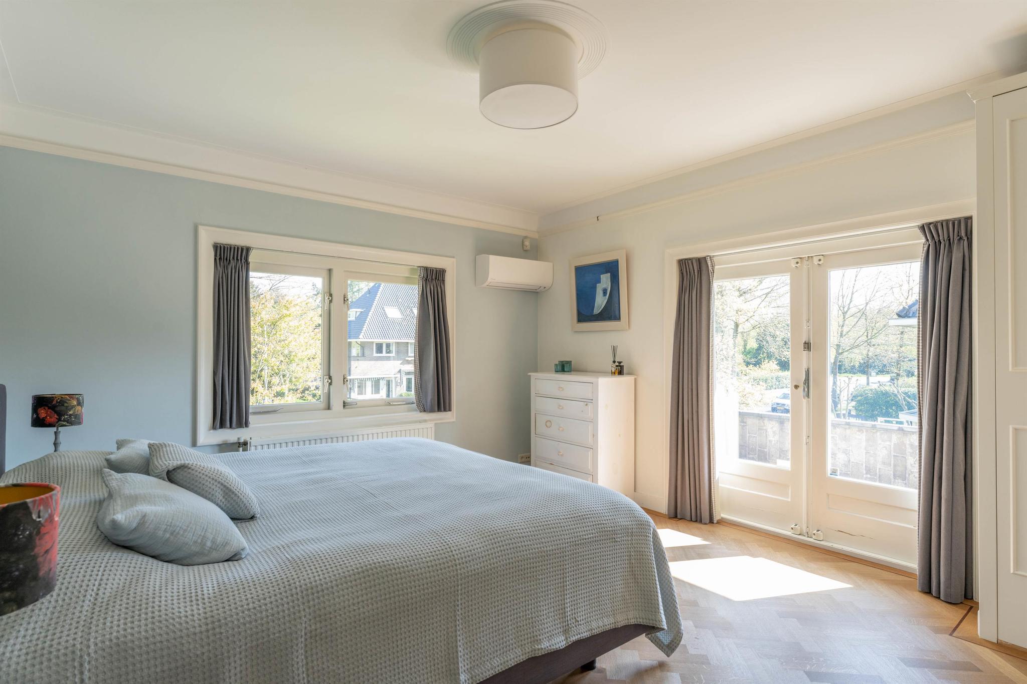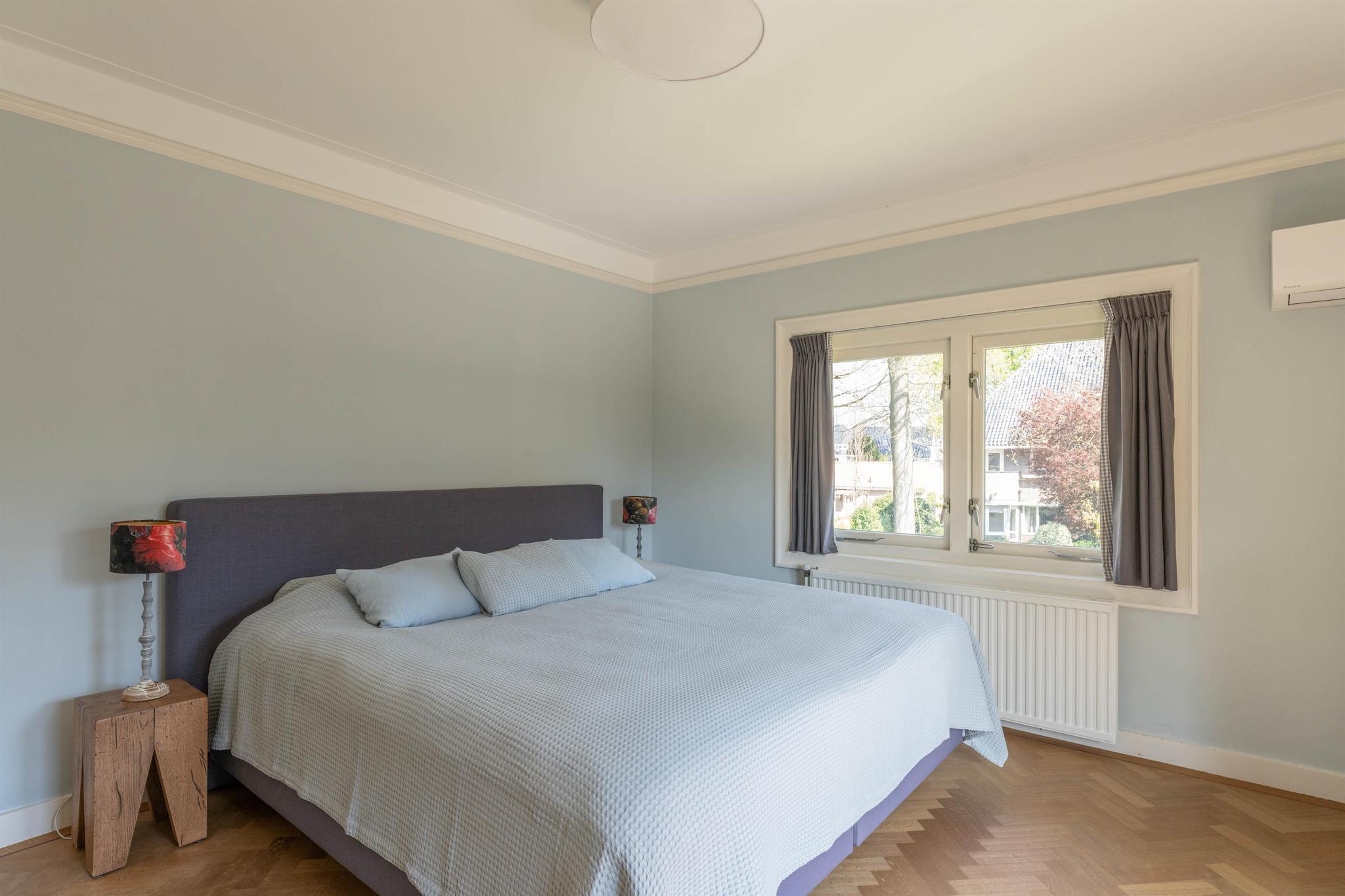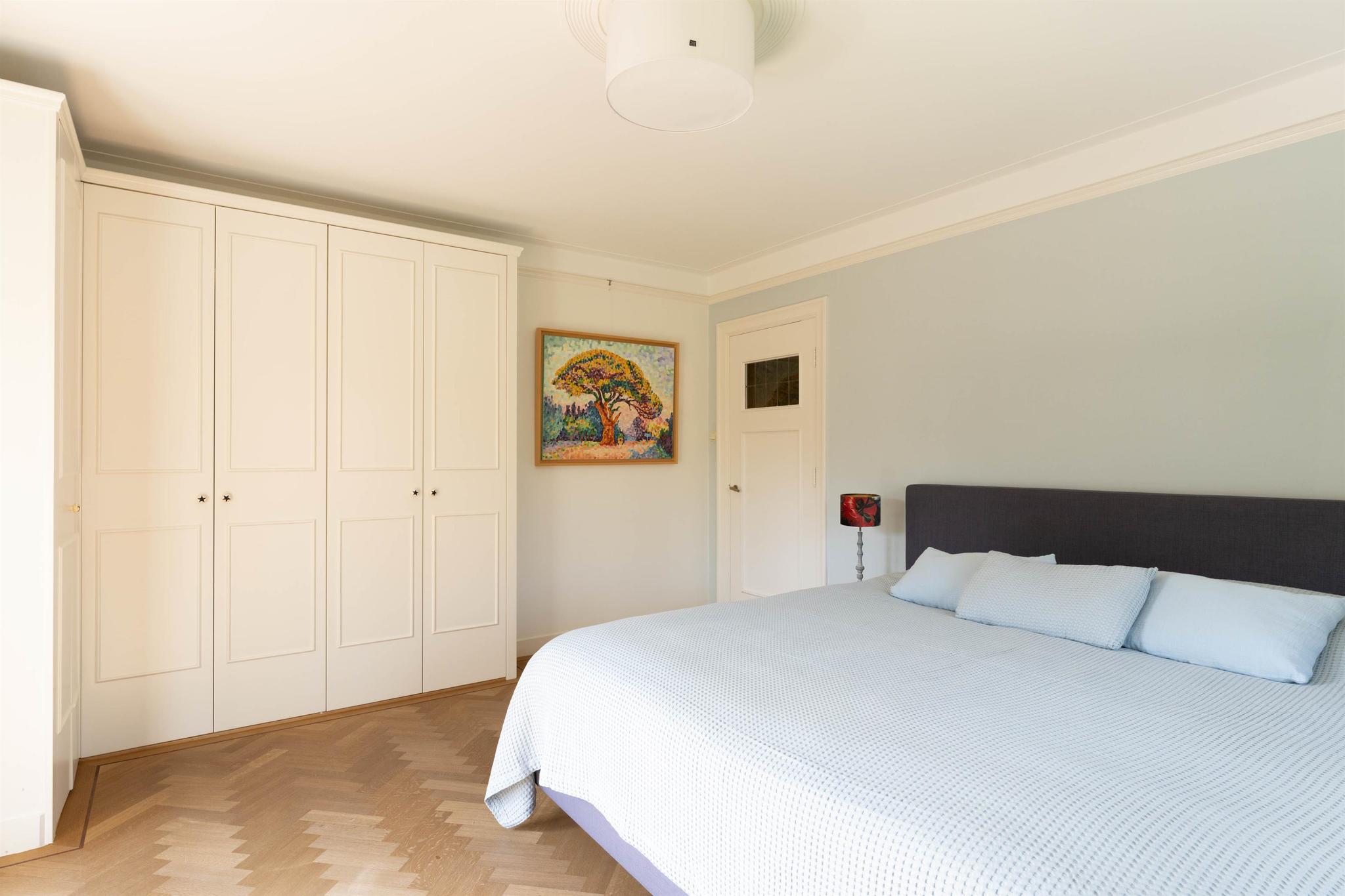 Overloop met houten lambrisering en trap naar de tweede verdieping, ruime moderne badkamer voorzien van vloerverwarming, ligbad, separate inloopdouche, hangend toilet, dubbel wastafelmeubel en handdoekradiator. Masterbedroom aan de voorzijde met airconditioning, vaste kasten en openslaande deuren naar het balkon, tweede ruime slaap-/werkkamer aan de achterzijde eveneens met vaste kasten en een derde slaapkamer.