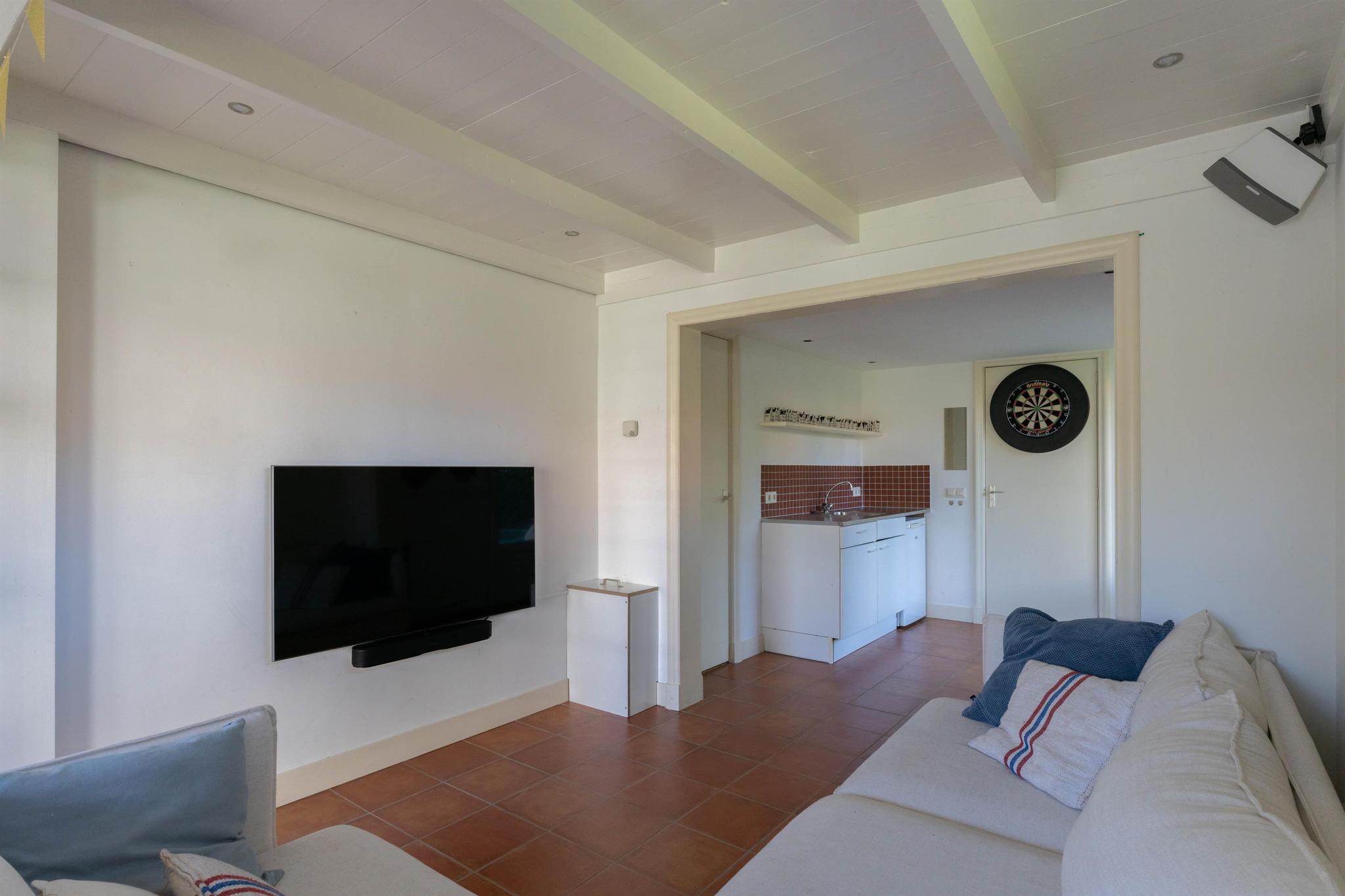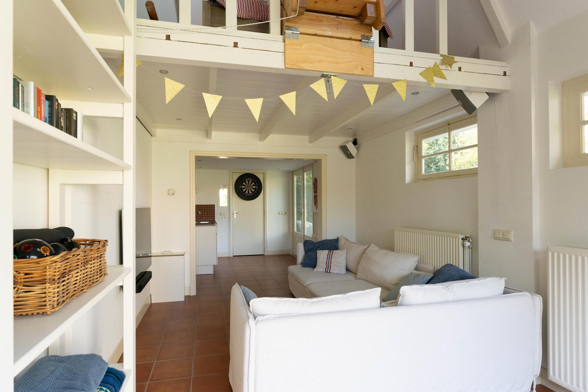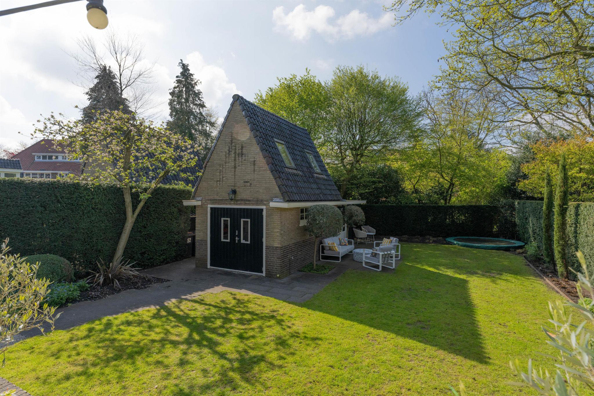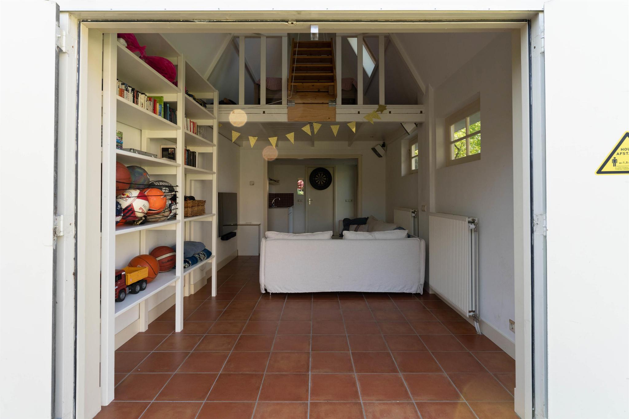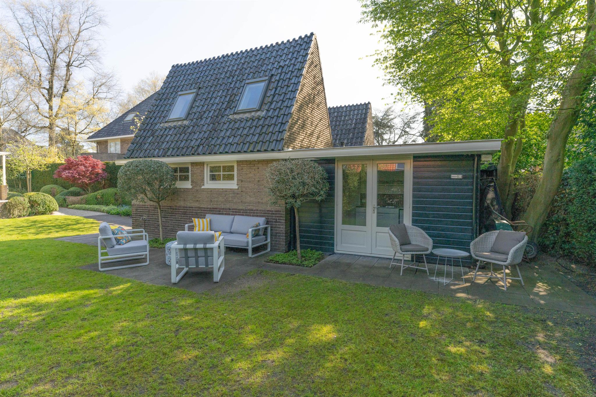 De voormalige vrijstaande garage is omgebouwd tot een multifunctioneel gebouw. Het is volledig geïsoleerd en heeft een eigen cv ketel. Het bestaat uit een ruime zit-/werkkamer met trap naar de slaapvide met dakramen, keukentje met cv kast en openslaande deuren naar de tuin, badkamer met douche en toilet.