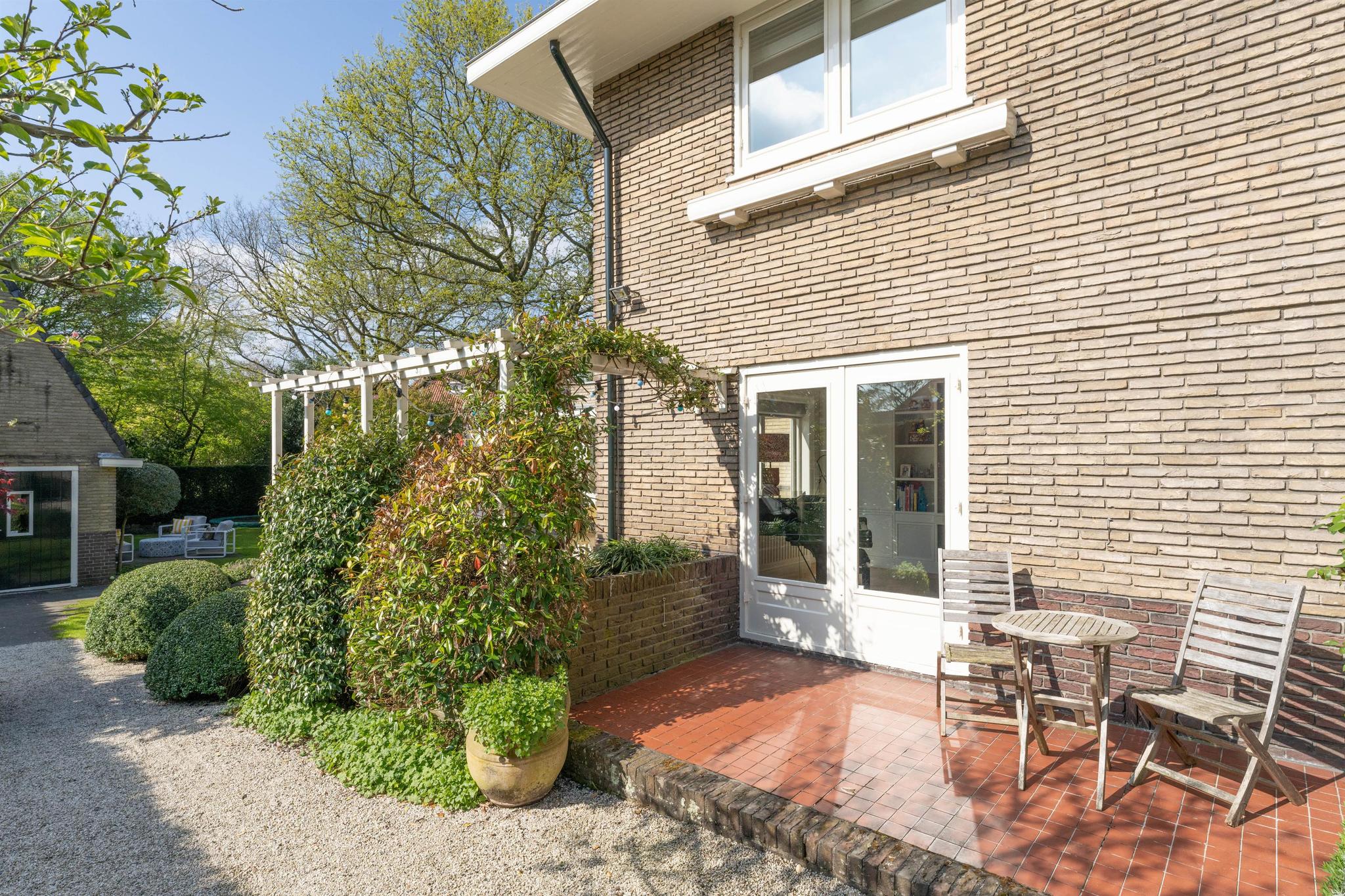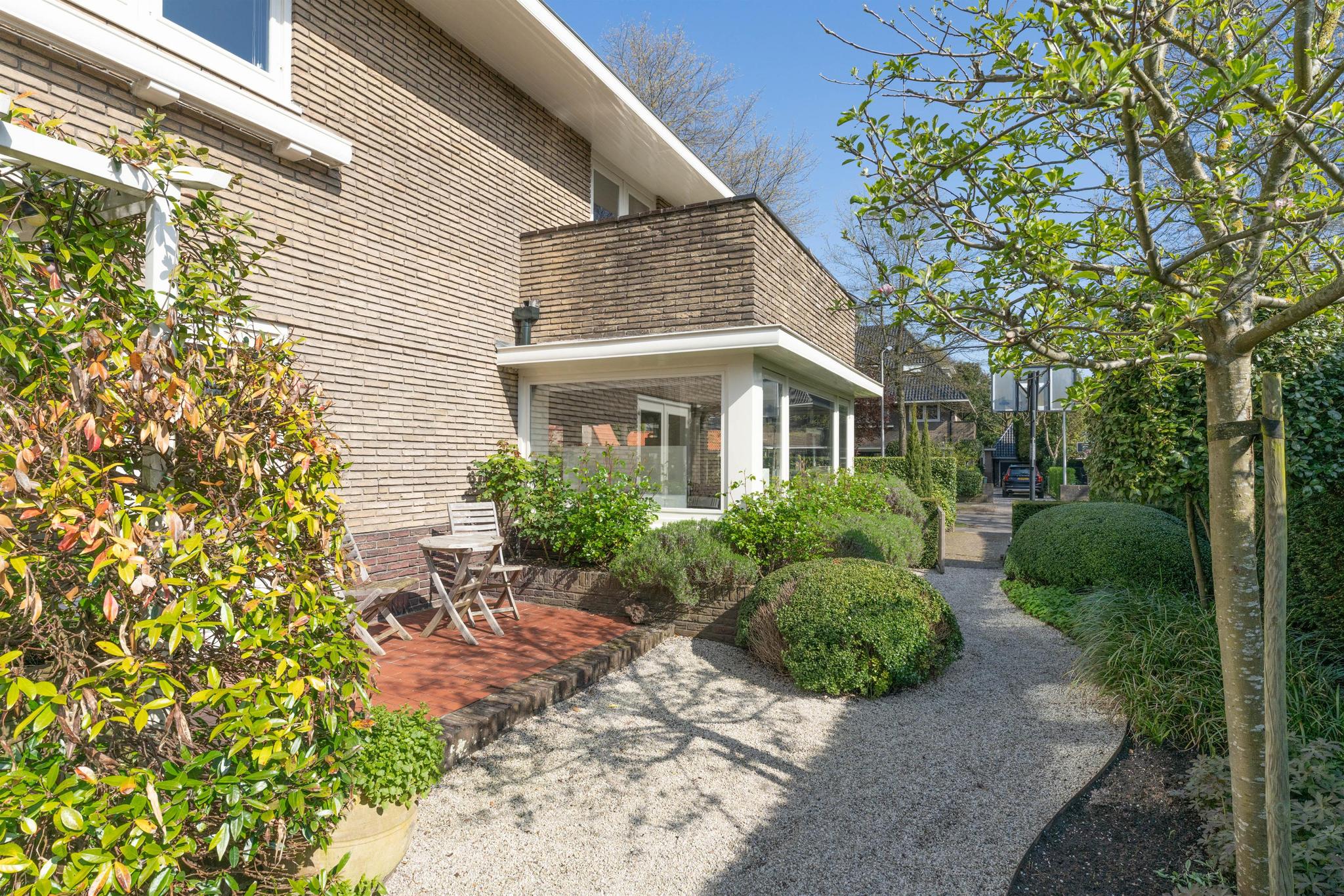 Prachtig aangelegde voor-, zij- en achtertuin met rondom tuinverlichting en voorzien van een sproeisysteem. Parkeerplaats op eigen terrein met laadpaal (ter overname) voor een elektrische auto aan de voorzijde. De diepe achtertuin ligt op het zuiden en biedt veel privacy. Het heerlijk zonnige terras is zowel vanuit de woonkamer als de woonkeuken toegankelijk. Het guesthouse van 27 m² achter in de tuin heeft nog een aangebouwde houten fietsenberging en opstelplaats voor de kliko’s uit het zicht.