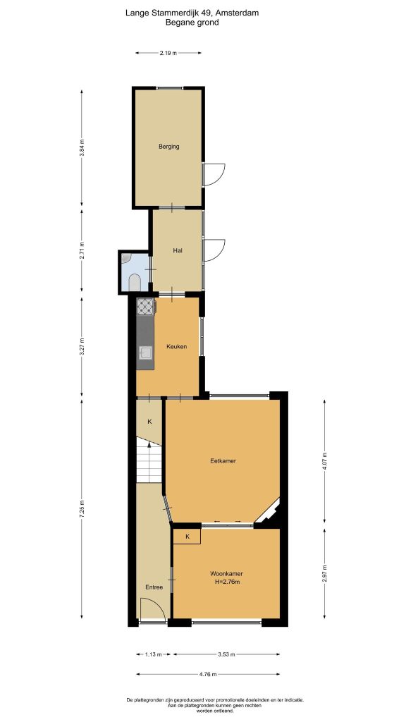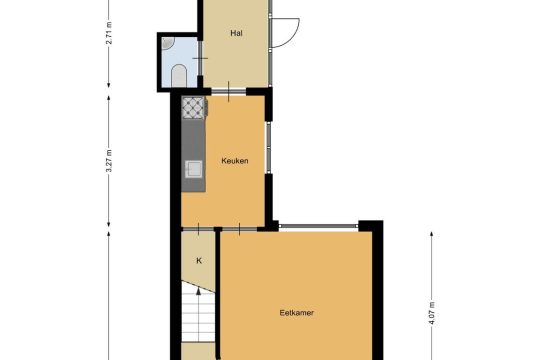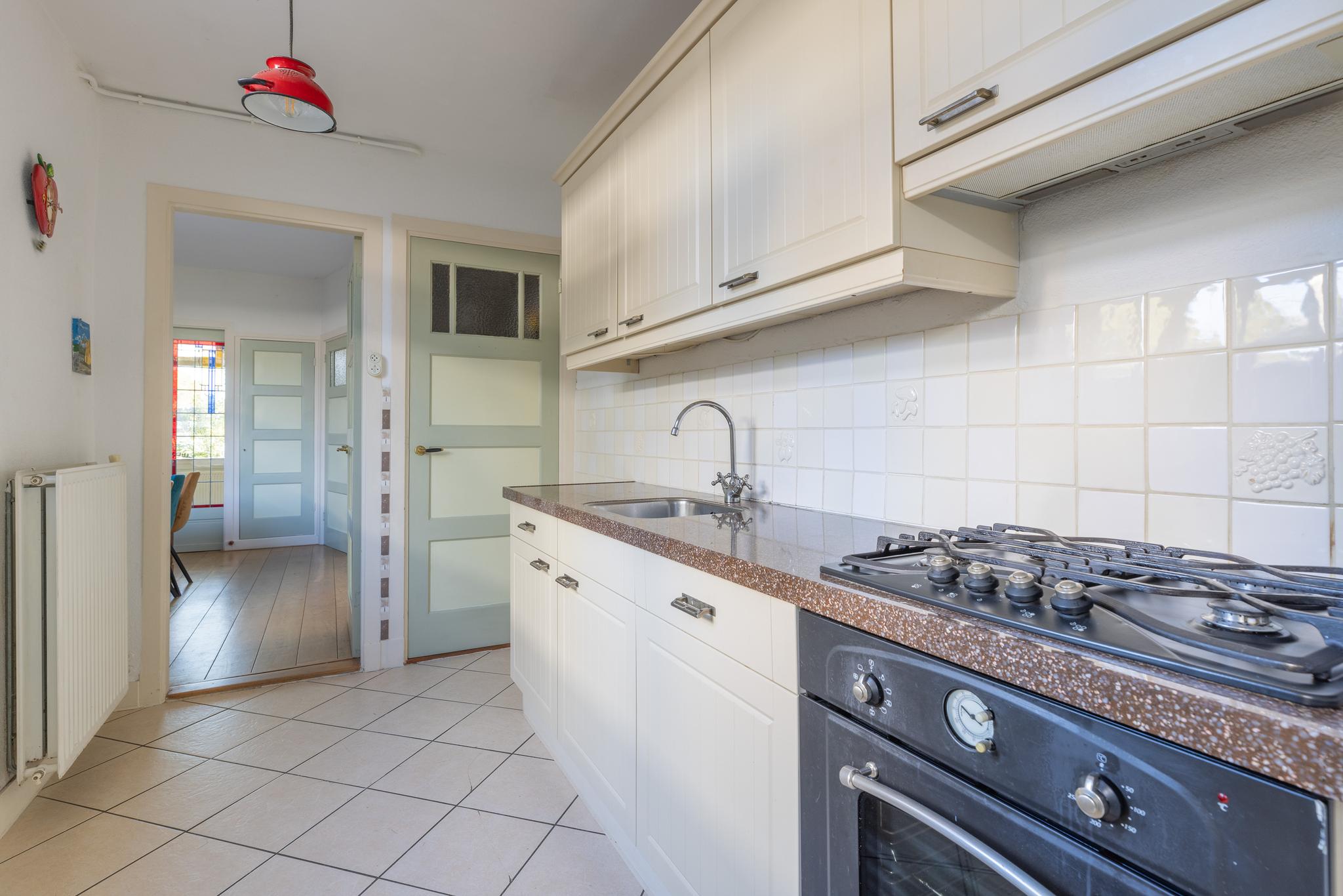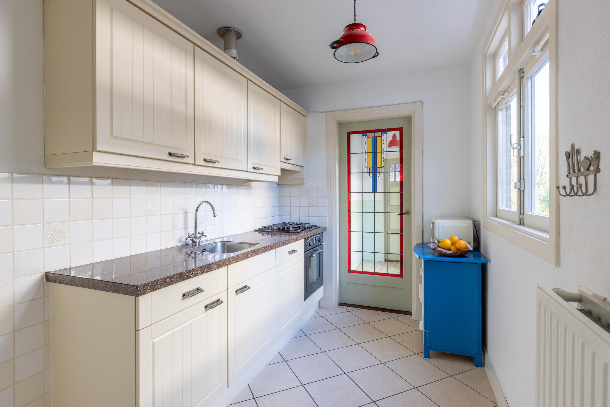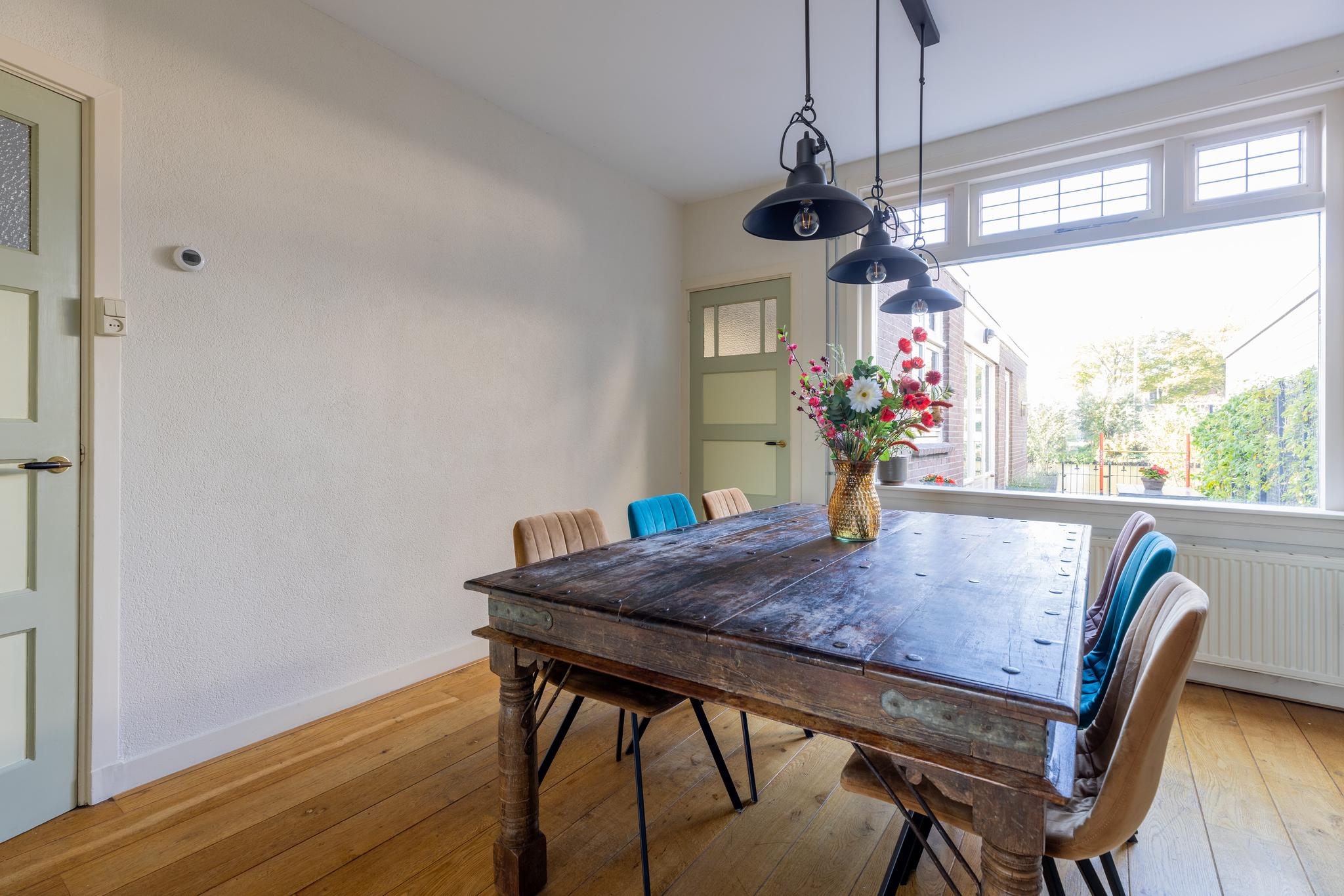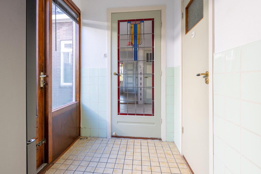 Entree, lange hal met twee deuren die toegang geven naar de voor- en achterkamer. De en-suite woonkamer beschikt over mooie glas in lood schuifdeuren met ingebouwde kast, ook is er nog een prachtige schouw. In de uitbouw bevindt zich de keuken met natuurstenen aanrechtblad met de volgende inbouwapparatuur: 4-pitsgaskookplaat, afzuigkap en vaatwasser. Onder de trap zit nog een praktische berging/voorraadkast. Iets verder bevindt zich nog een hal/bijkeuken, hier is ook het toilet met fontein. Verder loop je hier de tuin in of je loopt door naar de aangebouwde berging.