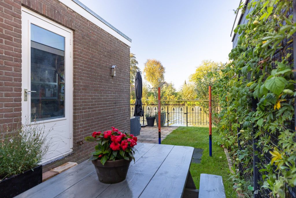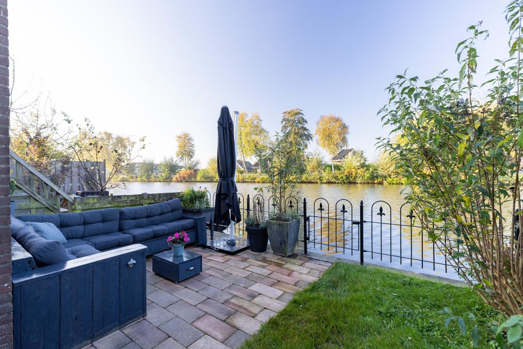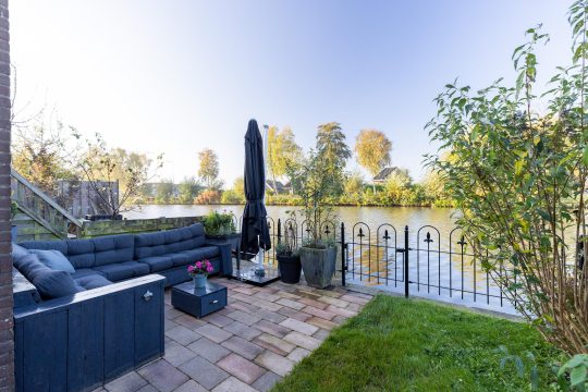 De achtertuin van de woning heeft een terras op het zonnige zuidwesten met eigen aanlegsteiger voor een boot, wat met name in de zomermaanden een zalig vakantiegevoel geeft. Uitkijken over het water en de voorbij varende boten, af en toe een frisse duik vanaf je eigen terras, of zelf met de boot erop uit richting Weesp, Muiden via de Vecht, Abcoude via het Gein en Amsterdam via de Weespertrekvaart.