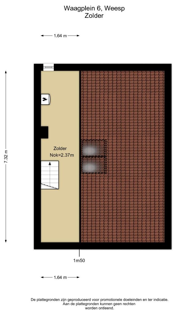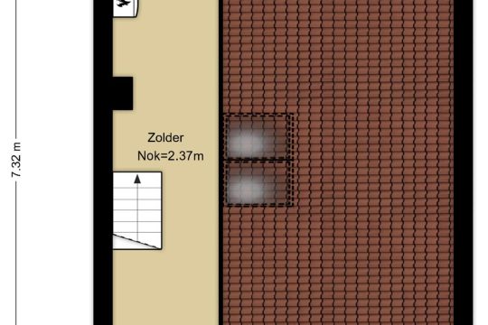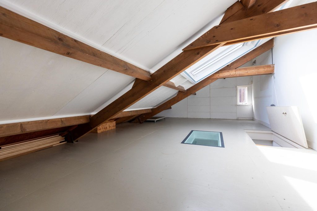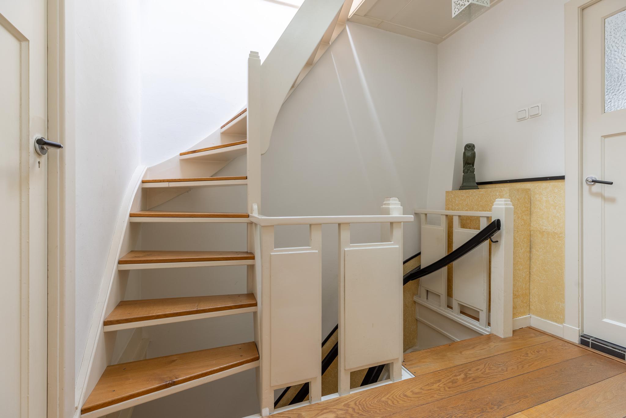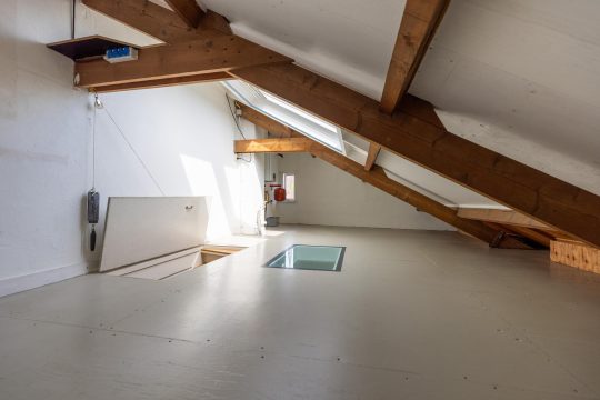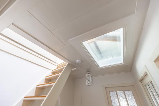 Vanaf de overloop de vaste trap naar de tweede verdieping, die ook met een luik is af te sluiten. Op deze verdieping bevindt zich de CV-ketel en is er veel lichtinval door de twee grote dakramen. De hoogte van de nok is 2.37 m.