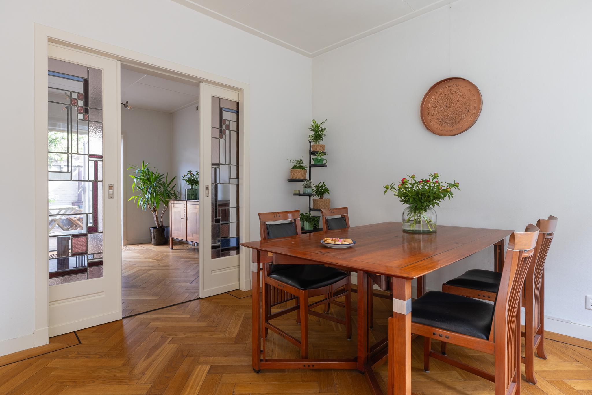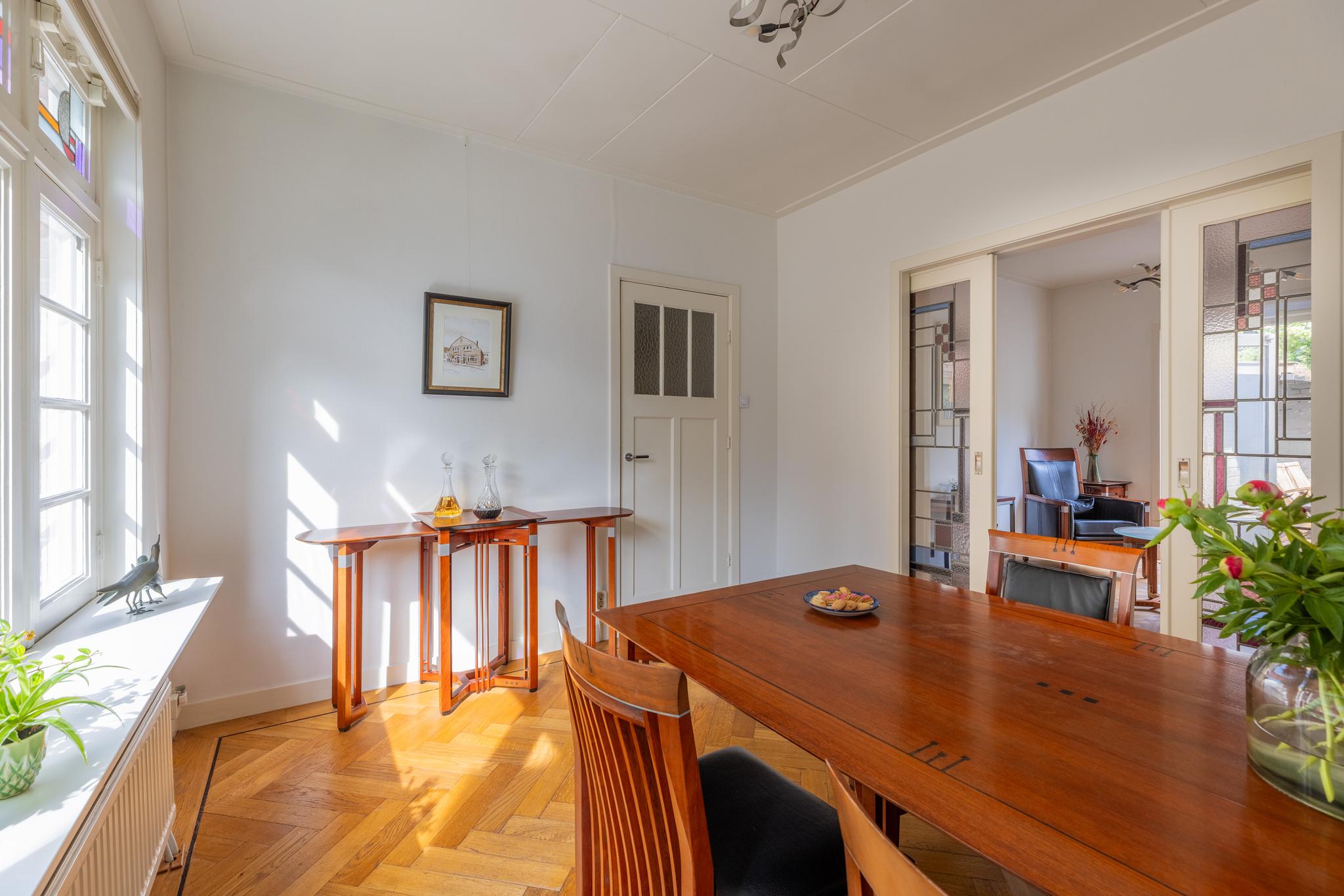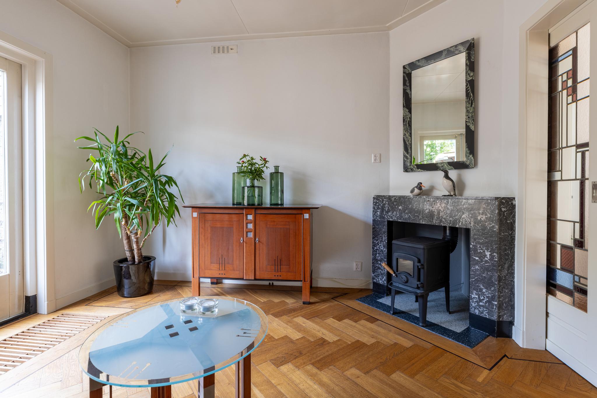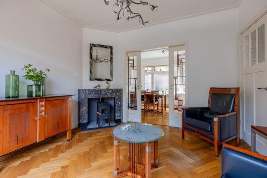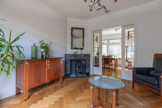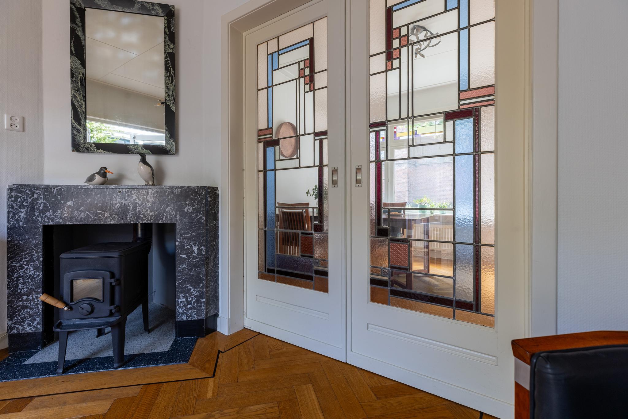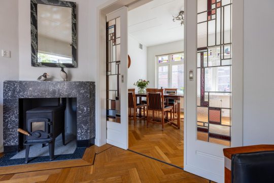 Overdekt entree, vestibule met de meterkast, hal, toilet en ruime trapkast. Vanuit de hal kan je via twee deuren de woon-/eetkamer inlopen. De woon-/eetkamer is met prachtige glas in lood schuifdeuren af te sluiten. Aan de voorzijde beschikken de ramen ook nog over een prachtige glas in lood ramen en aan de achterzijde bevindt zich een houtkachel en de openslaande deuren naar de tuin. De woon/-eetkamer heeft nog het originele plafond, heeft een hardstenen (originele) schouw en de vloer is voorzien van een parketvloer met visgraad en bies.