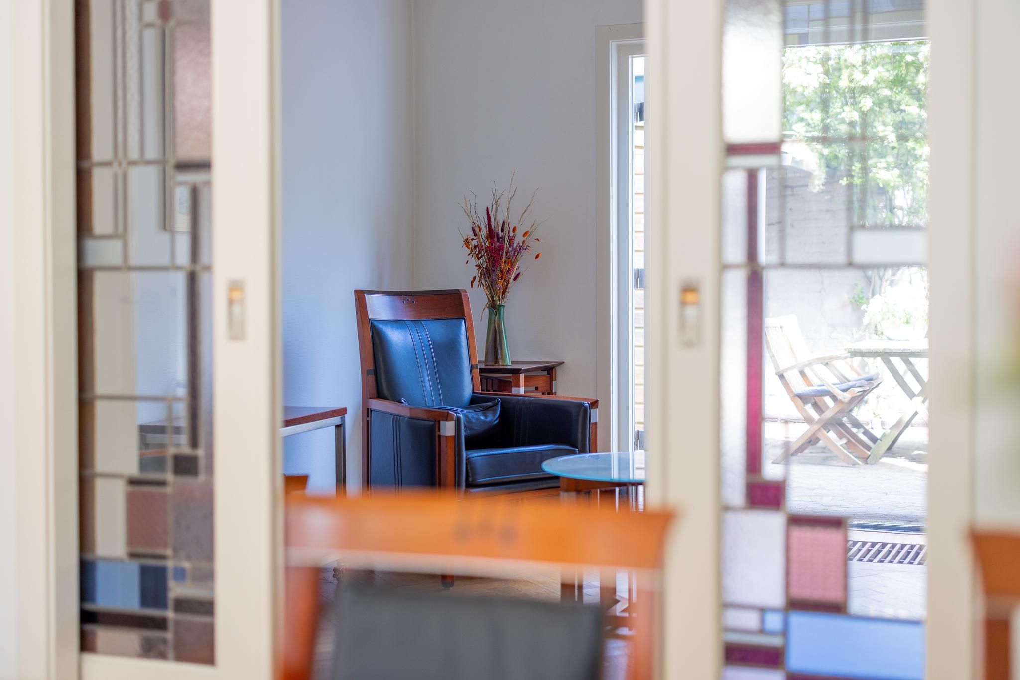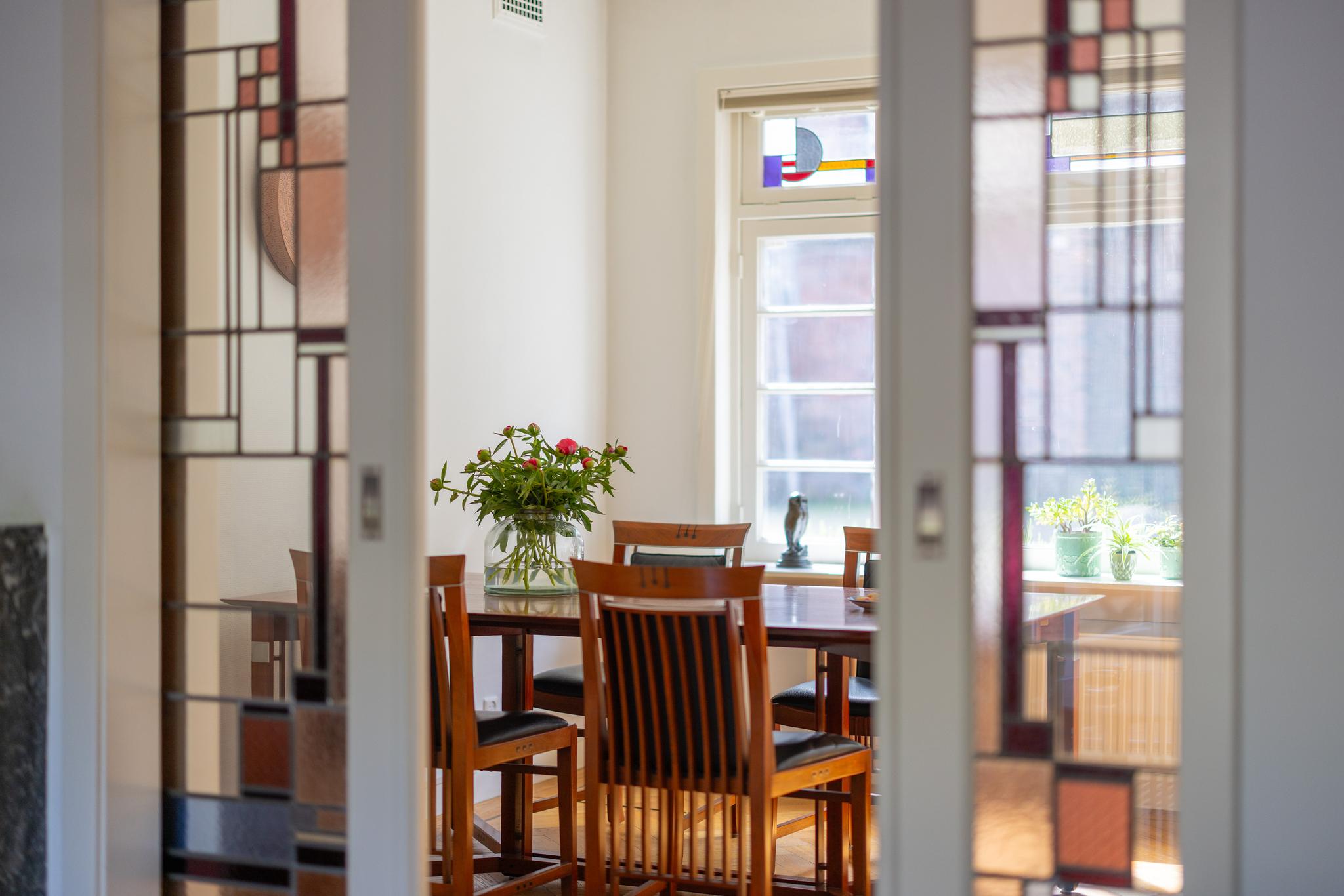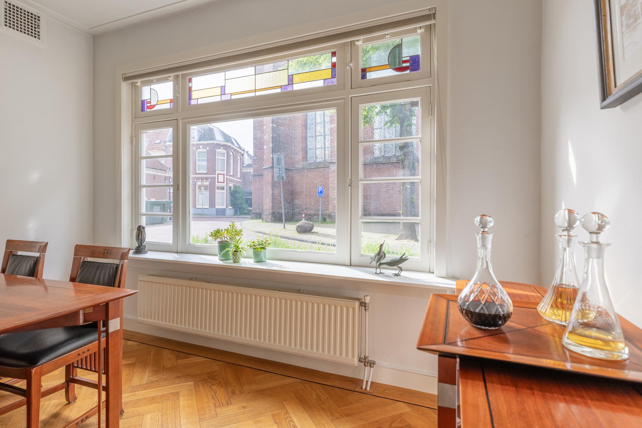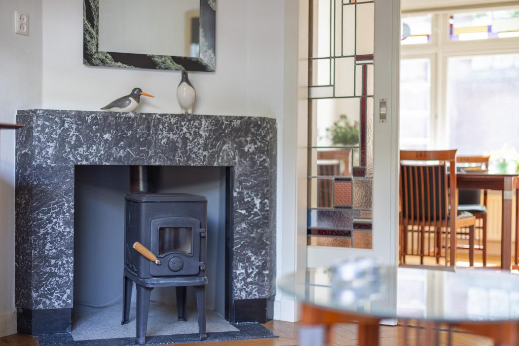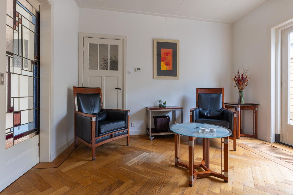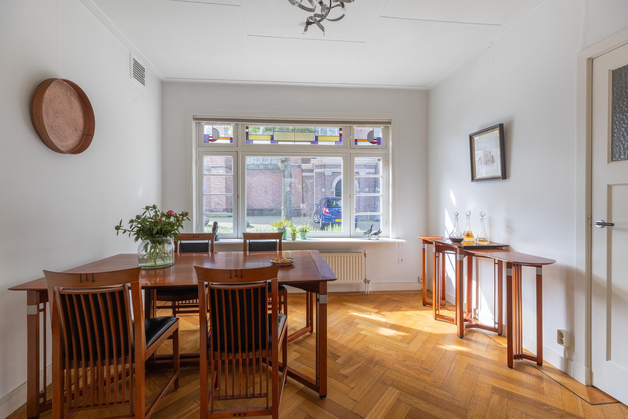 Overdekt entree, vestibule met de meterkast, hal, toilet en ruime trapkast. Vanuit de hal kan je via twee deuren de woon-/eetkamer inlopen. De woon-/eetkamer is met prachtige glas in lood schuifdeuren af te sluiten. Aan de voorzijde beschikken de ramen ook nog over een prachtige glas in lood ramen en aan de achterzijde bevindt zich een houtkachel en de openslaande deuren naar de tuin. De woon/-eetkamer heeft nog het originele plafond, heeft een hardstenen (originele) schouw en de vloer is voorzien van een parketvloer met visgraad en bies.
