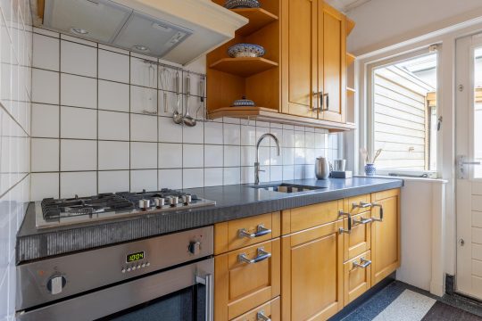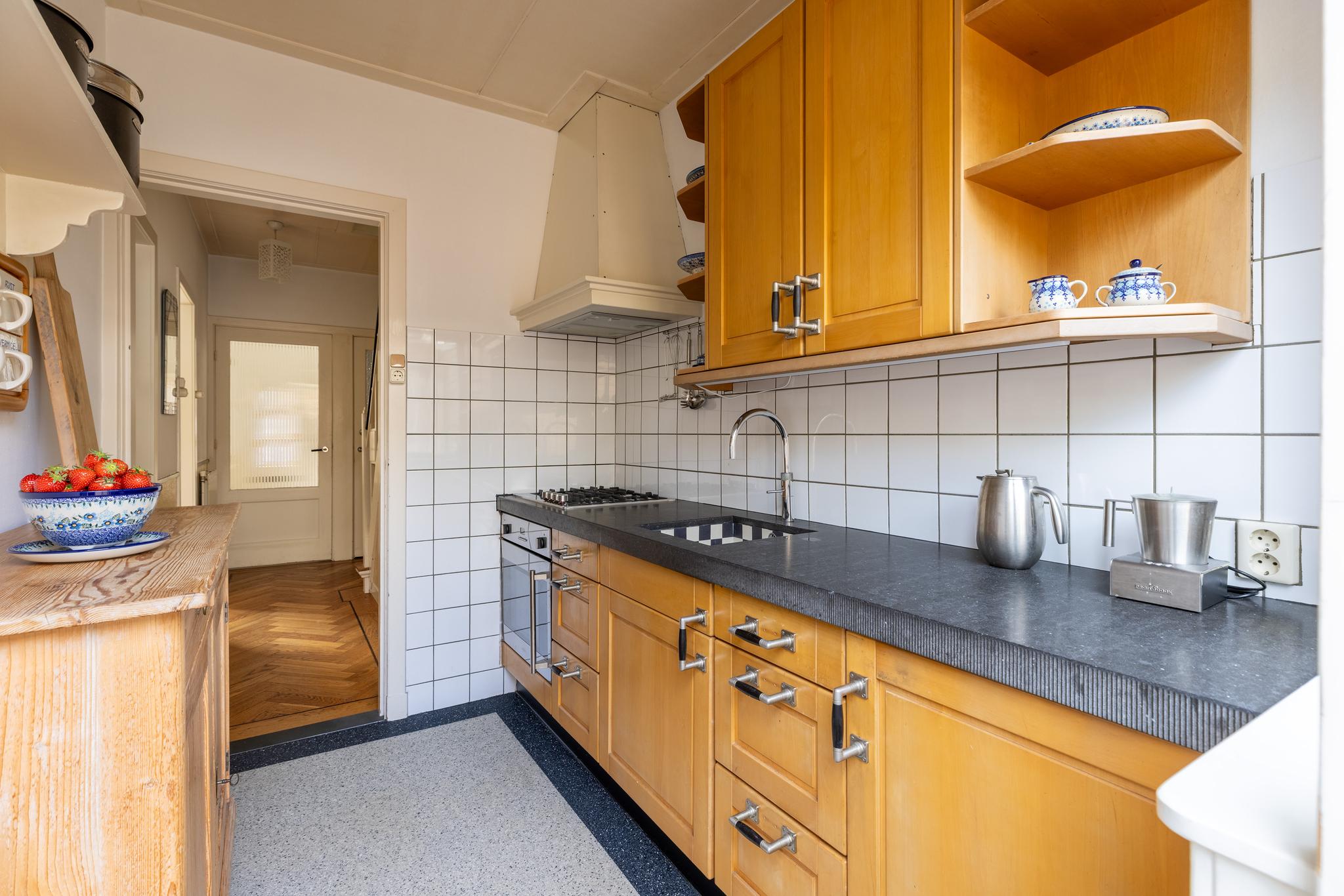 Dichte keuken met prachtige vloer, inbouwapparatuur (4-pitsgaskookplaat, afzuigkap, kokend waterkraan, koelkast en oven), een ingebouwd kruidenrek (origineel) en de deur naar de achtertuin.