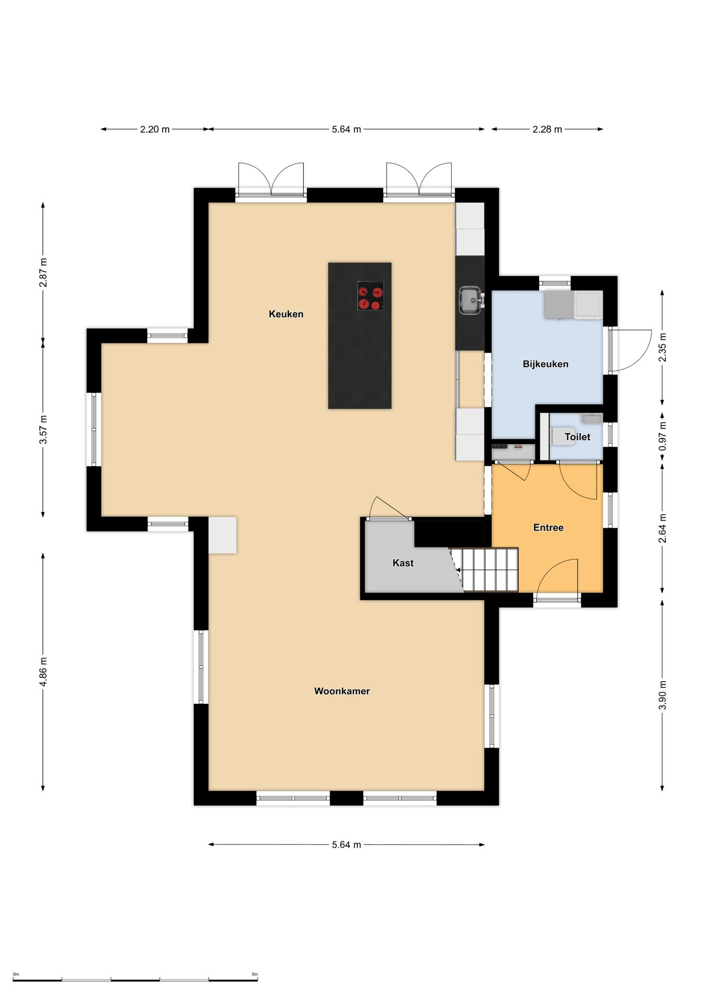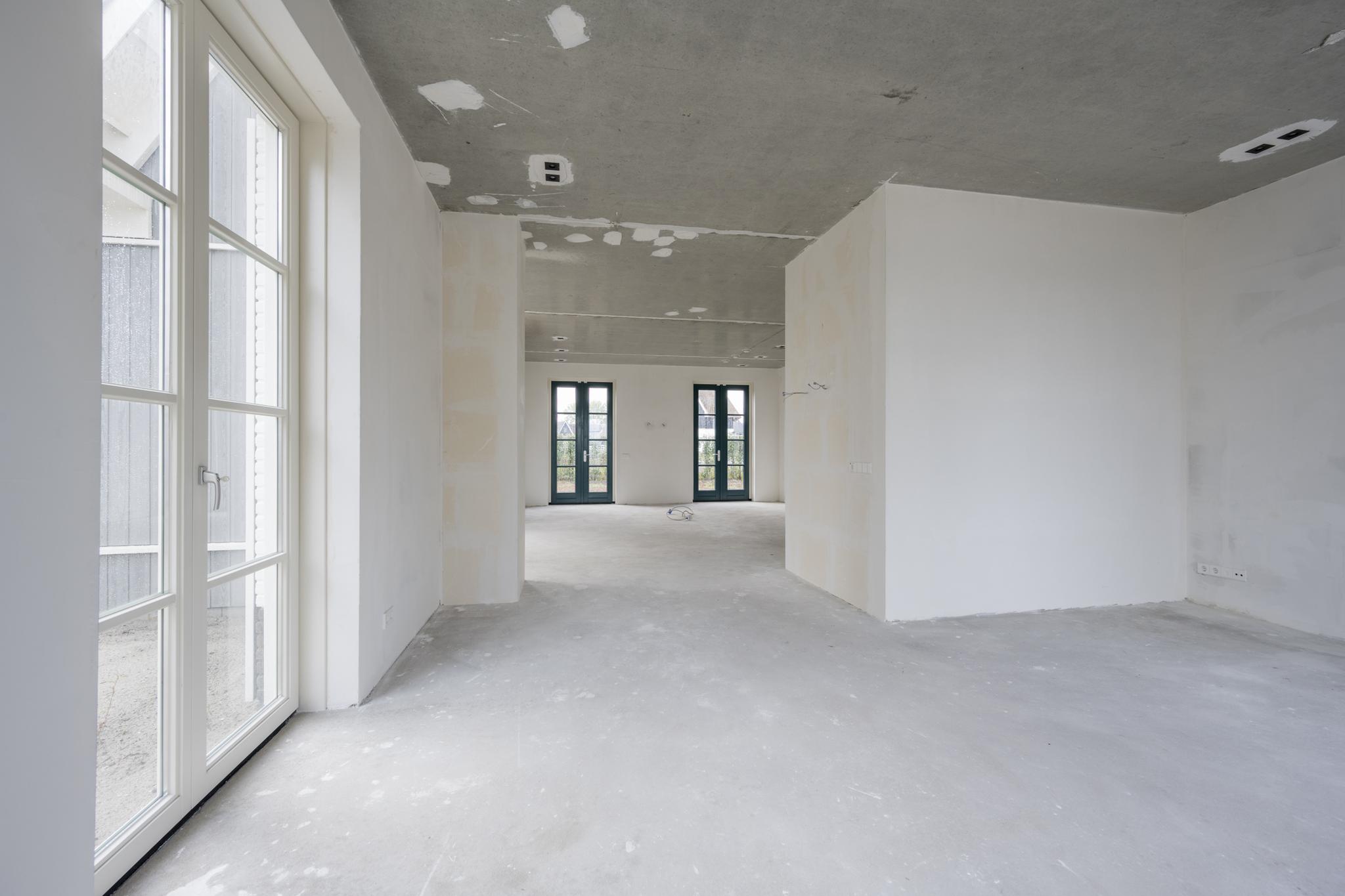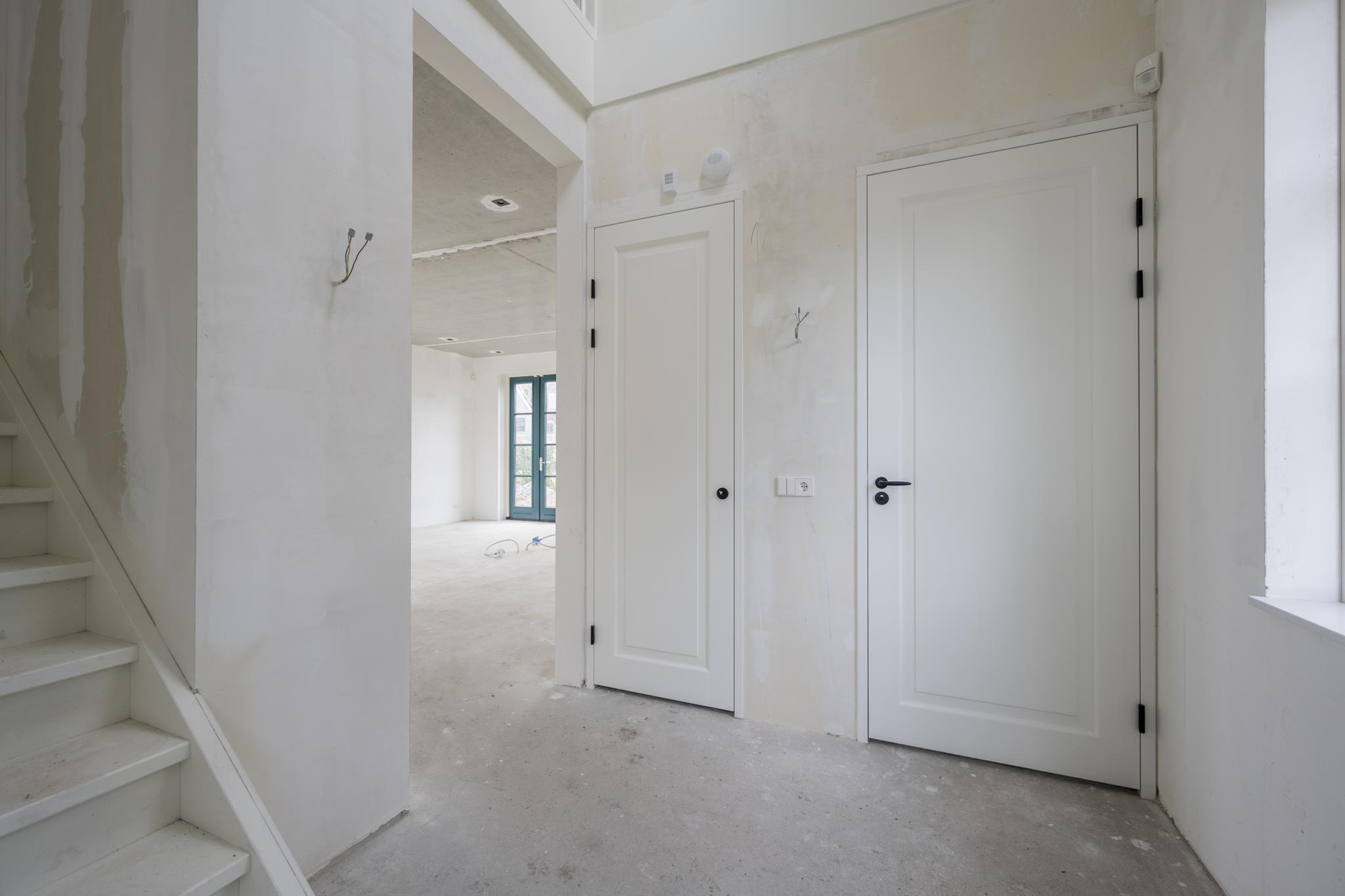 Ruim entree, hal, meterkast, vrijhangend toilet met fontein, royale woon-/eetkamer van circa 75 m² met erker en maar liefst zes dubbele deuren naar voor-, zij en achtertuin, trapkast en toegang tot de bijkeuken.
